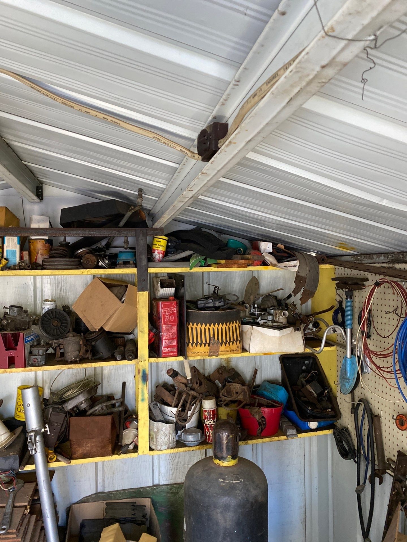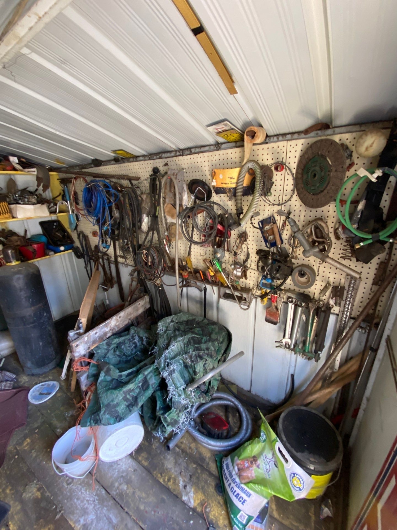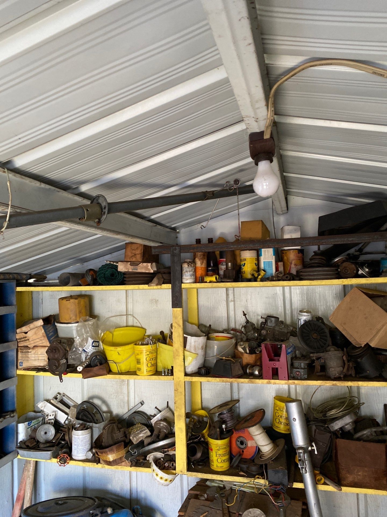 Shed contents all contents on right side of wall back shelving all contents, and left side of shed a