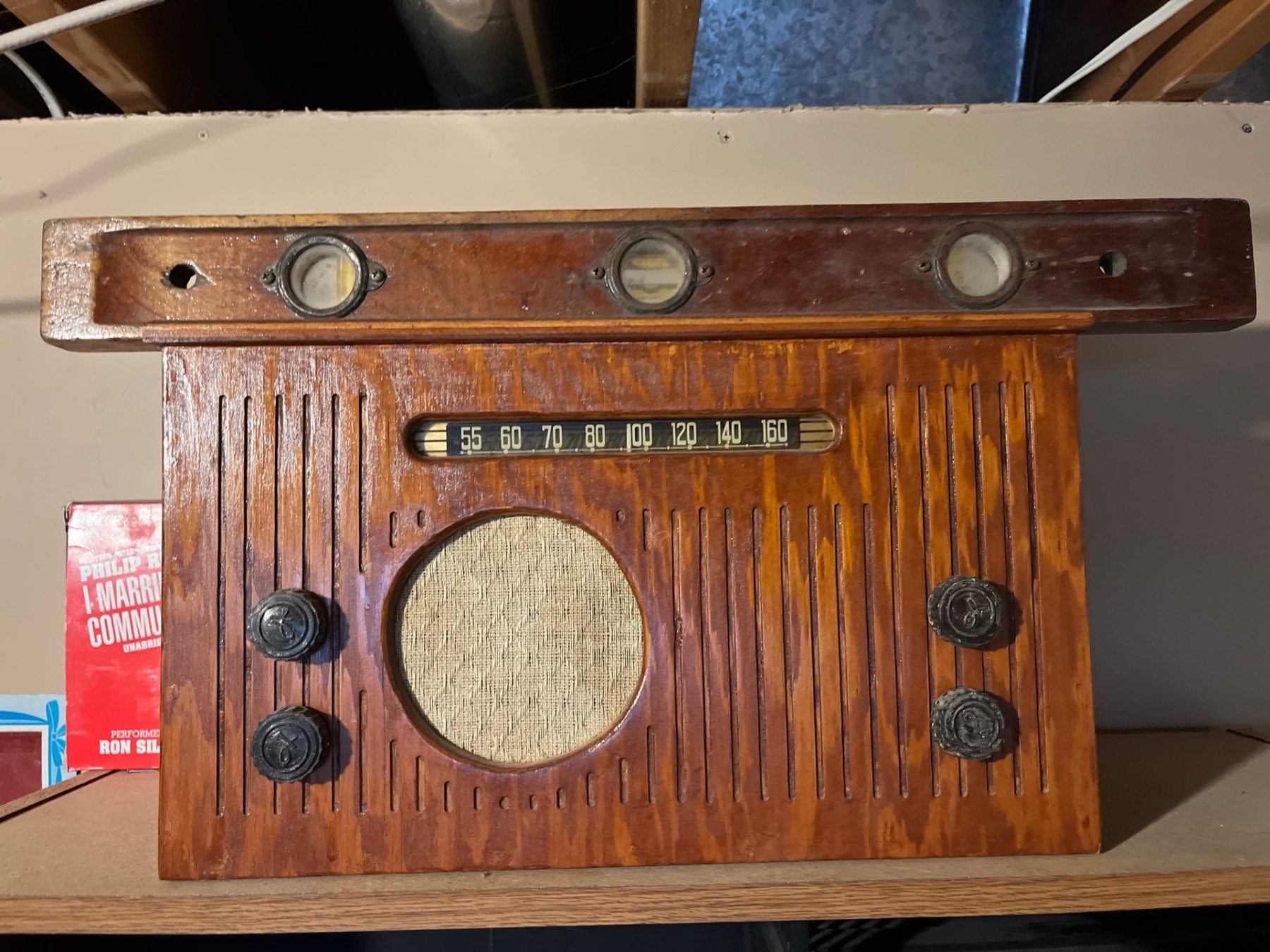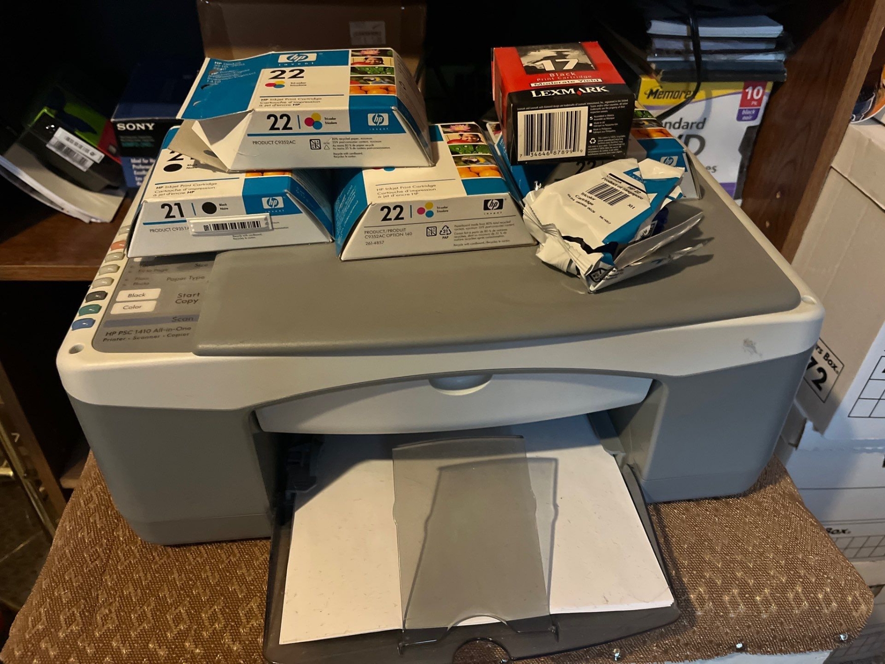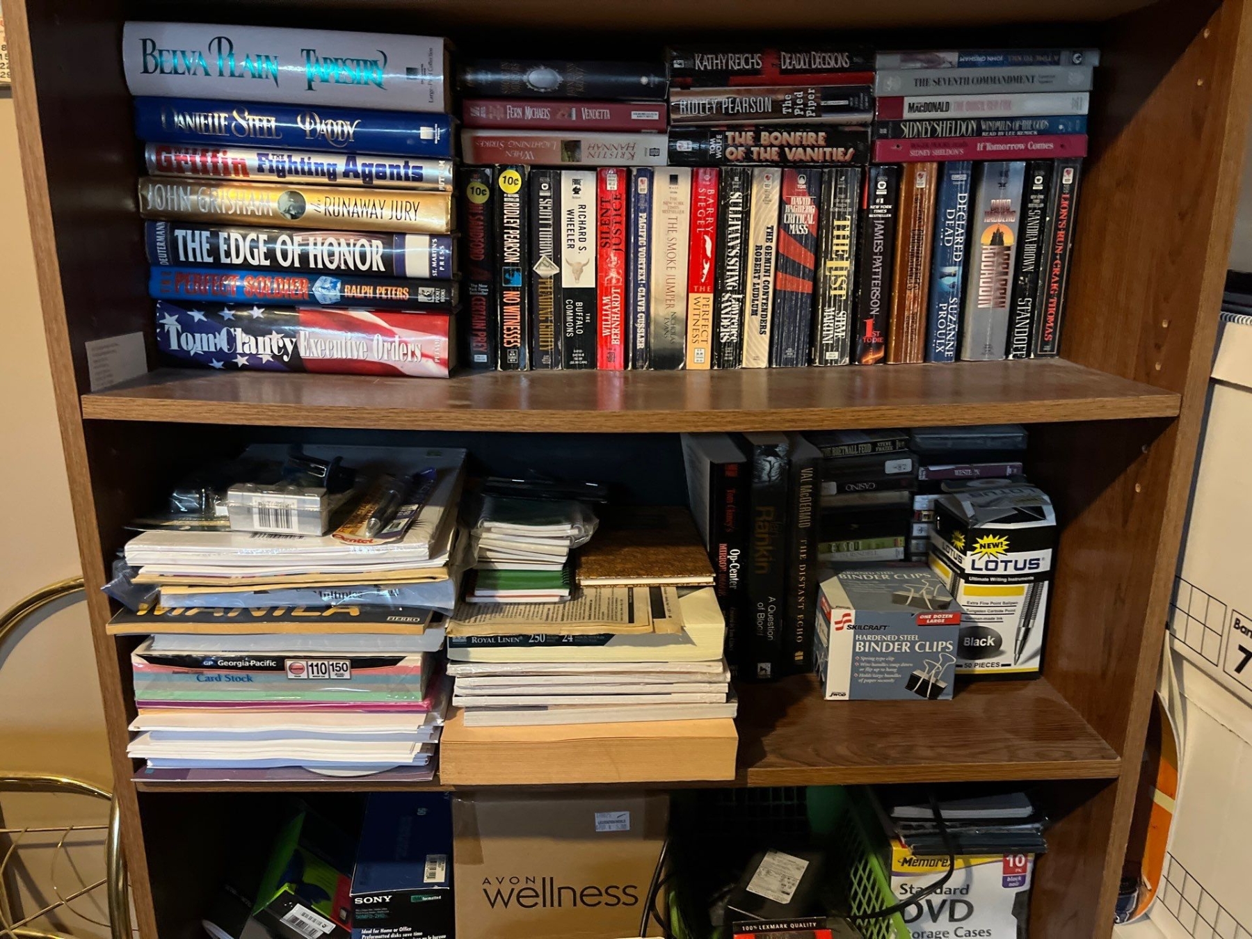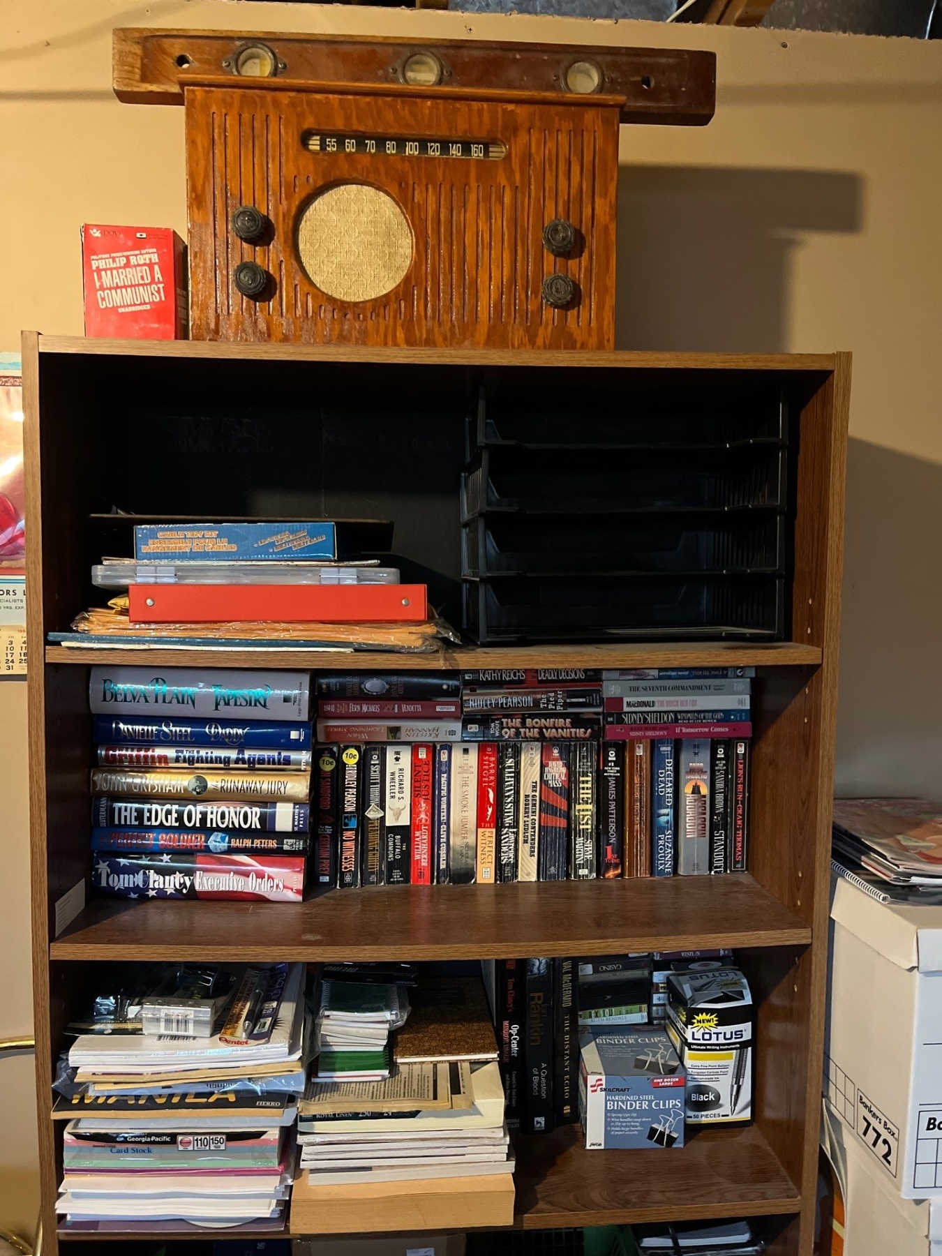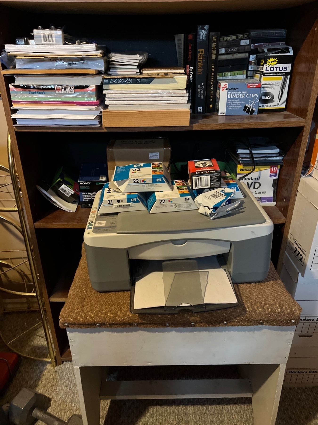 Shelf with a number of books, office supplies, printer with printer ink still with storage underneath vintage radio, and a antique level also on the shelves are a large selection of unused DVD for recording.