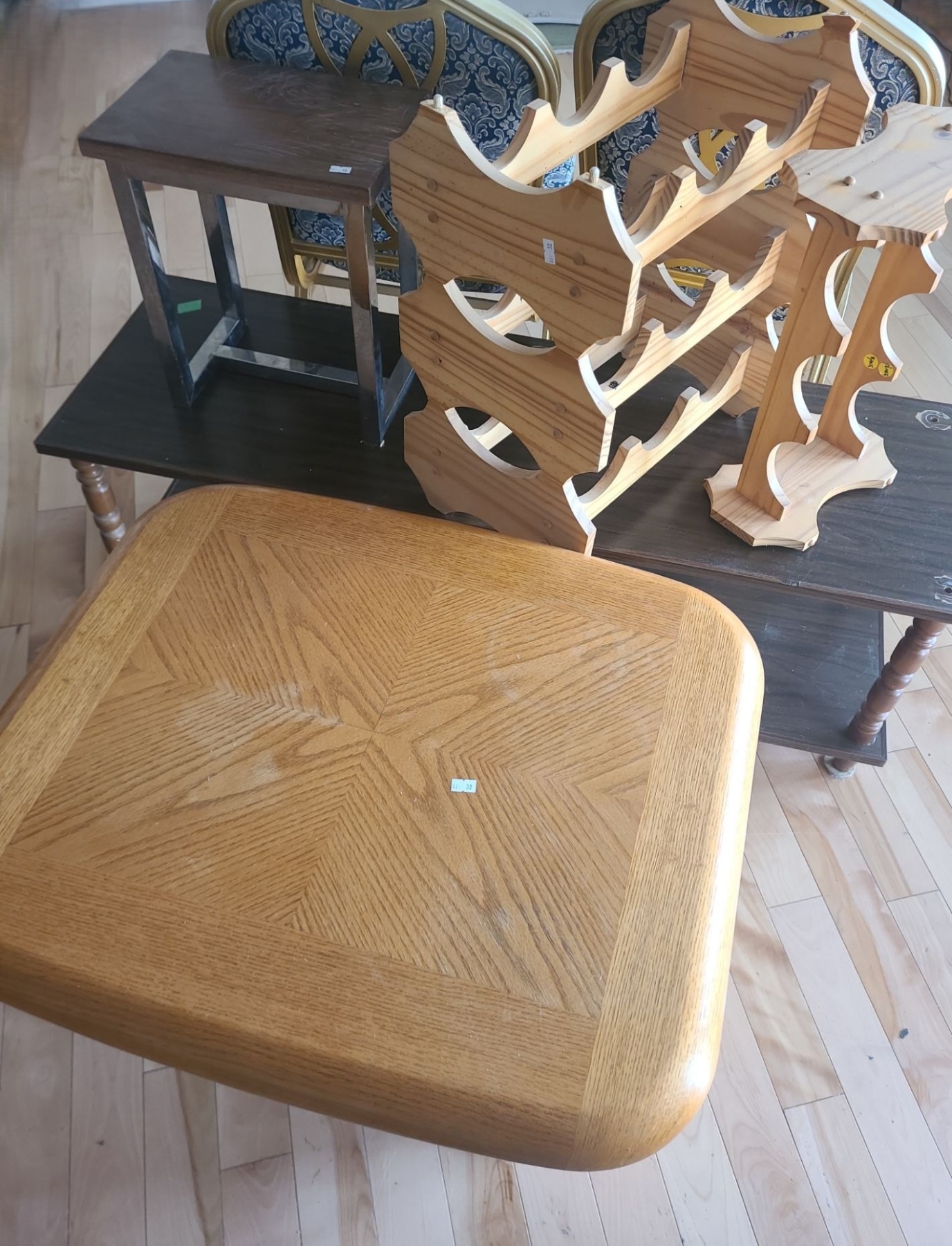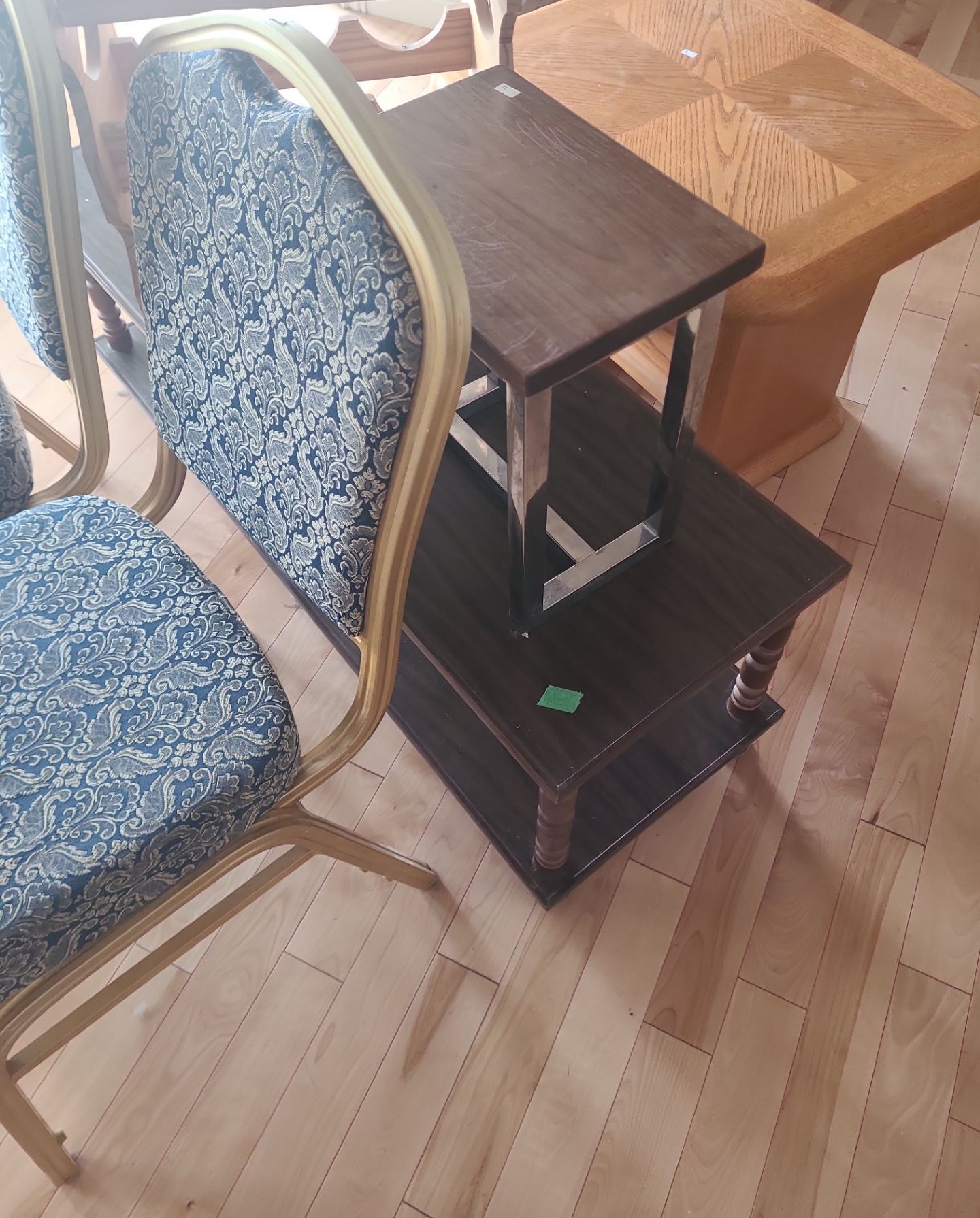 Side Table 28 W, 24 D, 22 T, Two Chairs 18 W, 20 D, 38 T, Shelving 48 W, 16 D, 17 T and More!