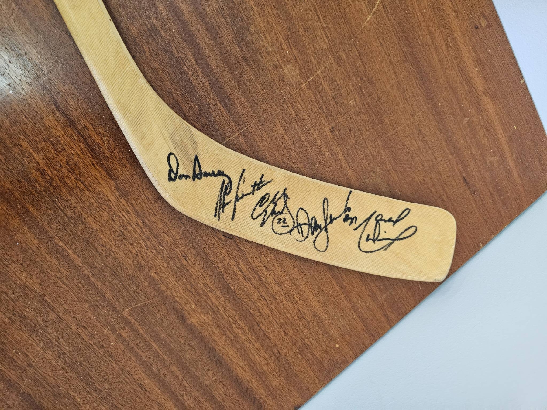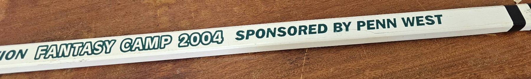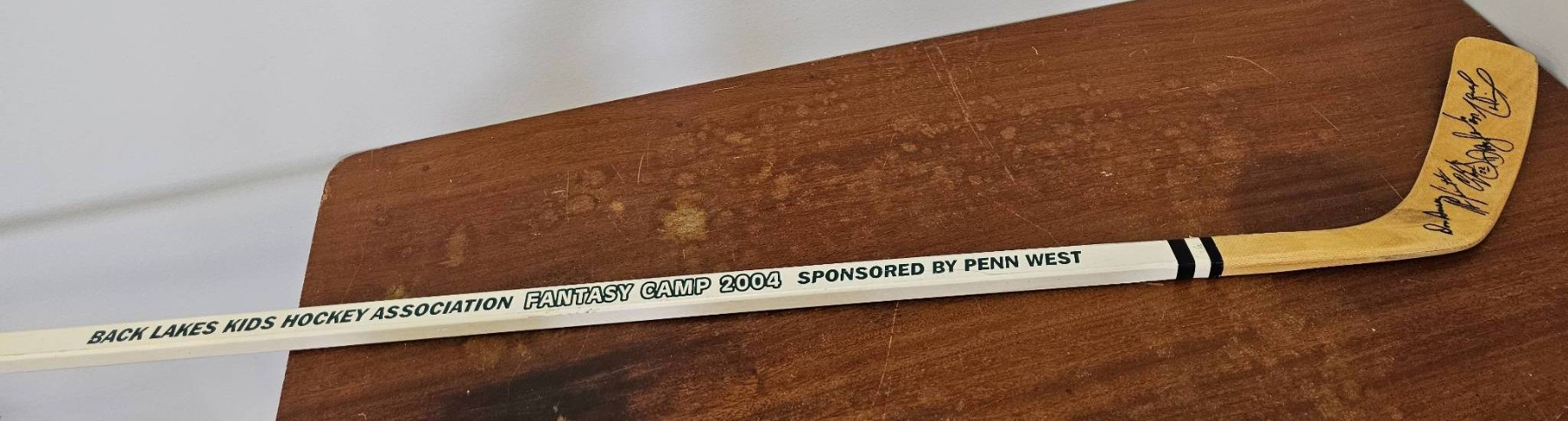 Signed by Don Aurney, Stan Johnson, Charlie Huddy, Dave Semenko & the great Marcel Dionne Hockey stick from the Union Fantasy Camp 2004, sponsored by Penn West. The stick features multiple autographs on the blade, though the specific signatories are unidentified. The stick shows minor wear consistent with its age, but is overall in good display condition.