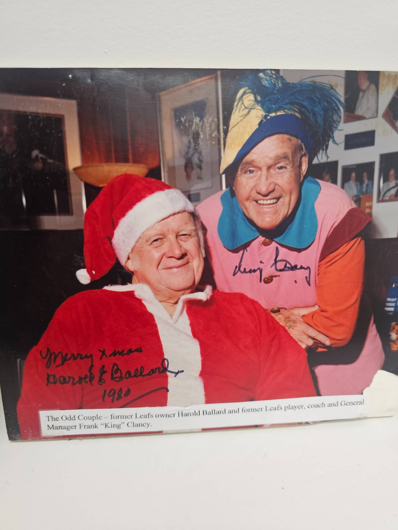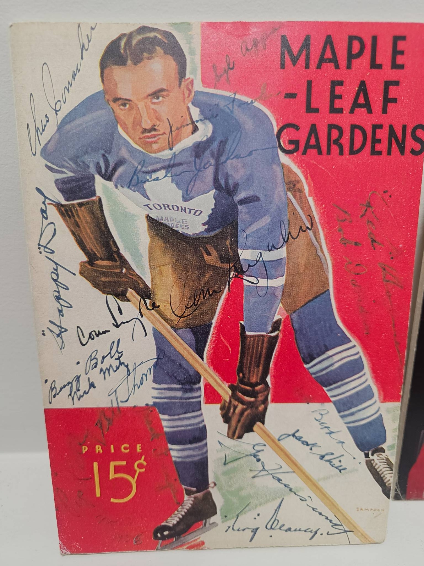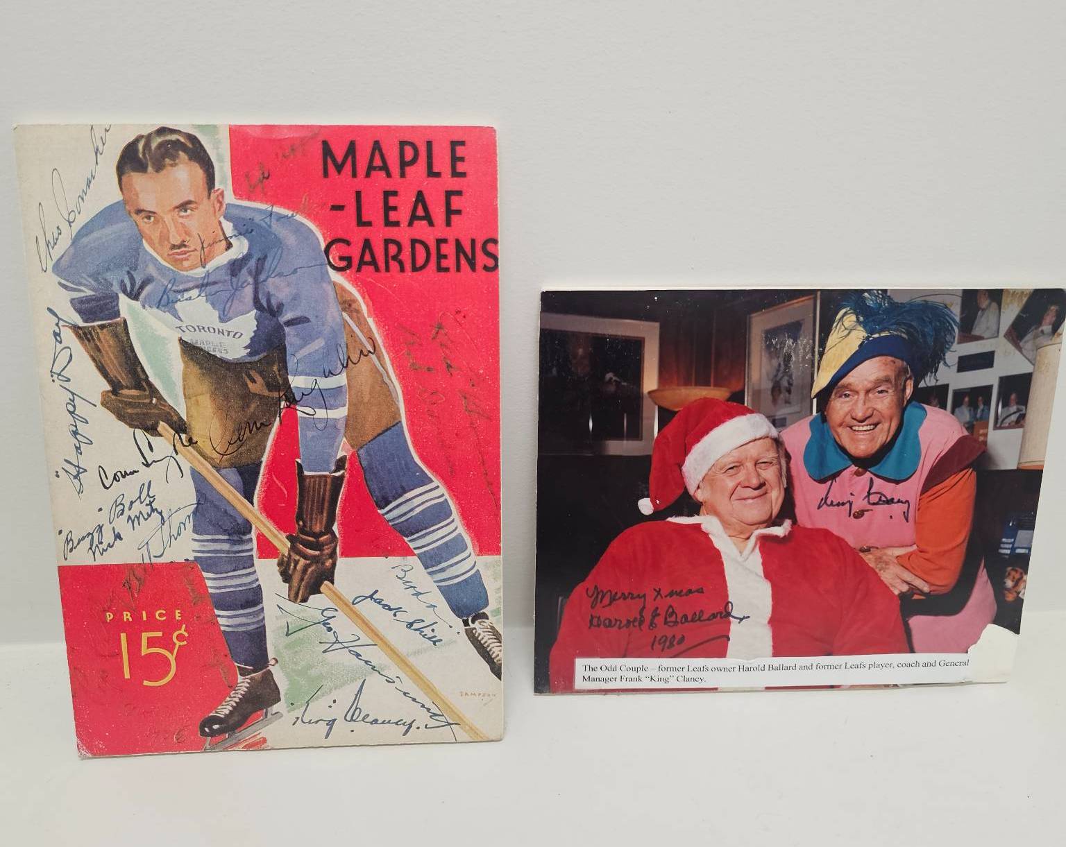 A Maple Leaf Gardens program featuring a color player illustration, adorned with multiple signatures from players or affiliates, priced at 15 cents. Accompanied by a signed vintage photograph of two individuals in festive attire, adding character and historical appeal. Perfect for collectors of hockey memorabilia or vintage autographed items.