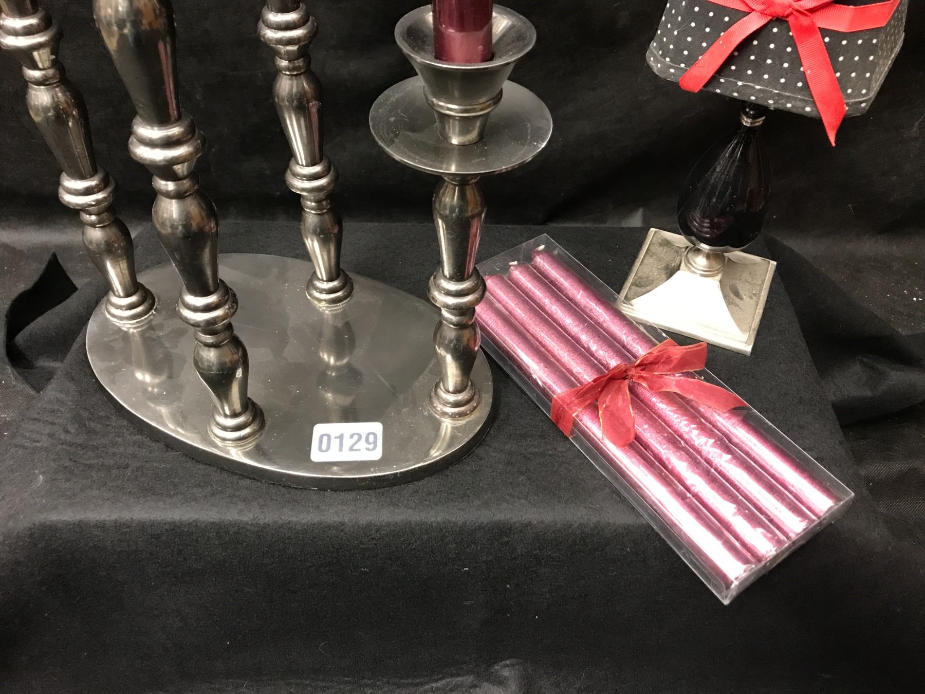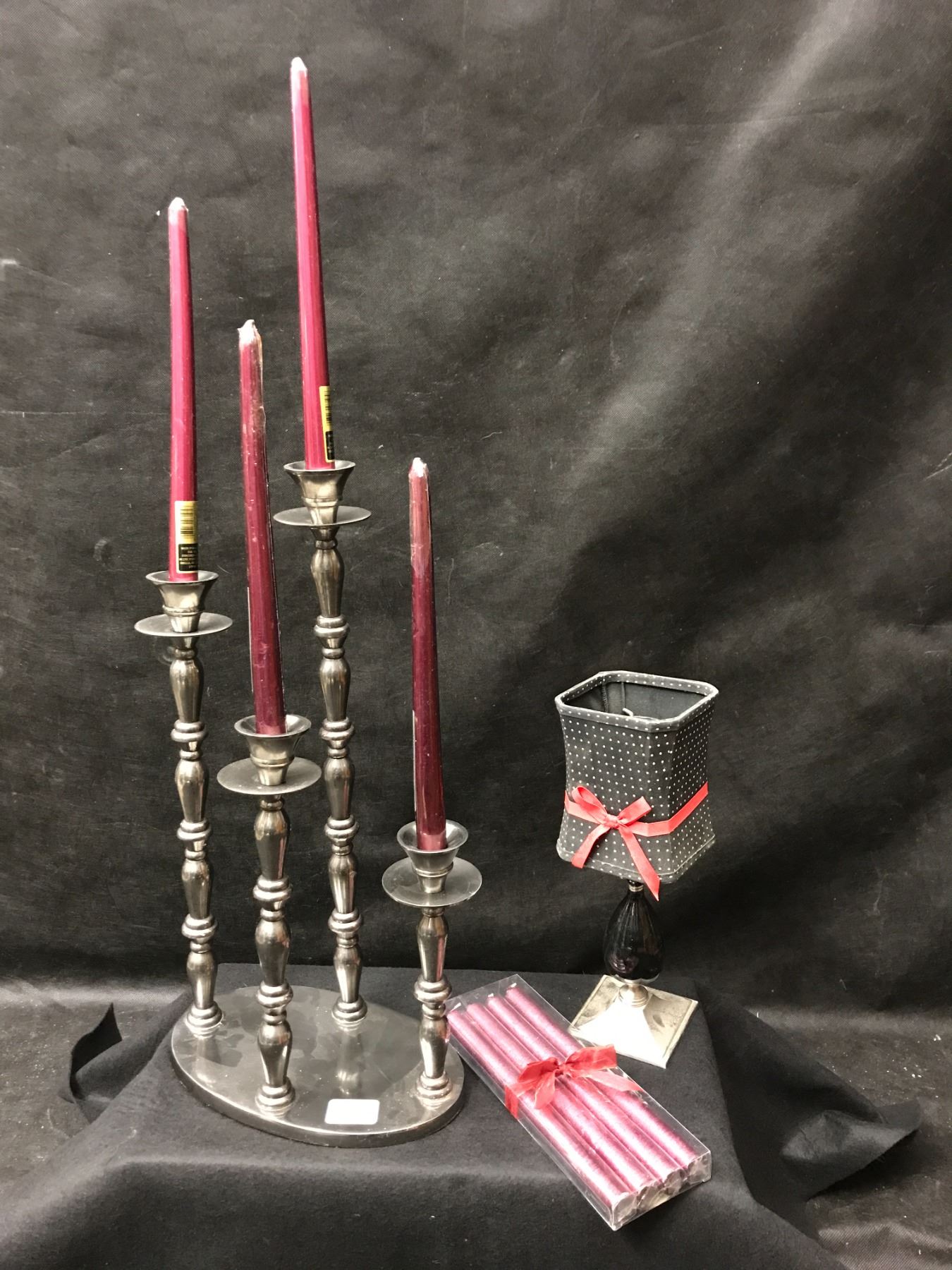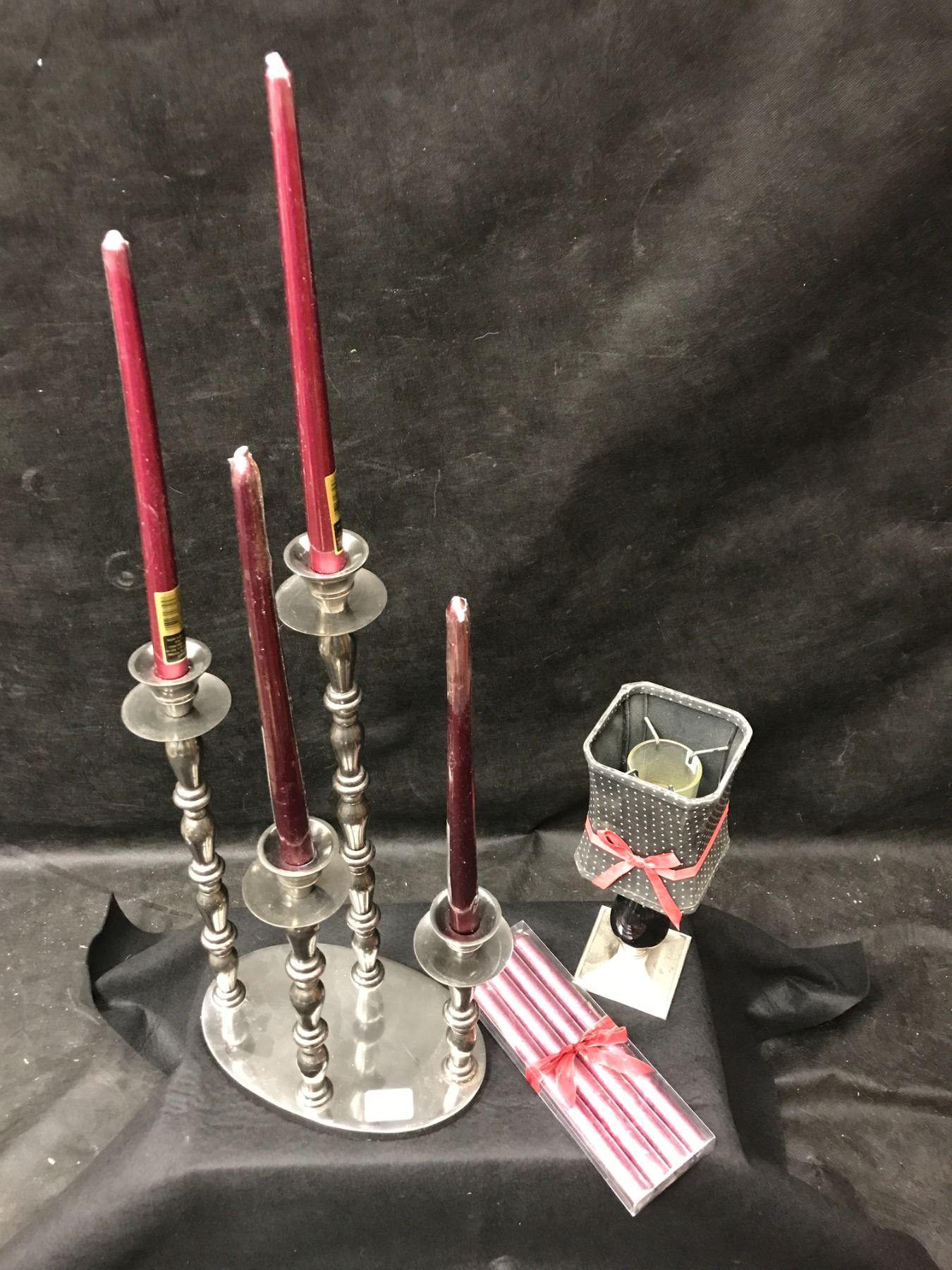 Silver Candelabra, Candle Holder w Shade & Red Candles
