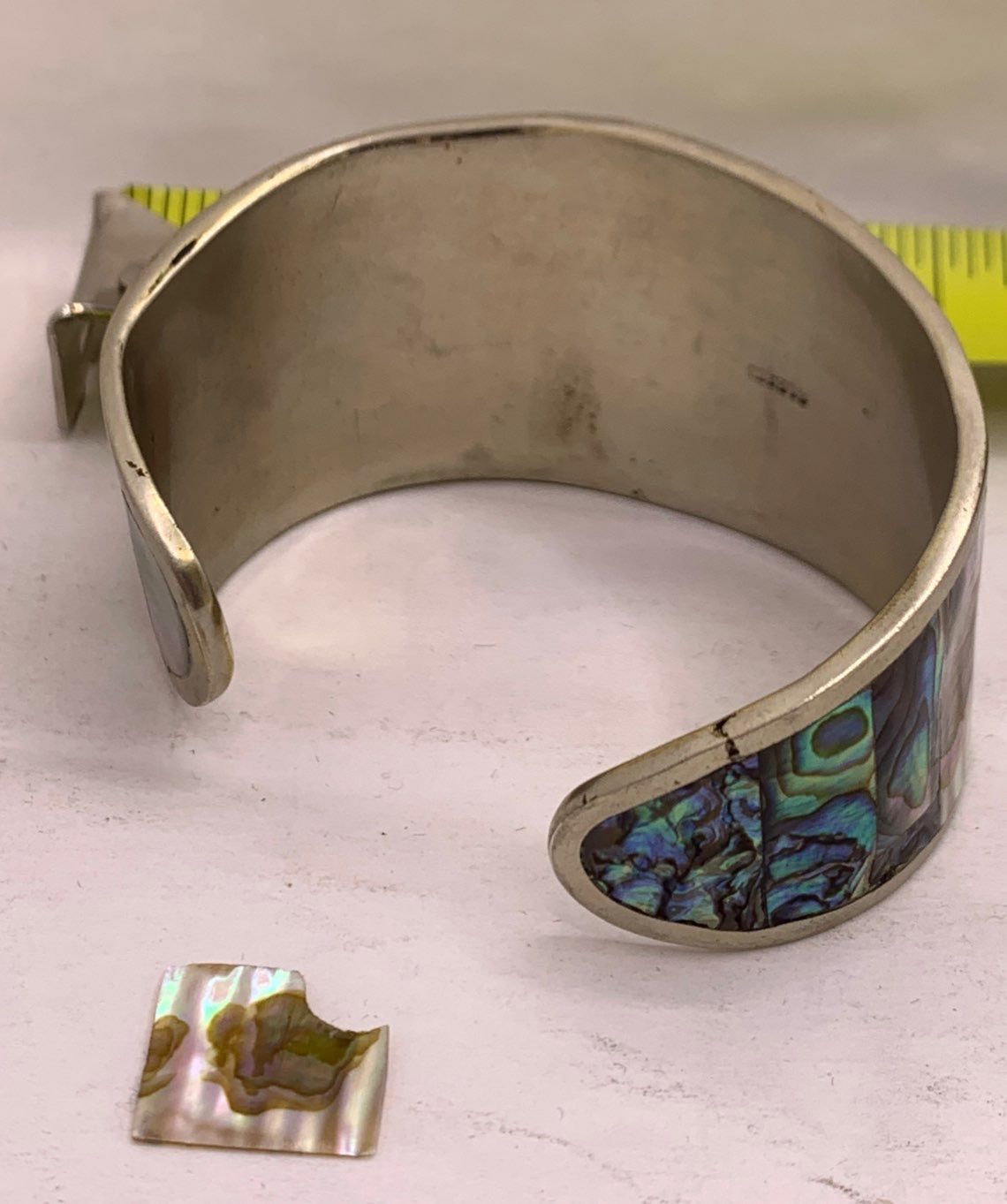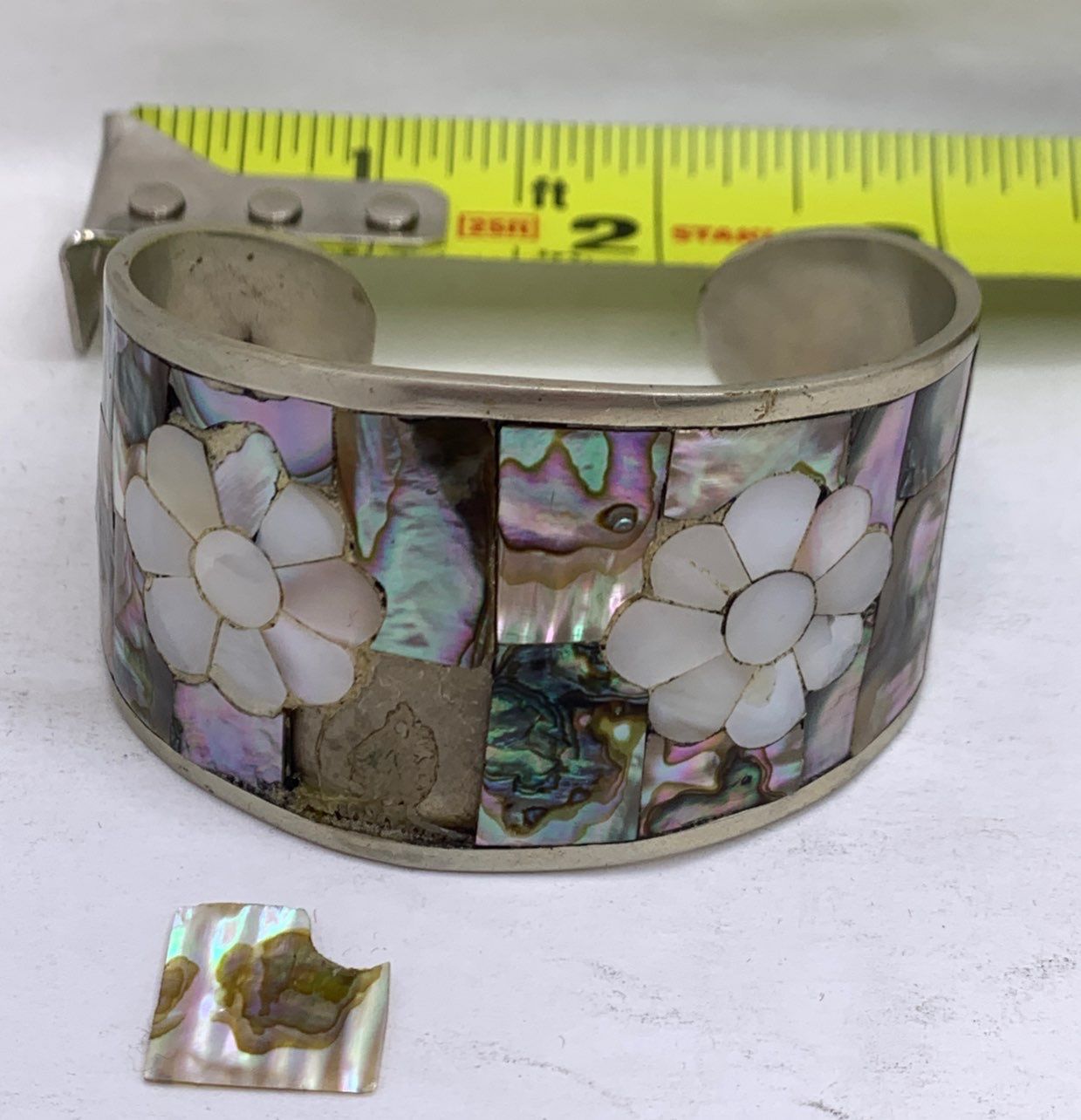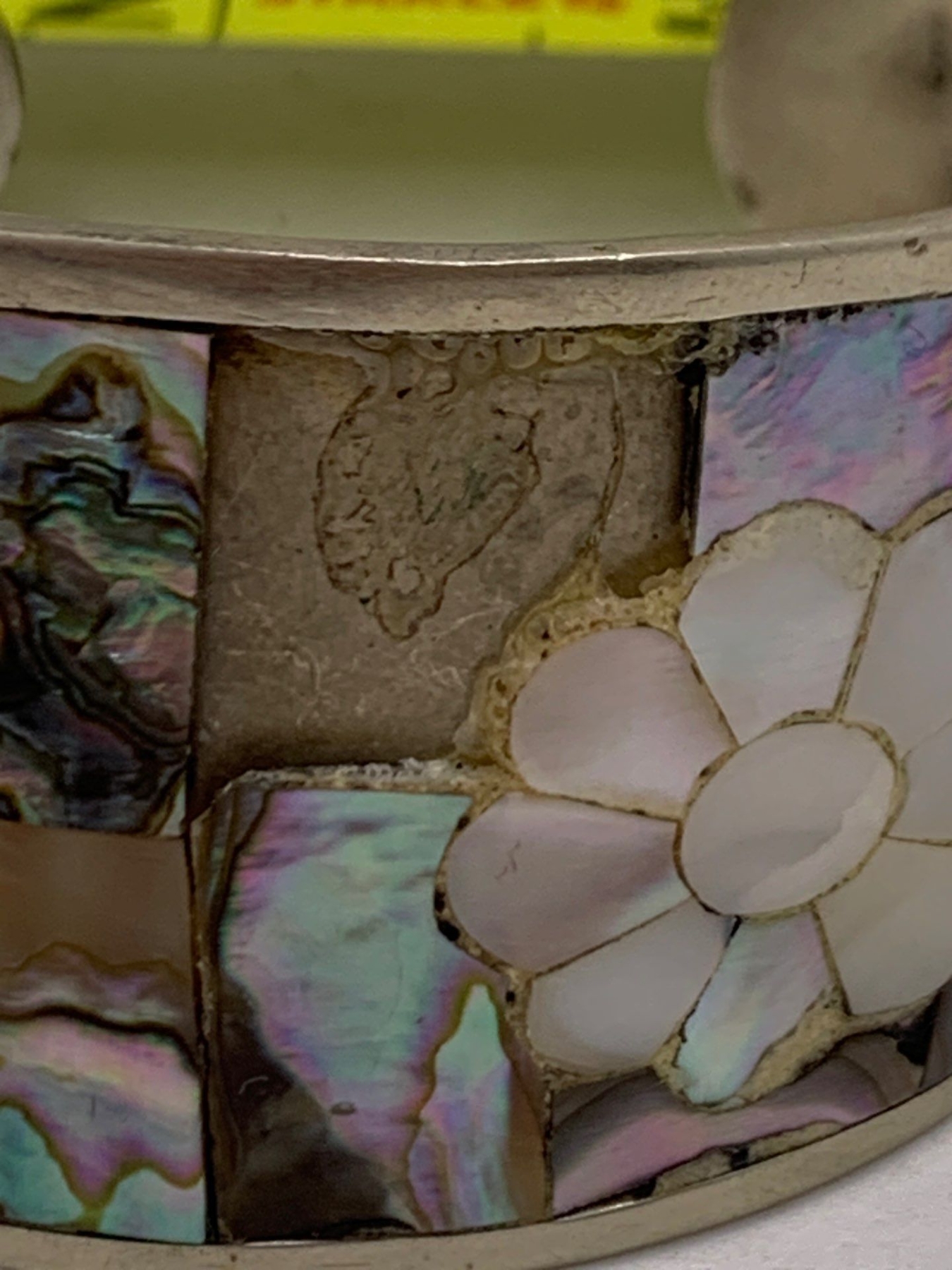 Silver Colored Bangle w/ Lovely Mother of Pearl Stones; Faded Stamp, Piece of Stone Removed