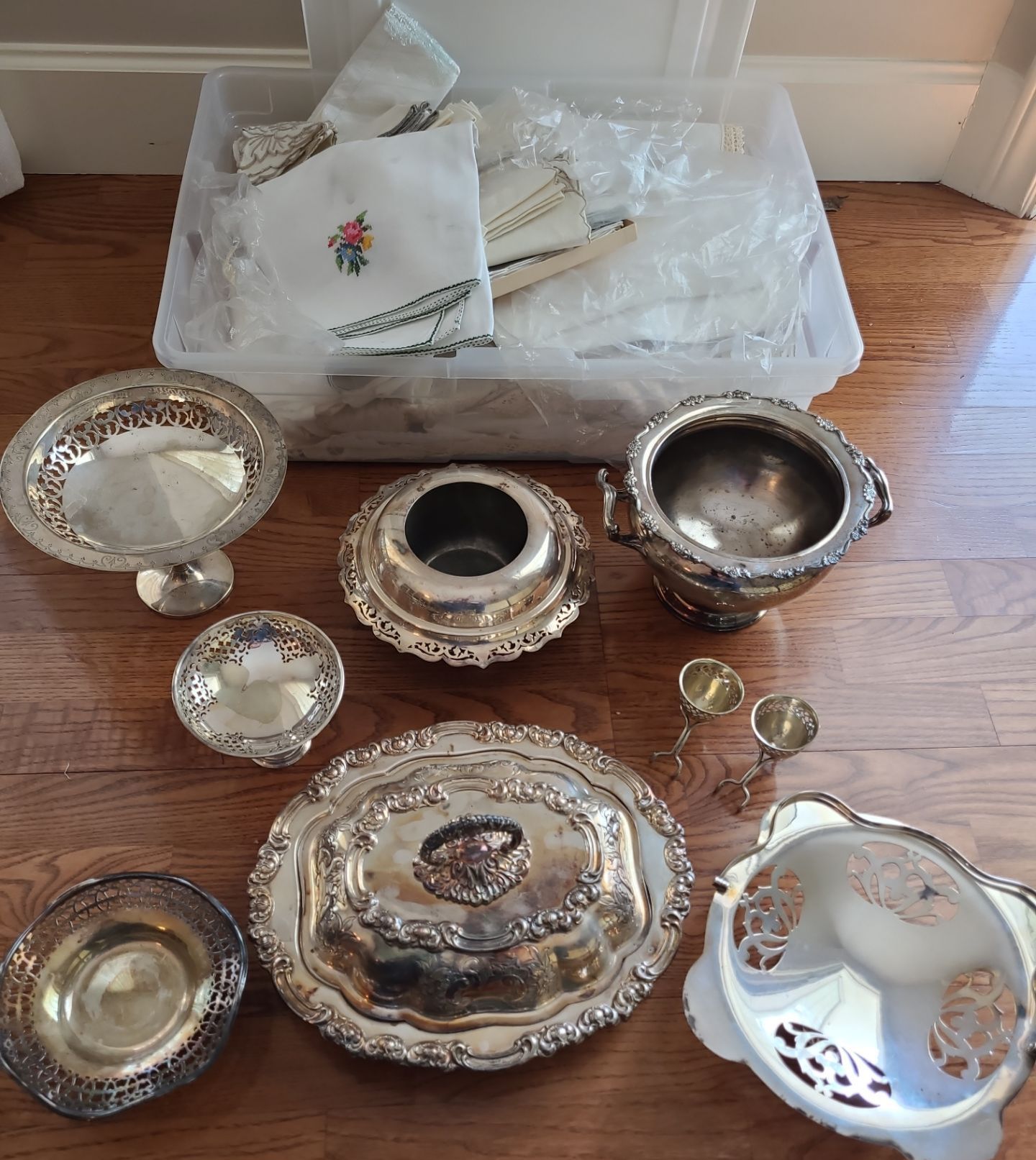 Silver Plate Kitchenware Set w/ Bin of Table Linens