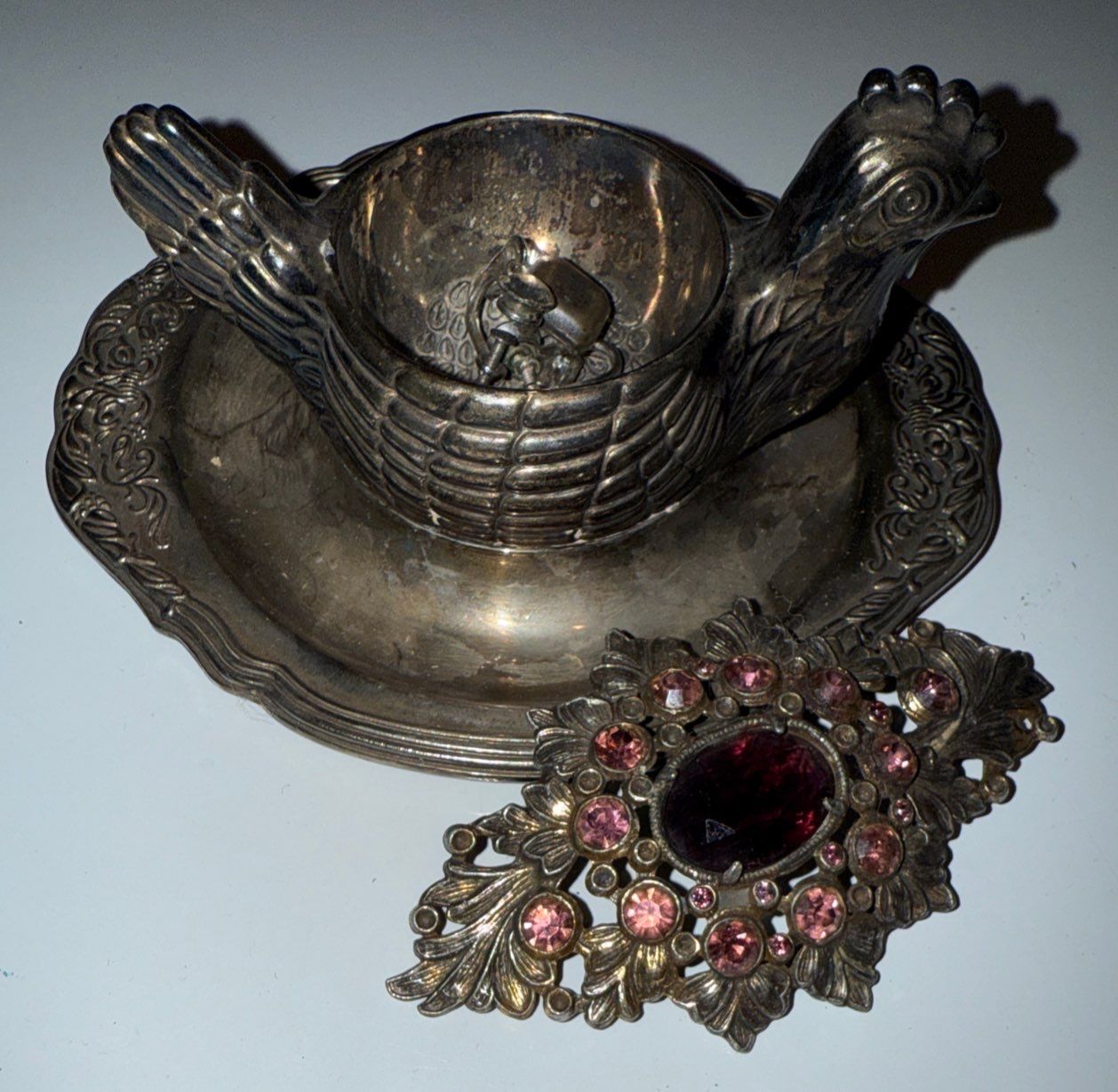 Silver-Plated Ornamental Dish (Rooster Shaped) & Pink Stoned Brooch