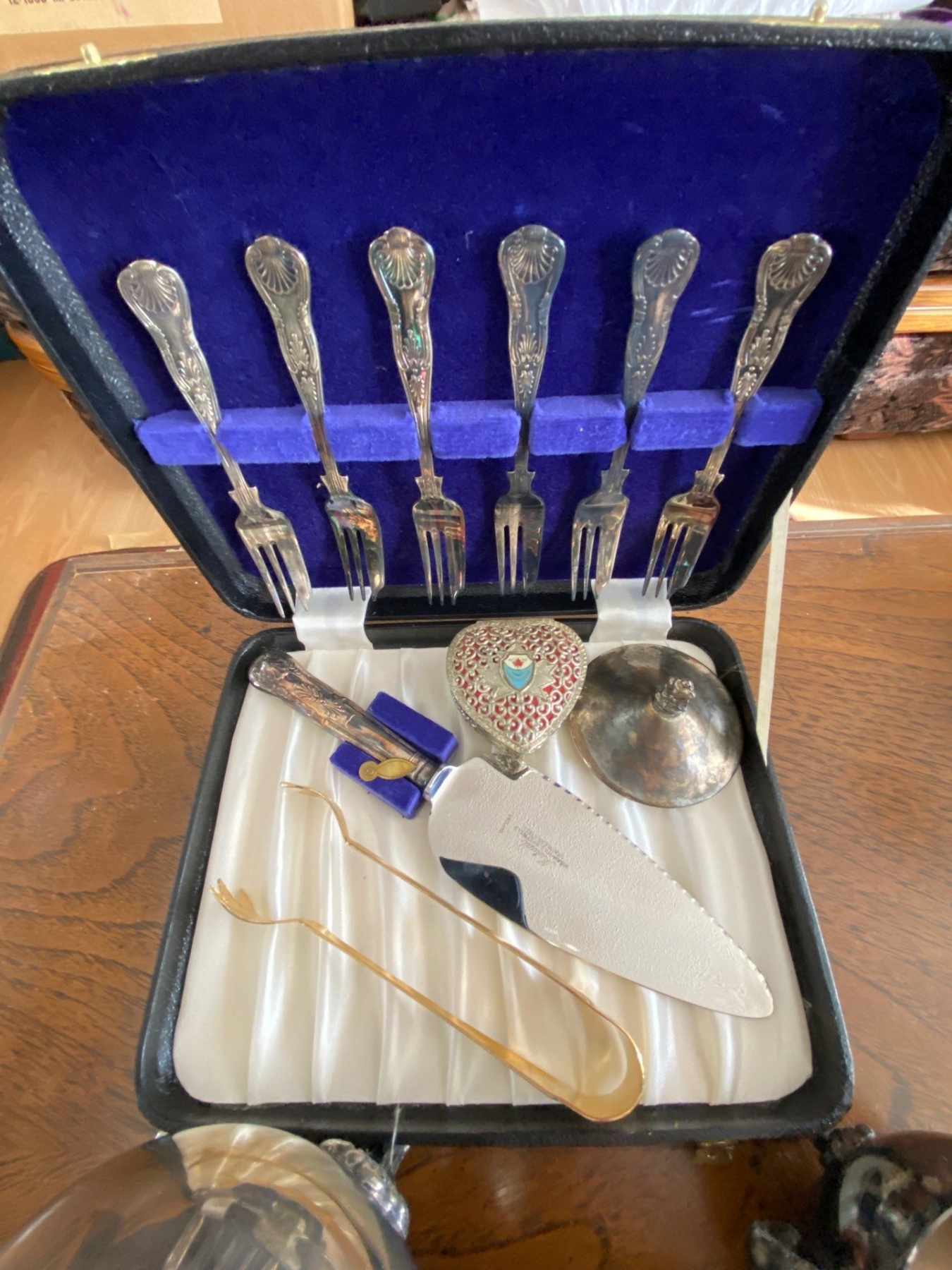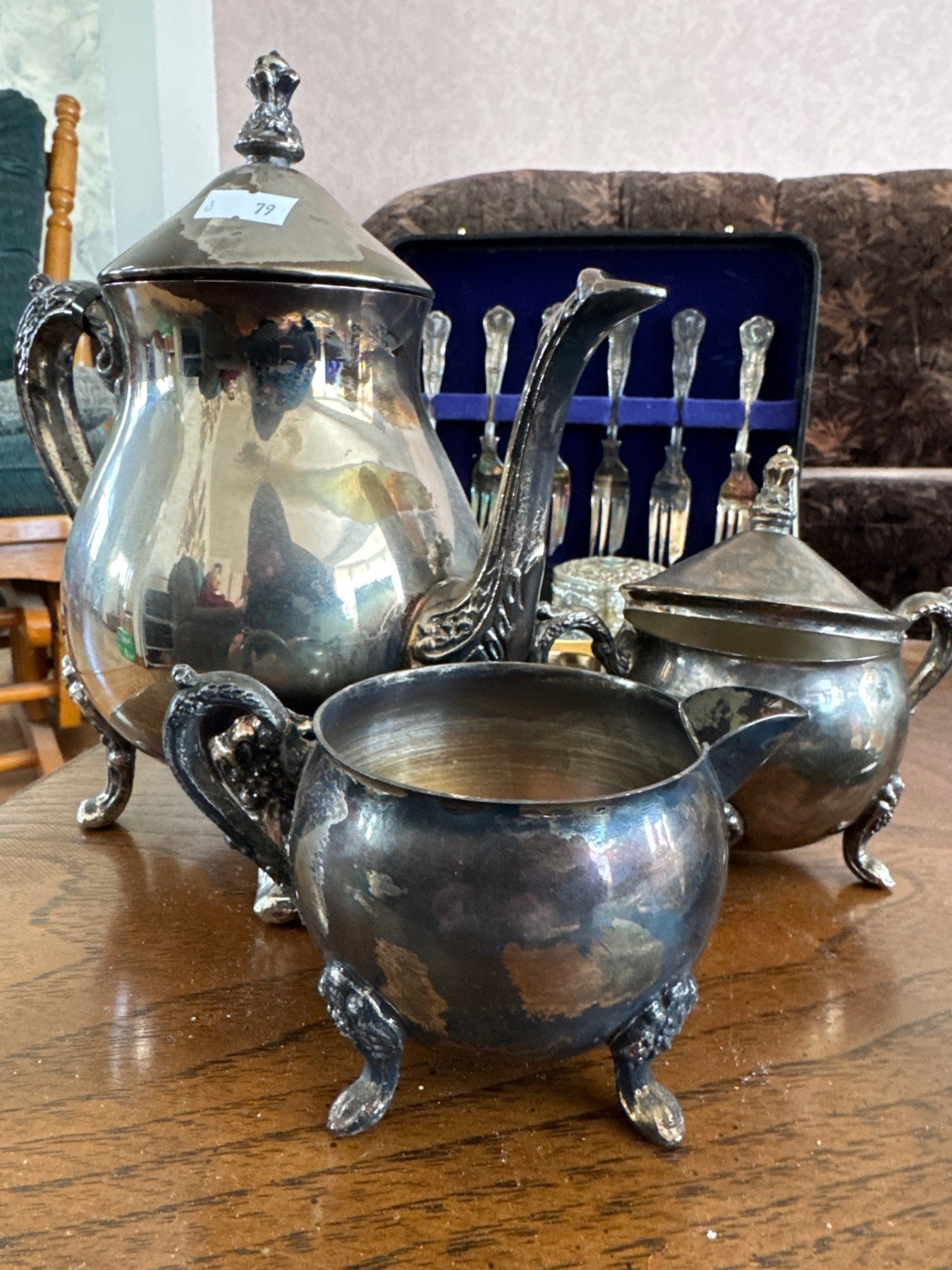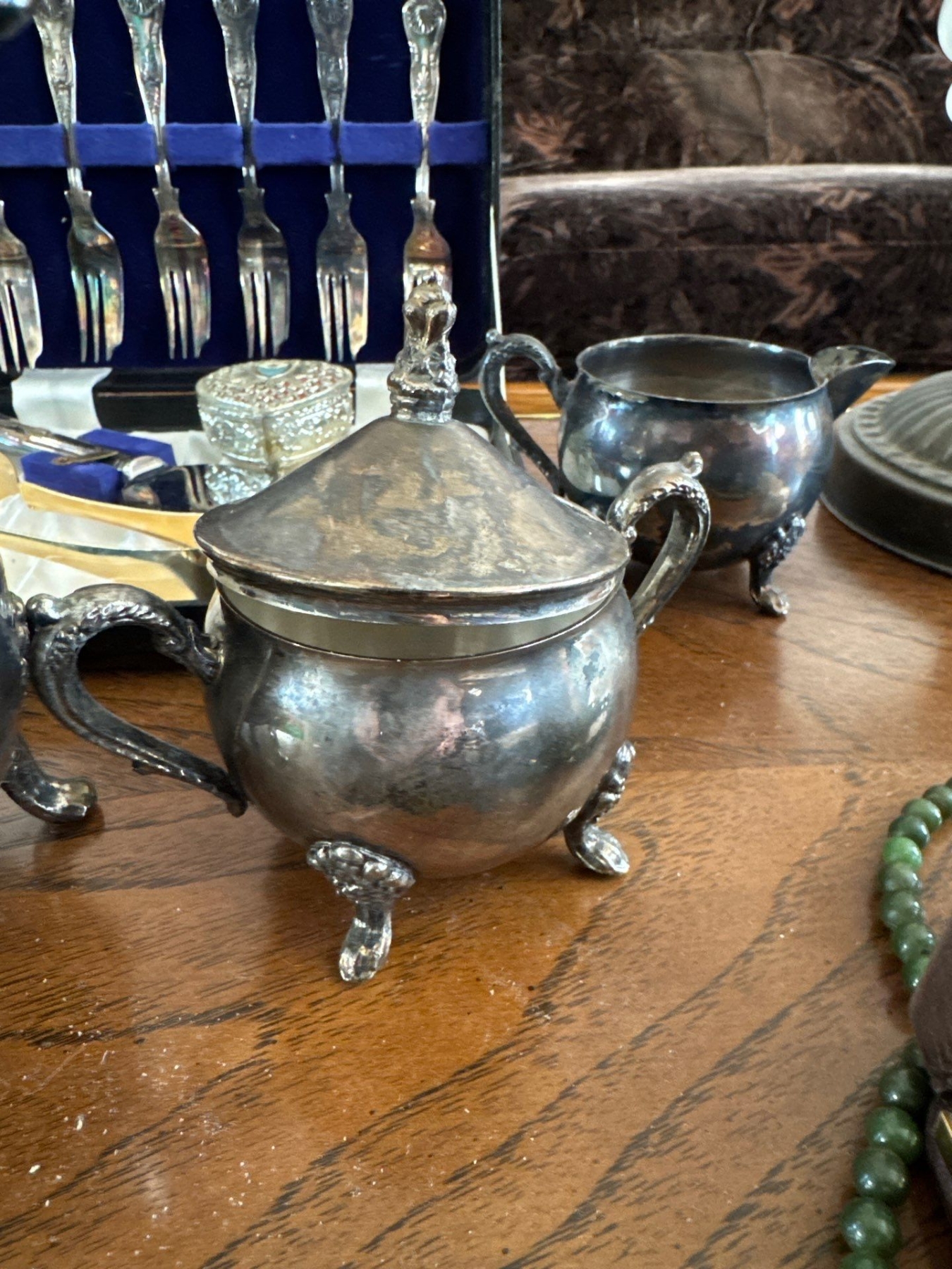 Silver plated, teapot, cream and sugar dispensers and silver plated, fork set and pie server