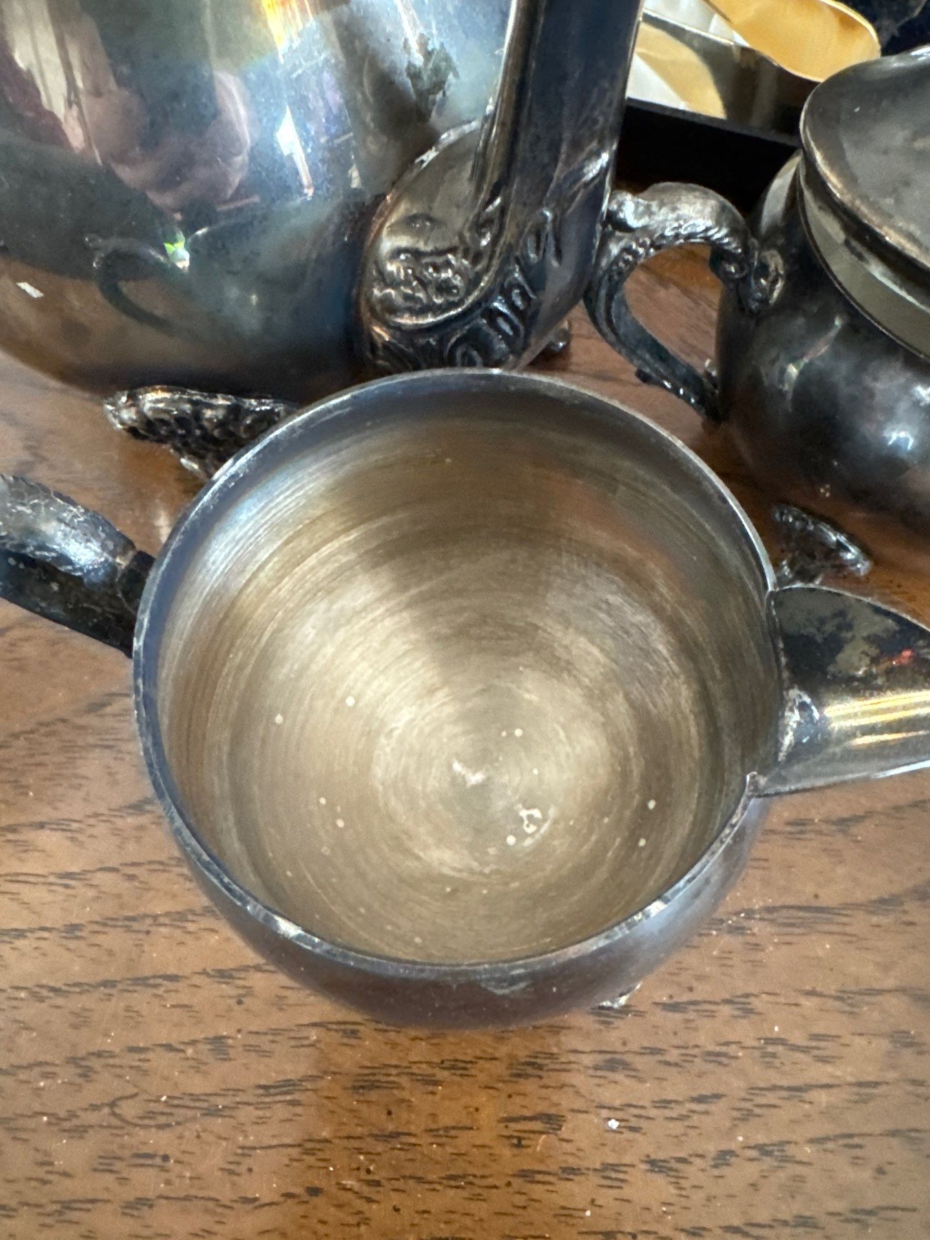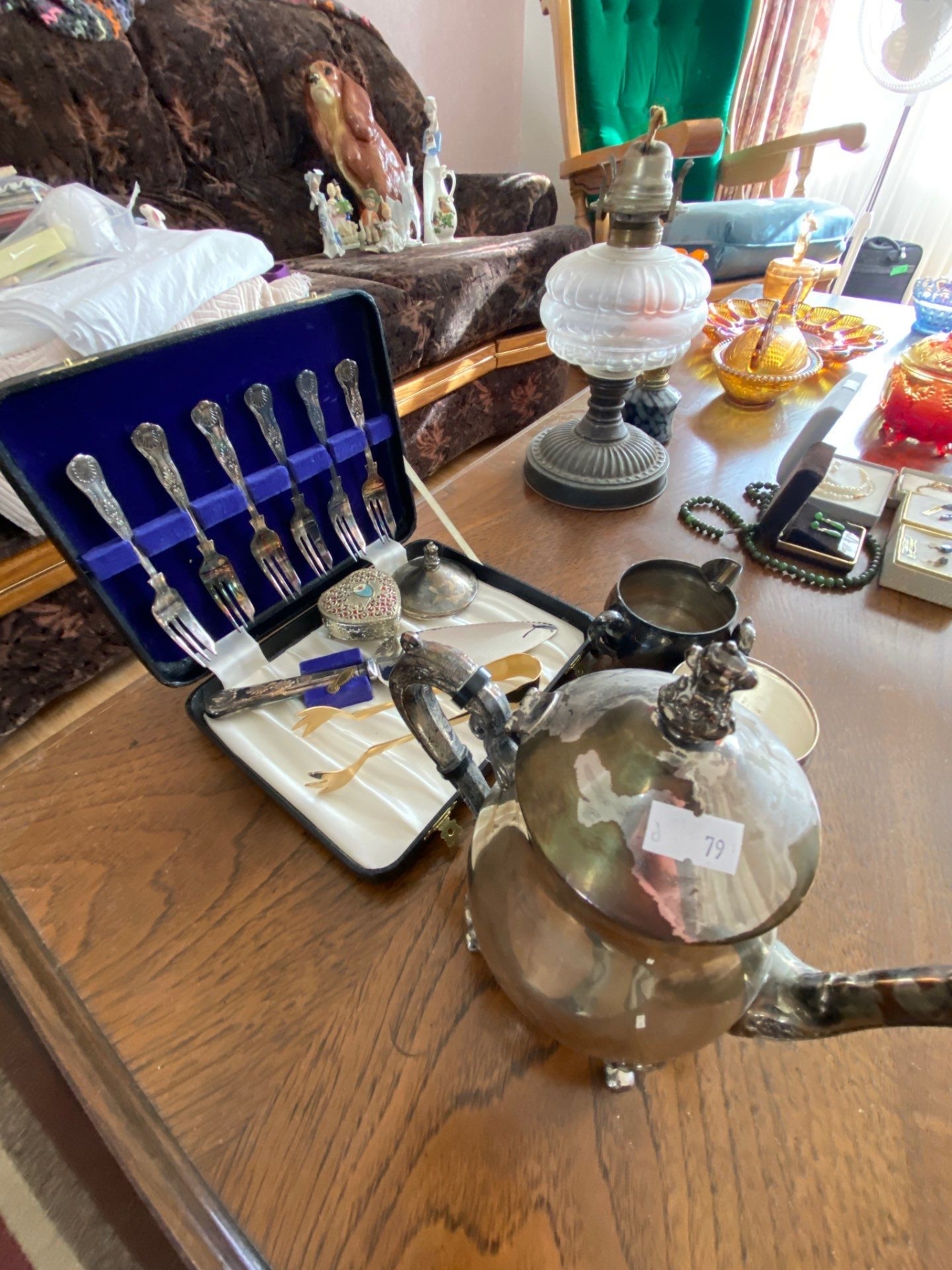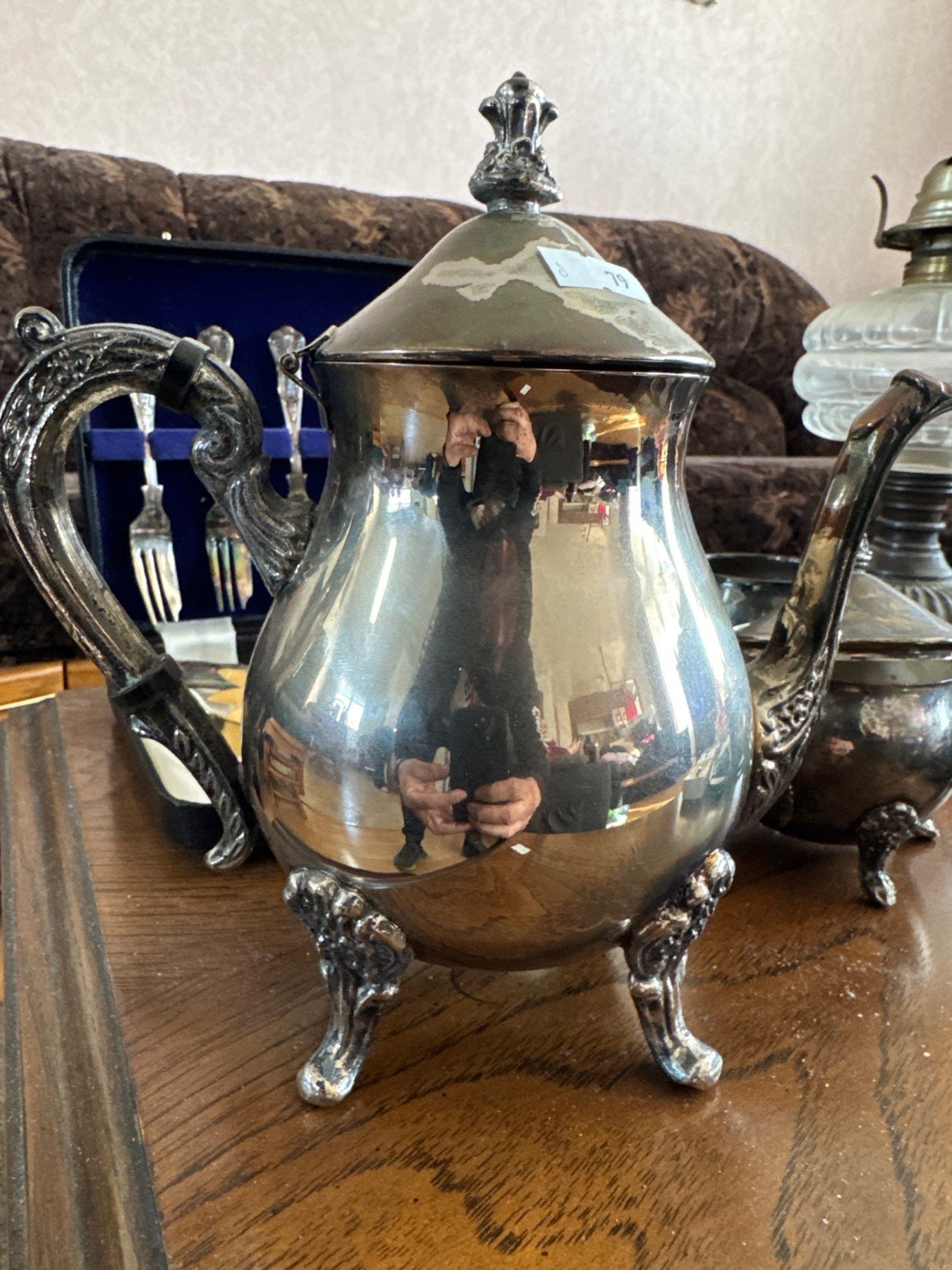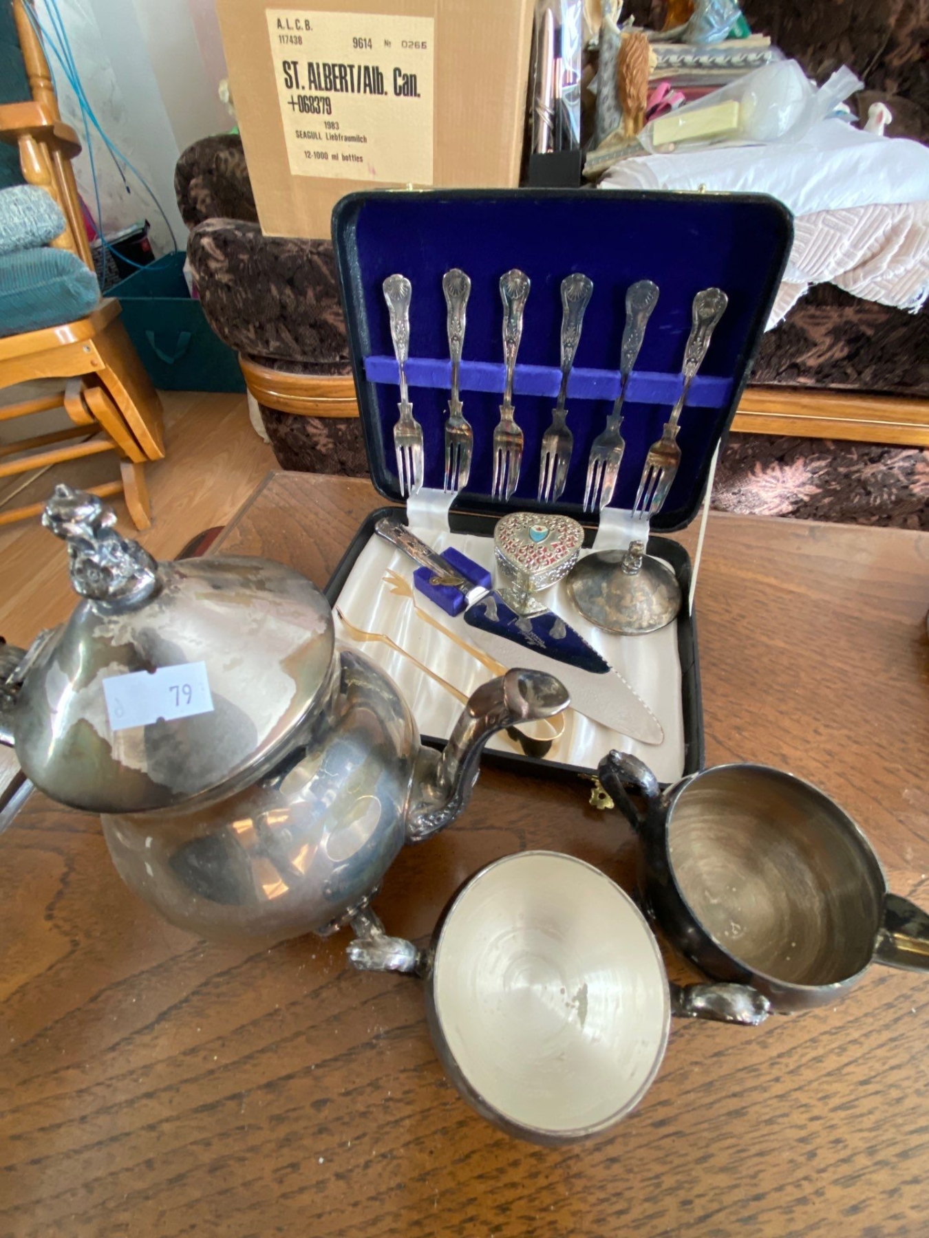 Silver plated, teapot, cream and sugar dispensers and silver plated, fork set and pie server