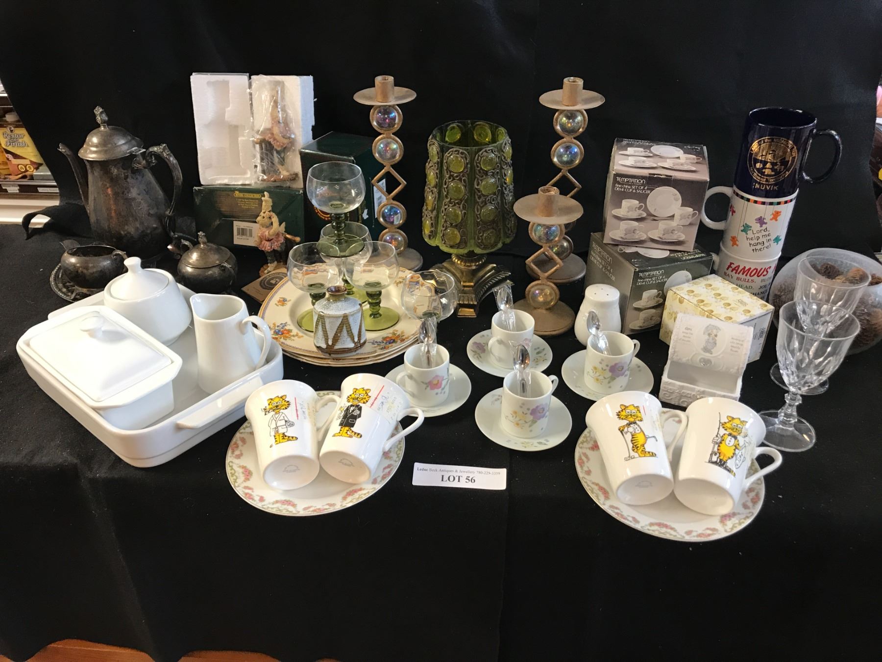 Silverplate Coffee Pot/Cream/Sugar Bowl, 2 sets of Demi Cup/Saucers/Spoons, Vintage Candle HoldersAsst Plates, Mugs, White Casserole Dish, Butter Dish, Cream & Sugar Bowl, Sm Vase, 2 Bunny Figurines, 2 Wine Glasses, Precious Moments Momento Box & Sm Glass Bowl w Pinecones