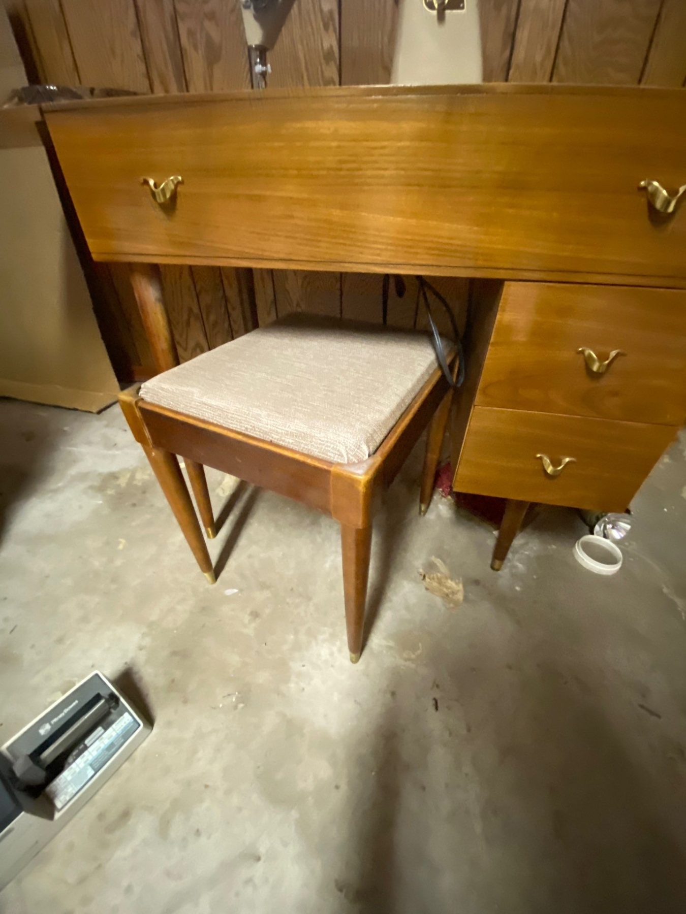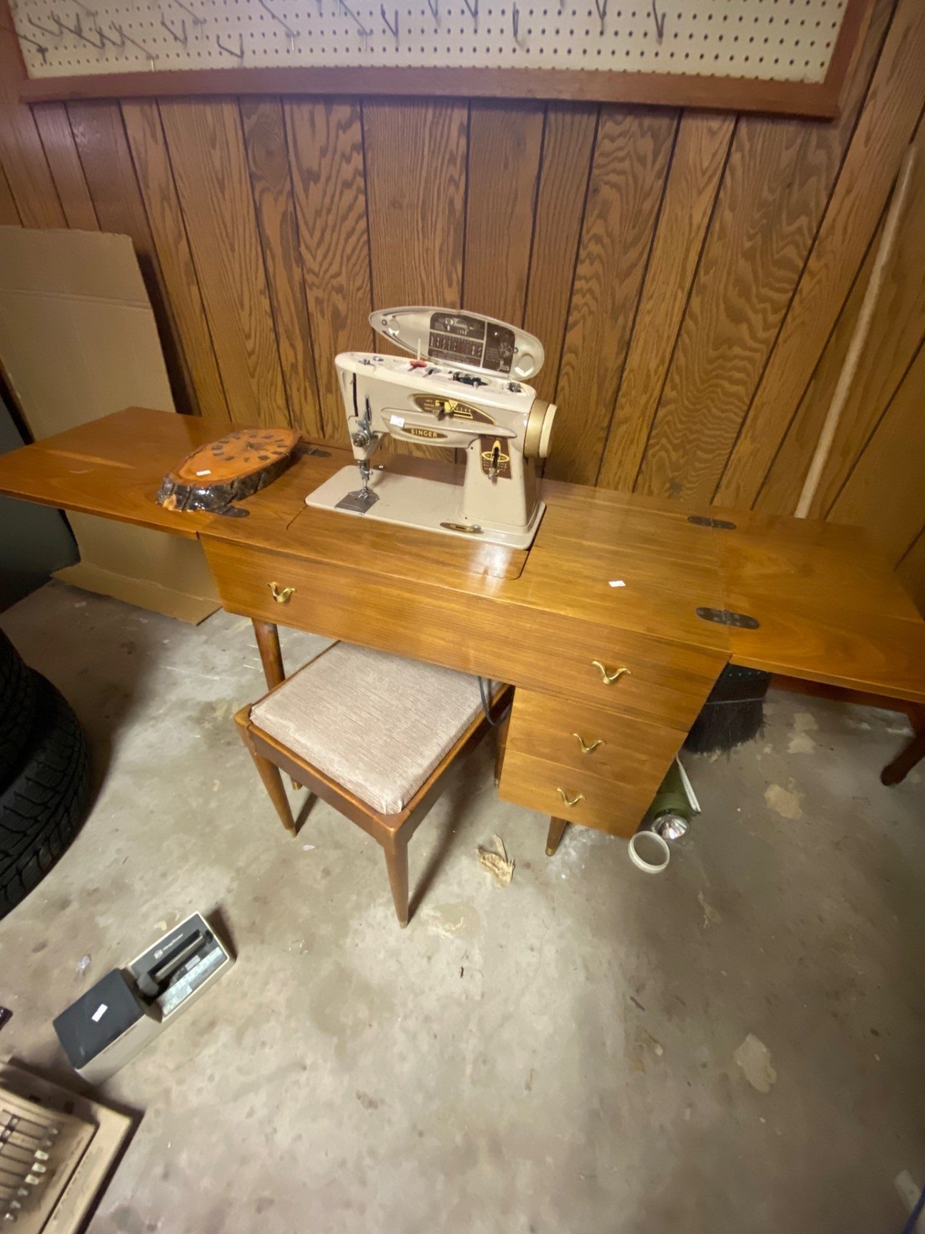 Singer, sewing machine and clock, Elkridge crafts clock, and made in Alberta antique sewing desk and chair