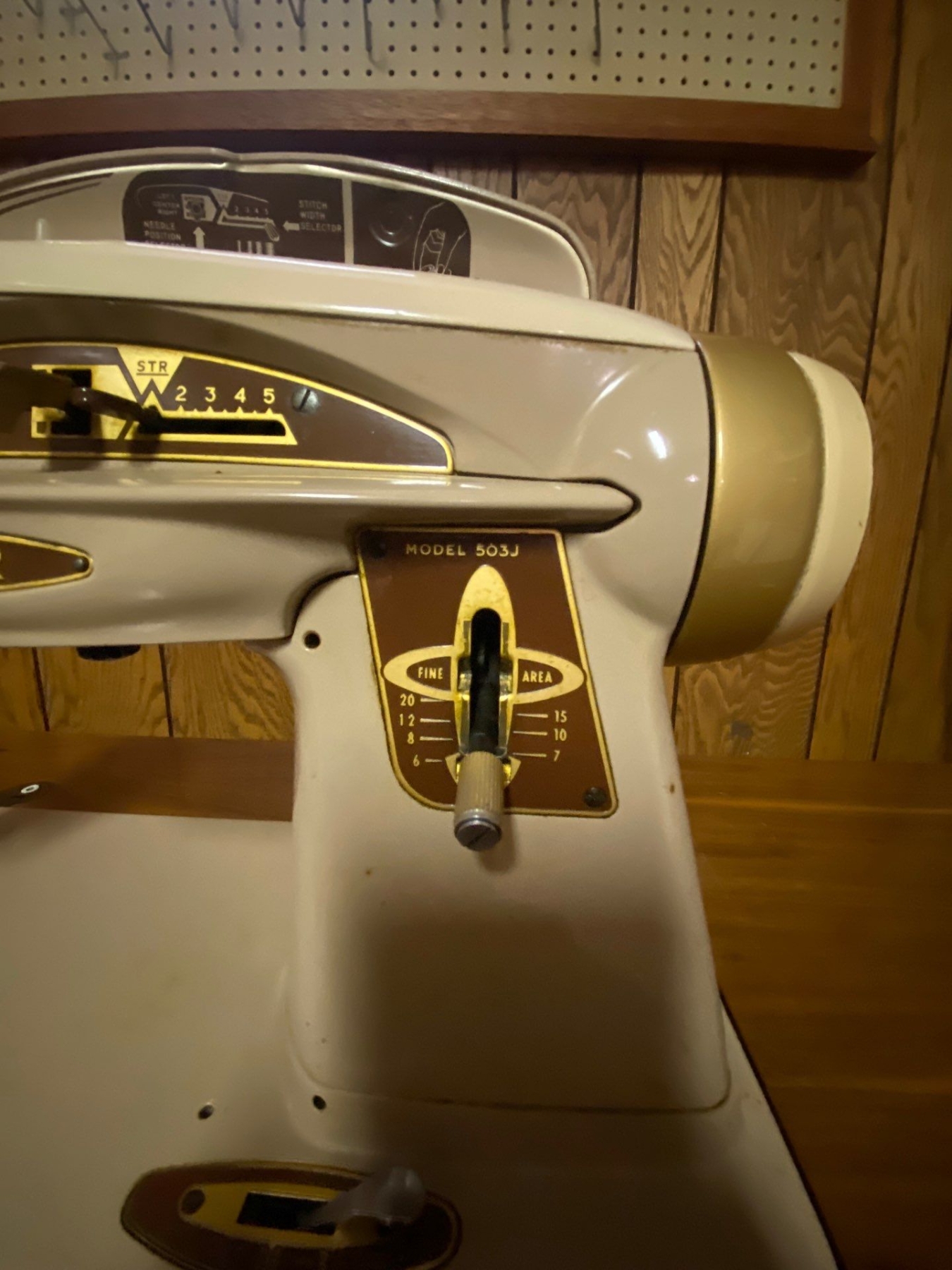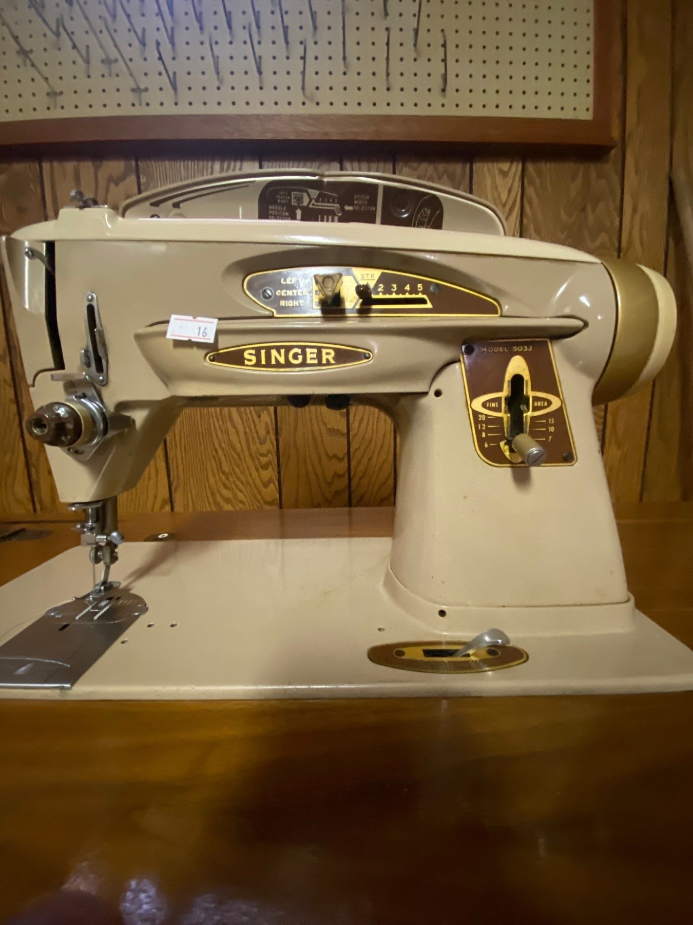 Singer, sewing machine and clock, Elkridge crafts clock, and made in Alberta antique sewing desk and