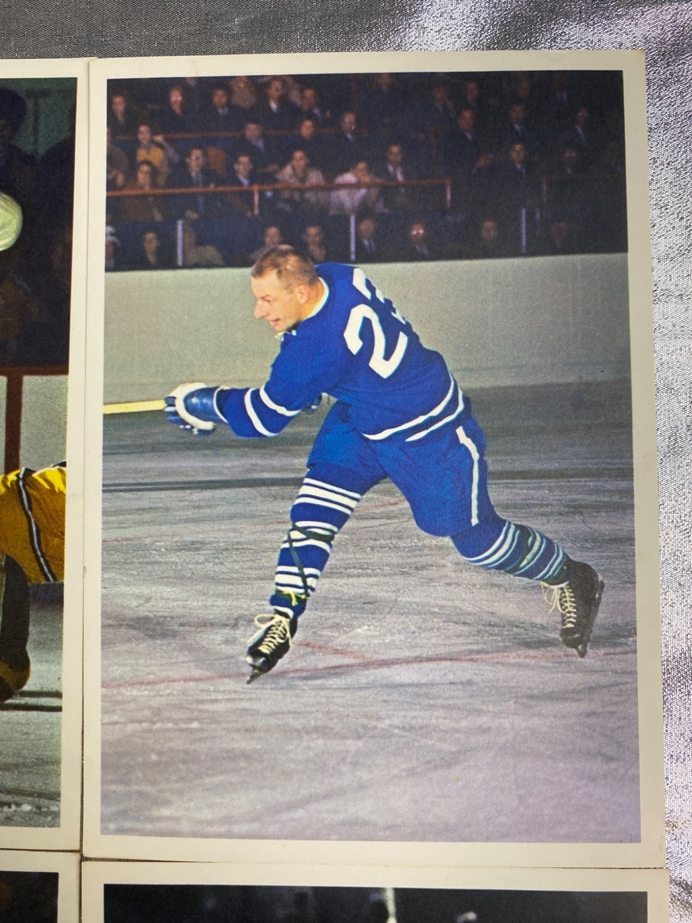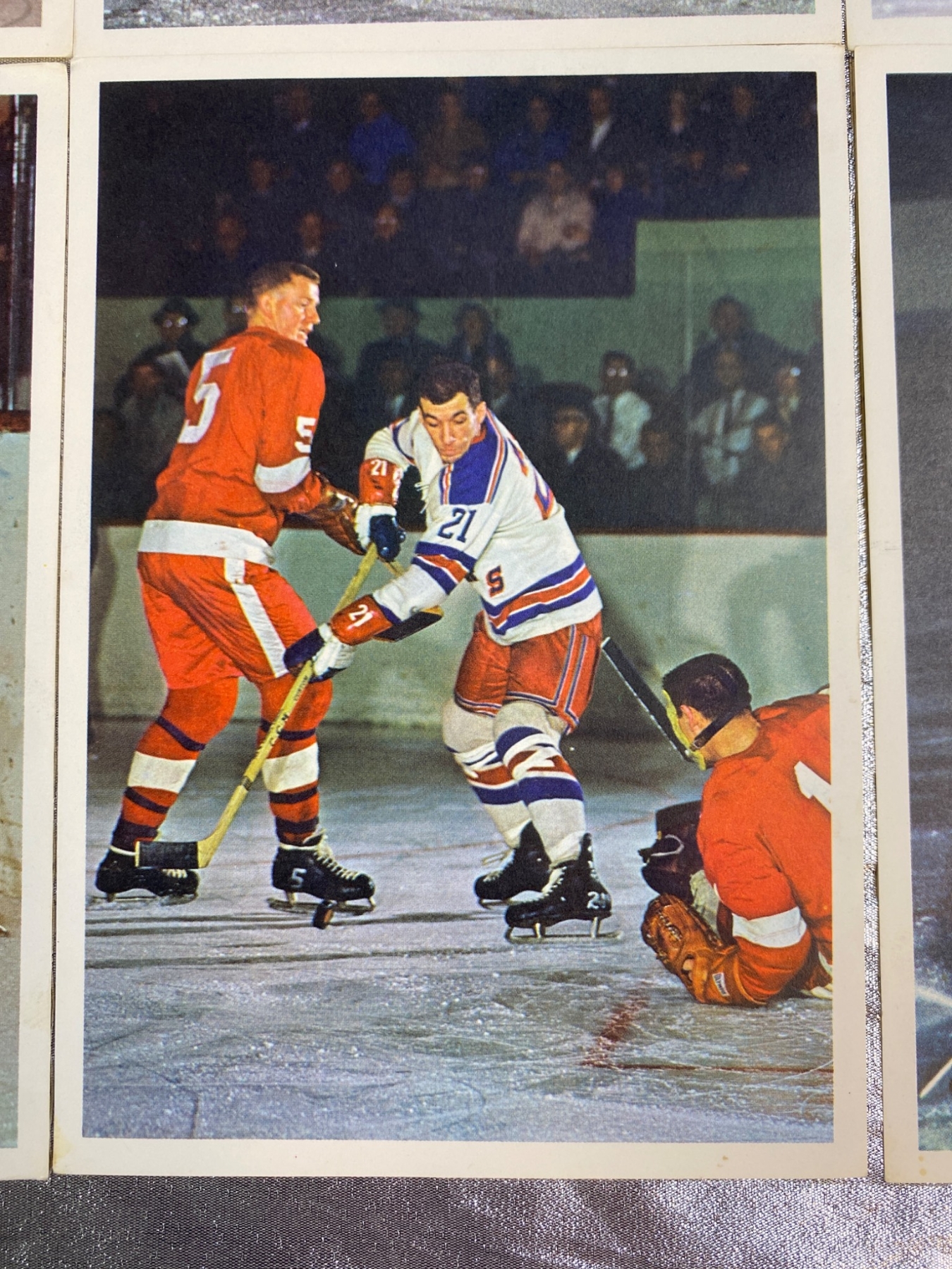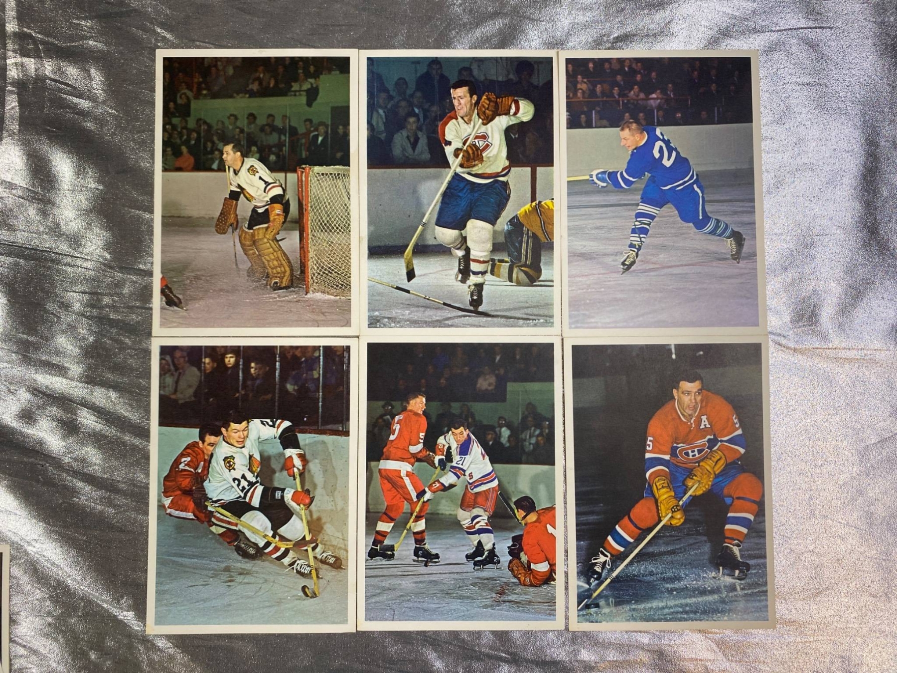 Six collectible postcards showcasing 1960s ice hockey players in action. Each card captures vivid gameplay moments, including goalkeeping, skating, and stick handling. Colors are bright, and the cards maintain consistent detailing. Light wear consistent with age is visible. Perfect for hockey enthusiasts or sports memorabilia collectors.