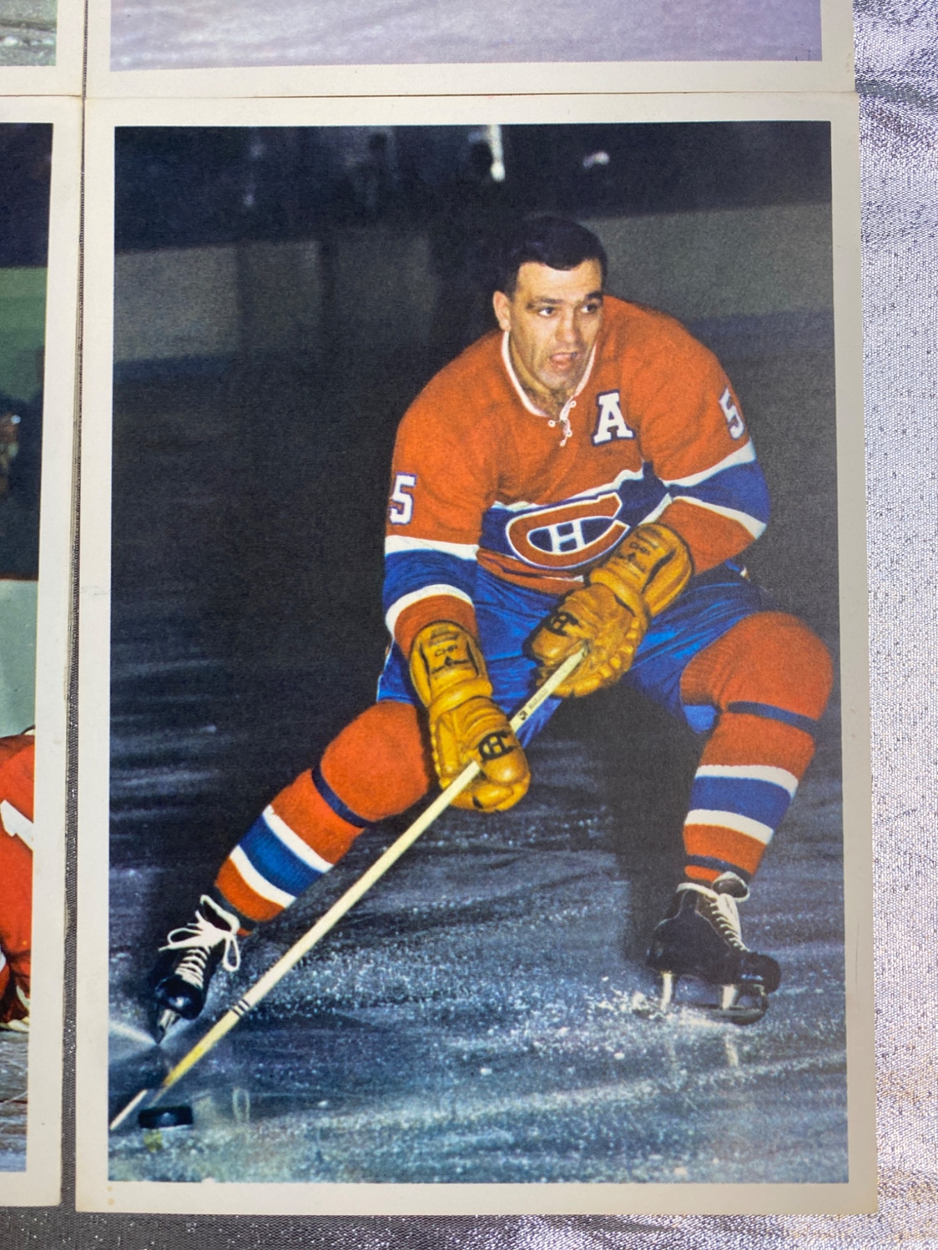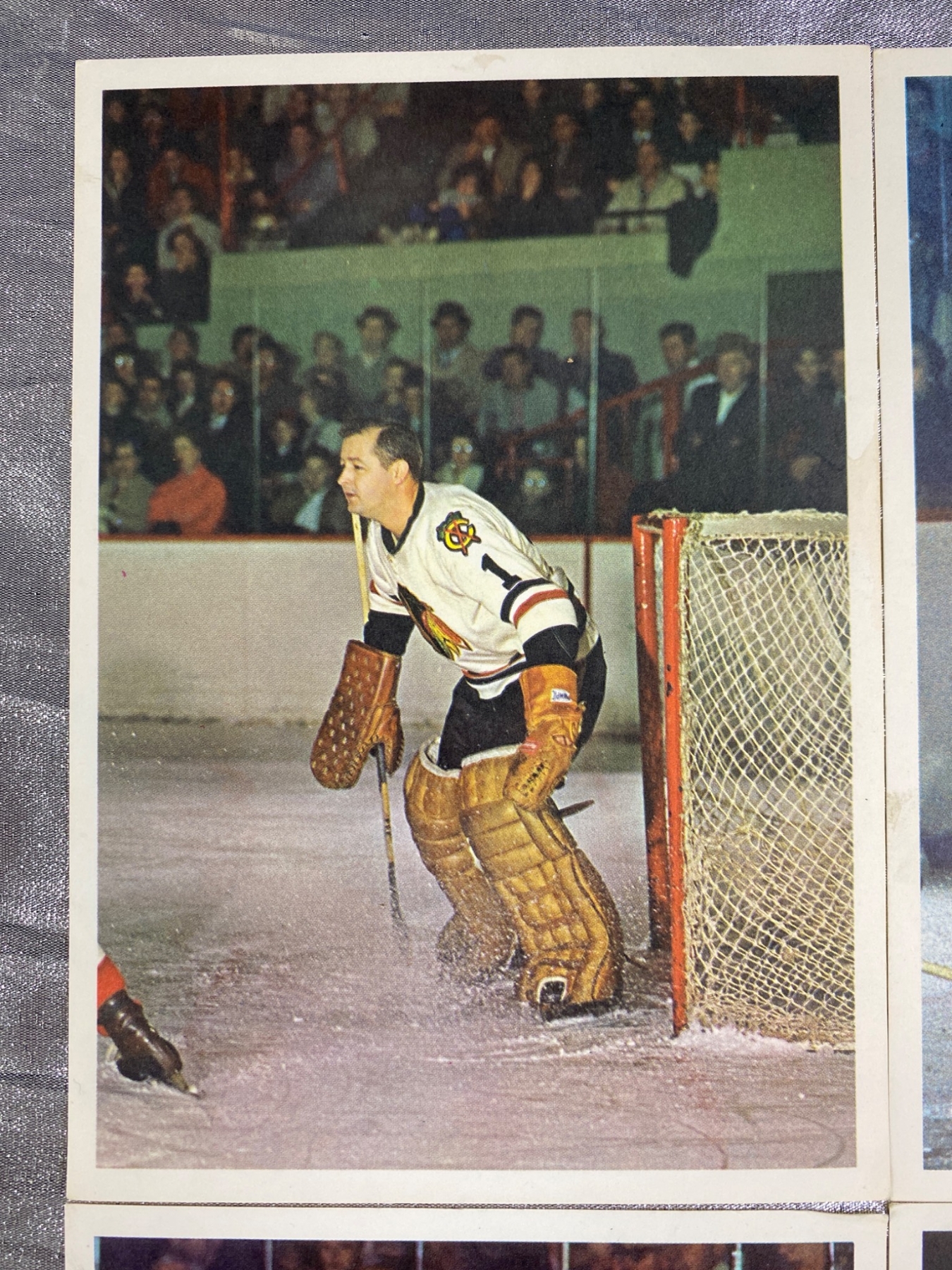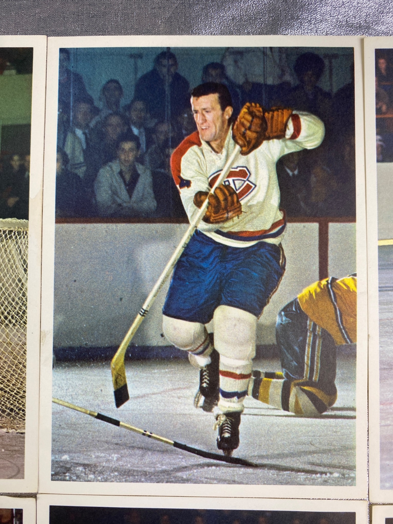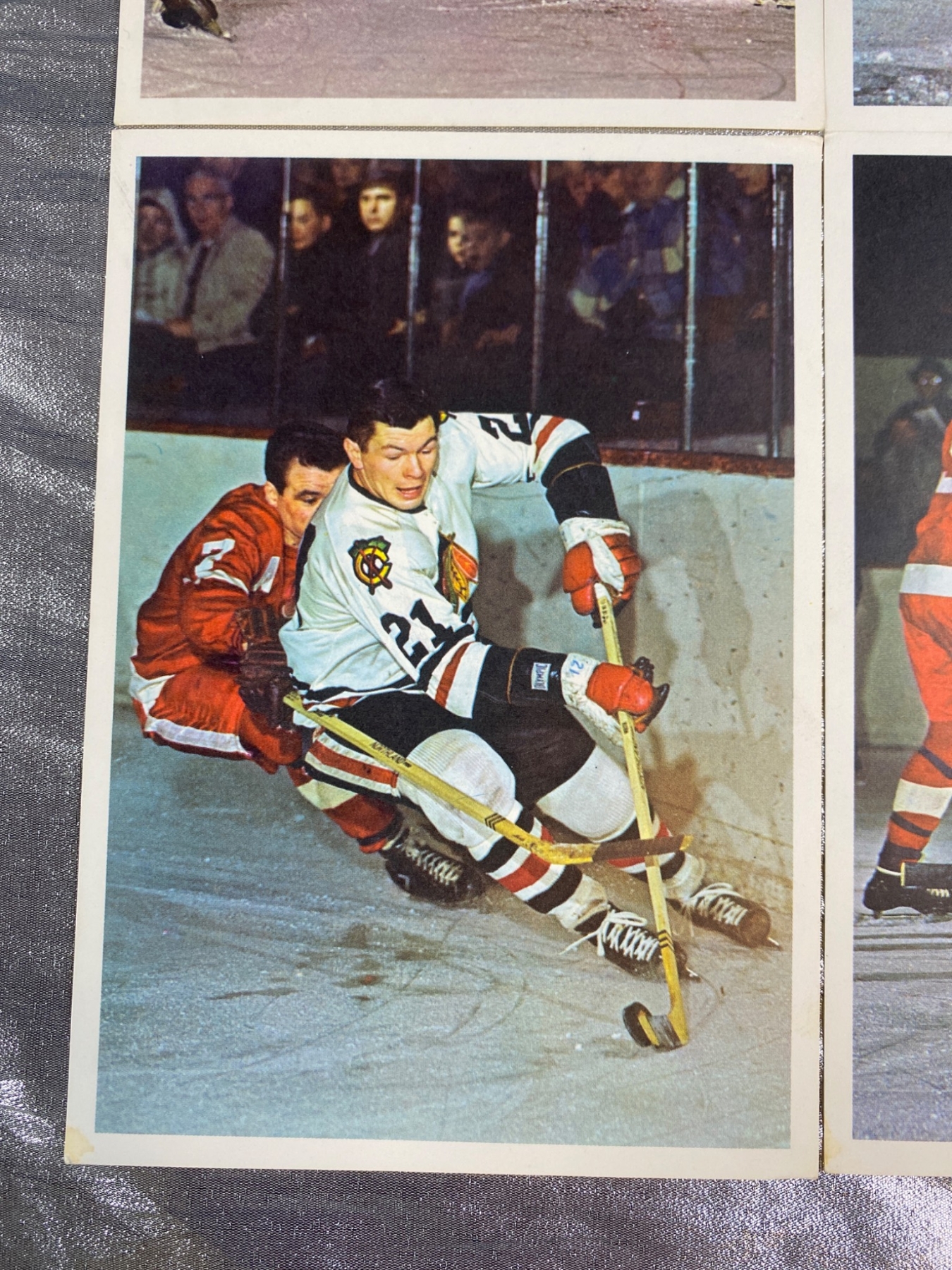Six collectible postcards showcasing 1960s ice hockey players in action. Each card captures vivid gameplay moments, including goalkeeping, skating, and stick handling. Colors are bright, and the cards maintain consistent detailing. Light wear consistent with age is visible. Perfect for hockey enthusiasts or sports memorabilia collectors.