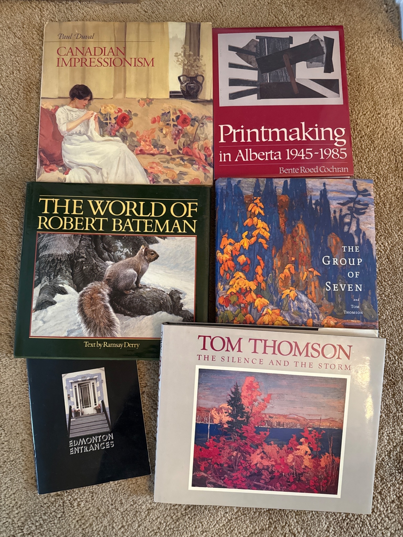 Six Canadian art books, highlighting themes in Canadian Impressionism, printmaking, and iconic artists including Robert Bateman, Tom Thomson, and The Group of Seven. Each book offers visual inspiration and insights into Canadian art history. The books are in various formats and sizes, ideal for collectors or art enthusiasts.