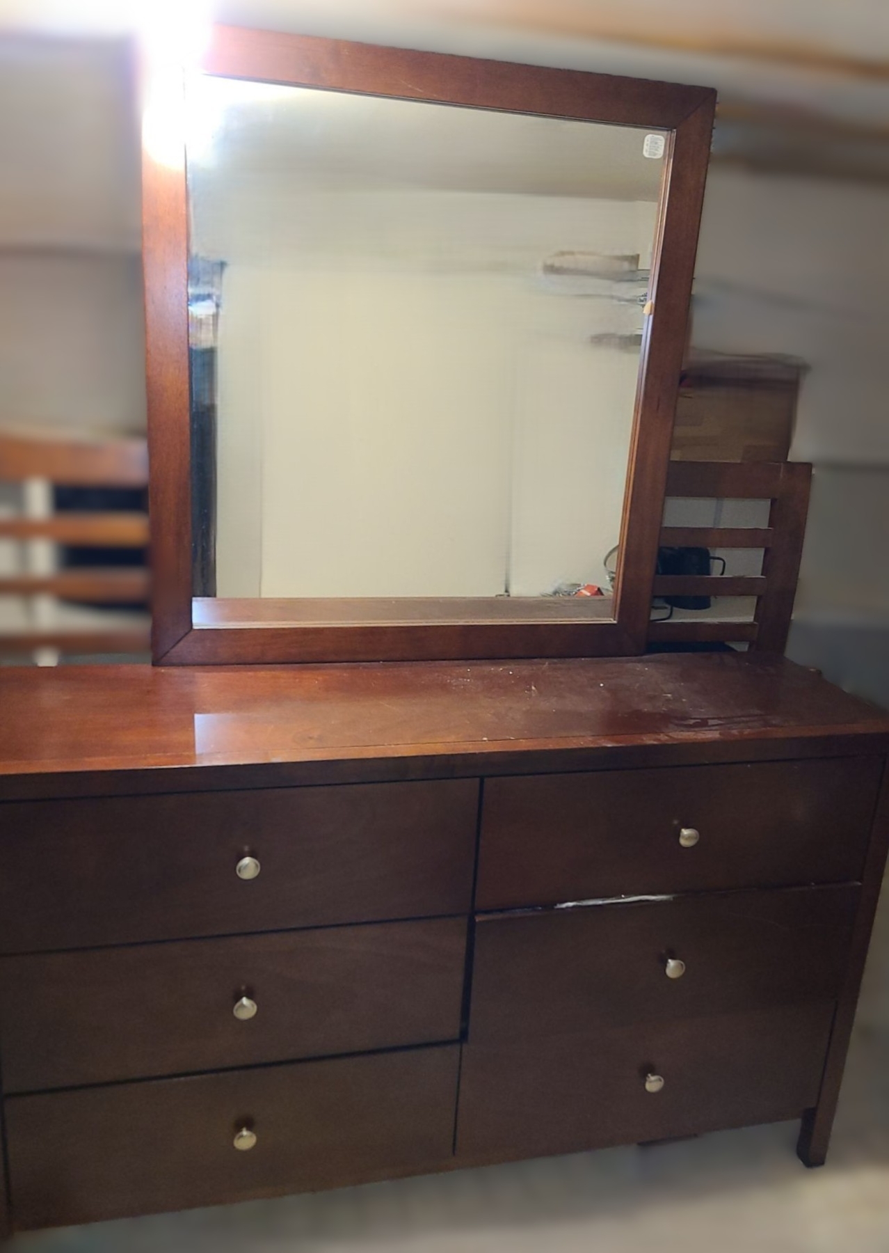 Six Drawer Dresser 58 W, 16.5 D, 38.5 T, Attached Mirror 37 x 39.5, Rails 63W, 50 T Head, 33 Foot