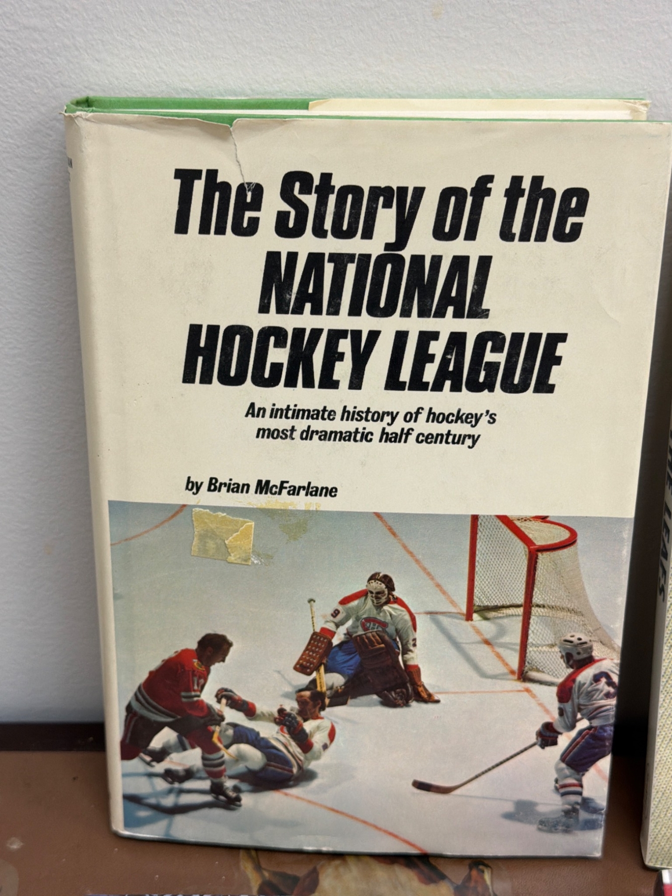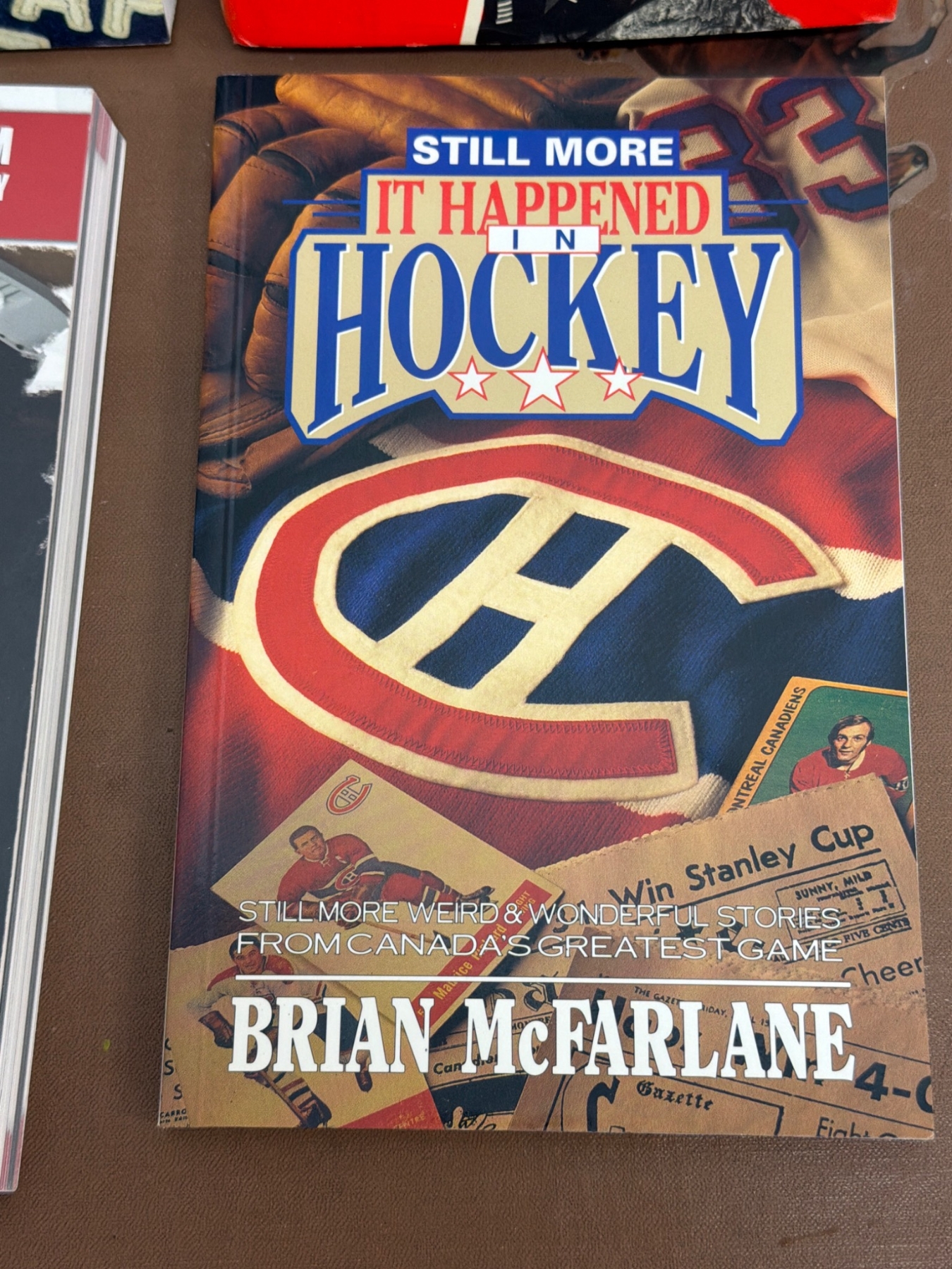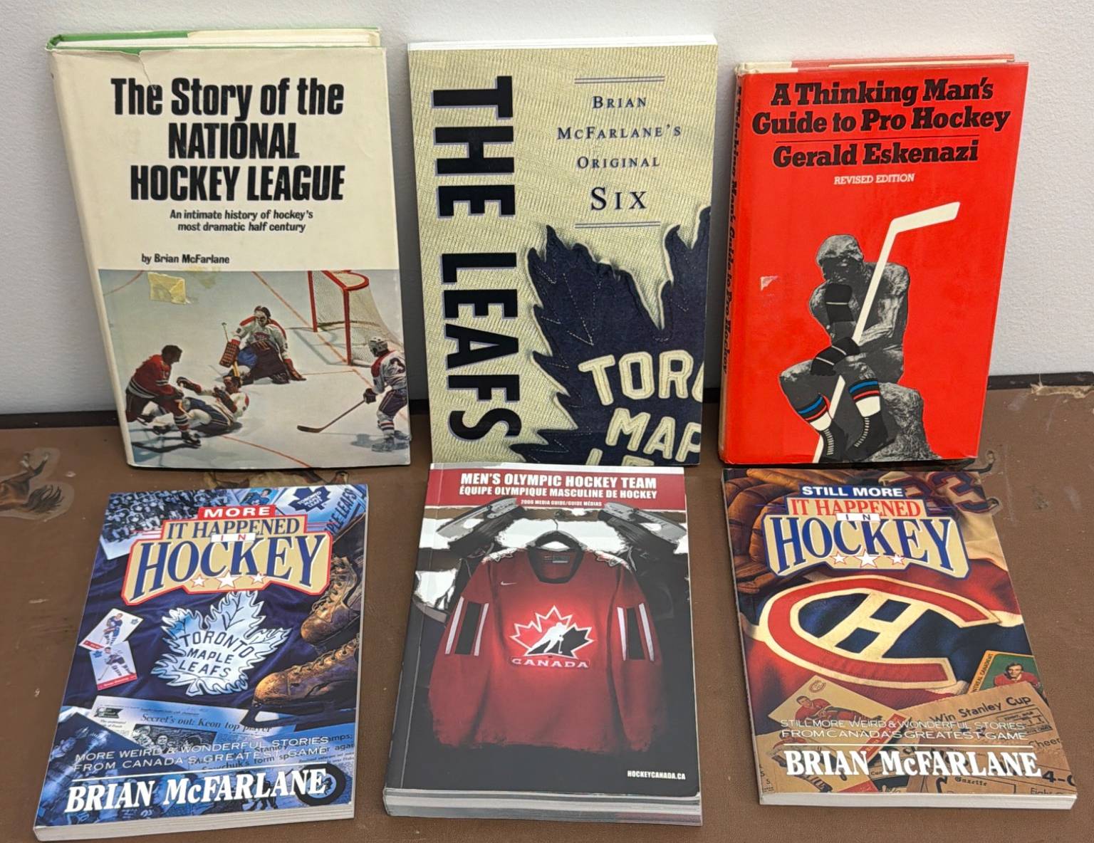 Six books focused on hockey-themed stories, history, and commentary. Titles include 'The Story of the National Hockey League' by Brian McFarlane, 'The Leafs: McFarlane's Original Six,' 'A Thinking Man's Guide to Pro Hockey' by Gerald Eskenazi, 'Still More It Happened in Hockey' and 'More It Happened in Hockey,' both by Brian McFarlane, and two additional titles highlighting hockey history and teams. Condition varies.