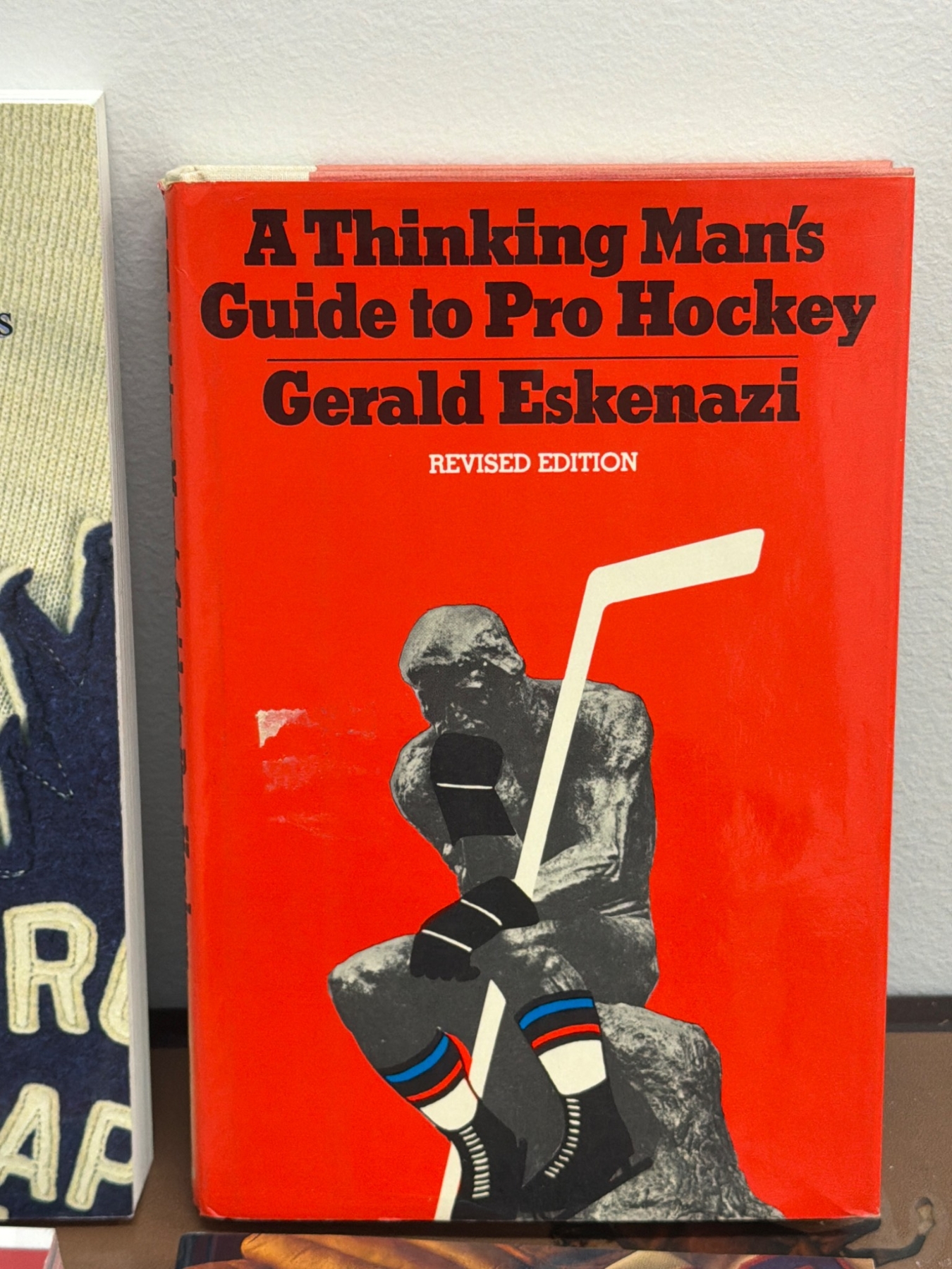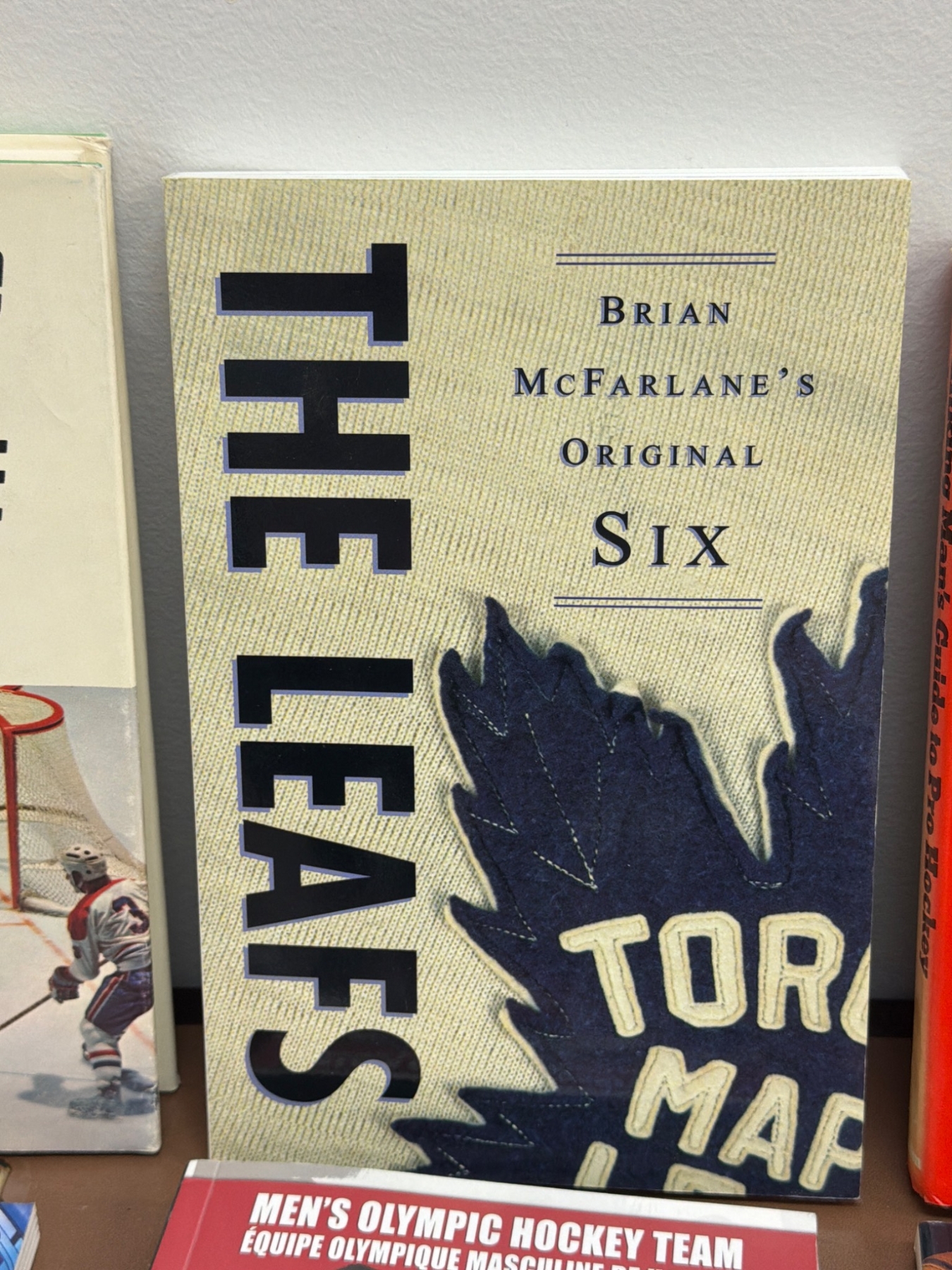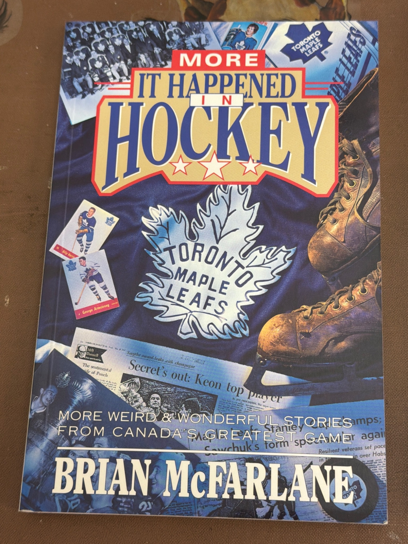 Six books focused on hockey-themed stories, history, and commentary. Titles include 'The Story of the National Hockey League' by Brian McFarlane, 'The Leafs: McFarlane's Original Six,' 'A Thinking Man's Guide to Pro Hockey' by Gerald Eskenazi, 'Still More It Happened in Hockey' and 'More It Happened in Hockey,' both by Brian McFarlane, and two additional titles highlighting hockey history and teams. Condition varies.