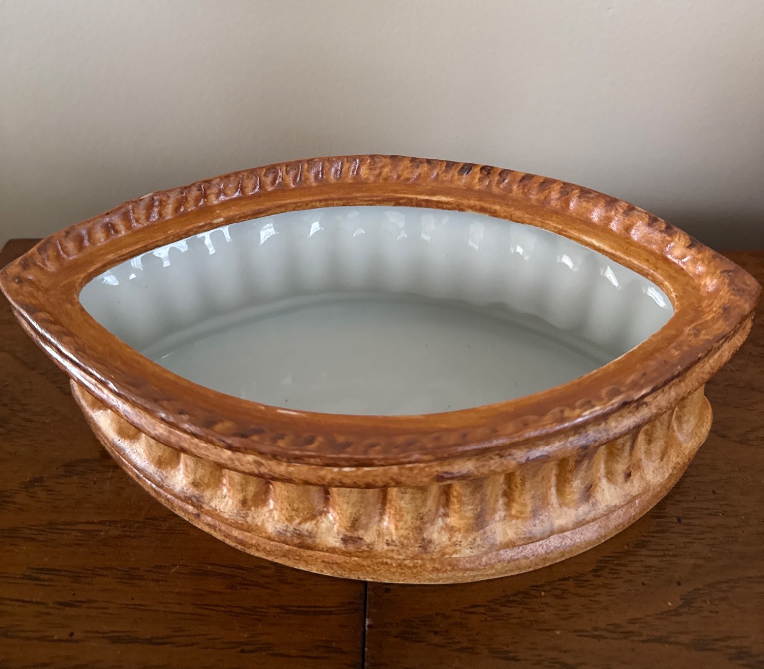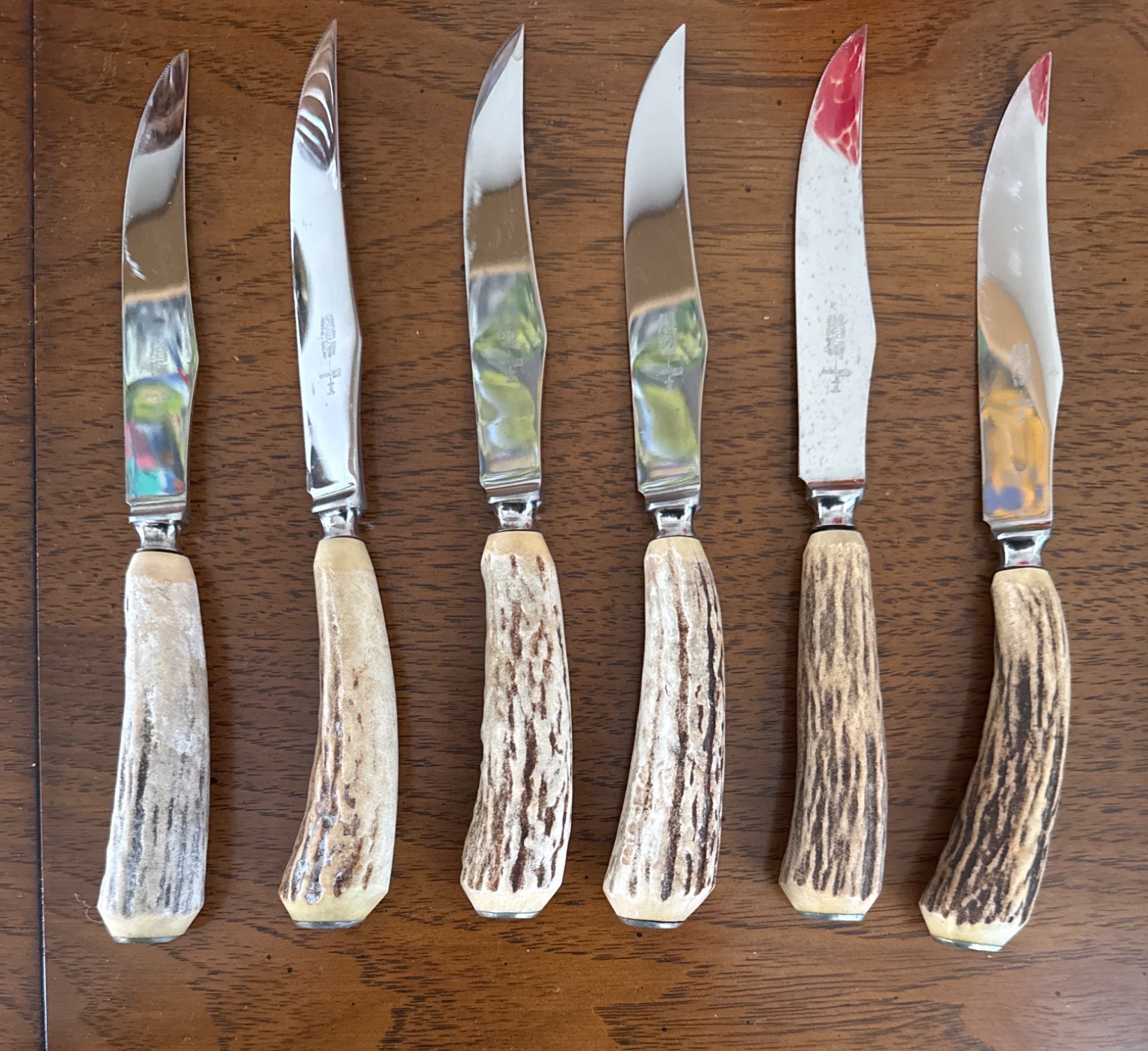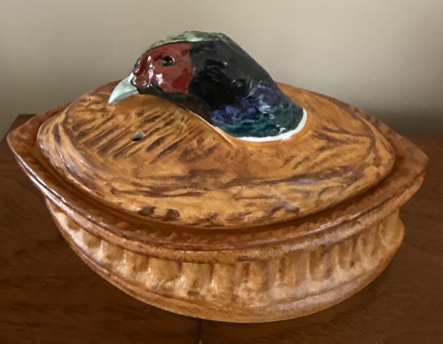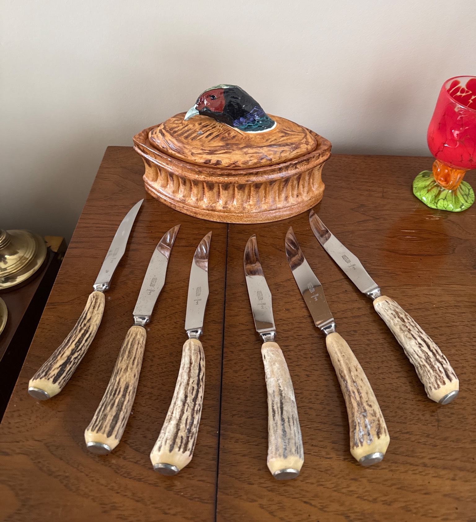 Six knives with stag horn handles and stainless steel blades, perfect for collectors or functional table use. Also included is a charming ceramic covered dish with a pheasant motif on the lid, featuring a glossed interior for convenient use. Knives measure approximately 8 inches in length, while the dish measures roughly 9 inches long and 6 inches wide. Both items are in good condition.