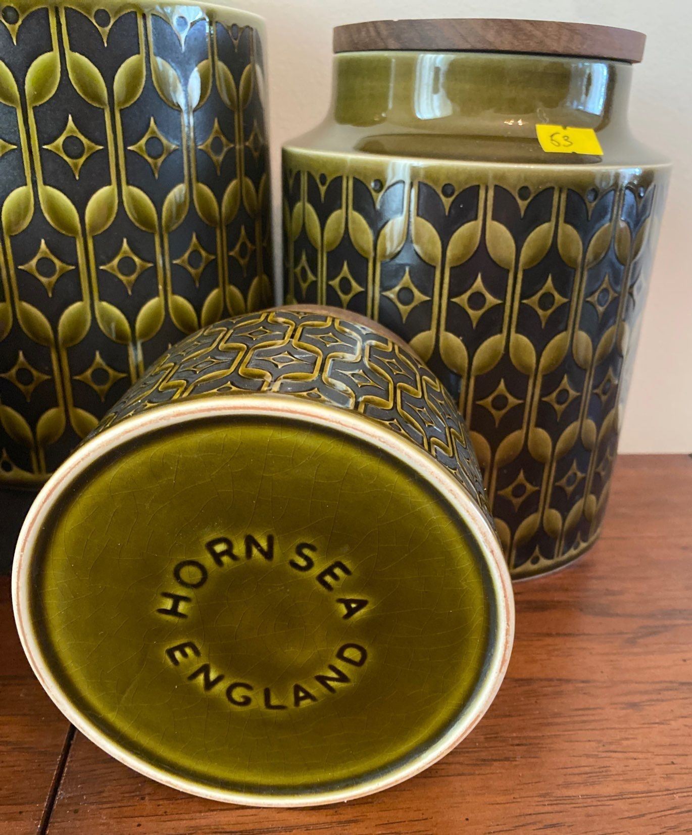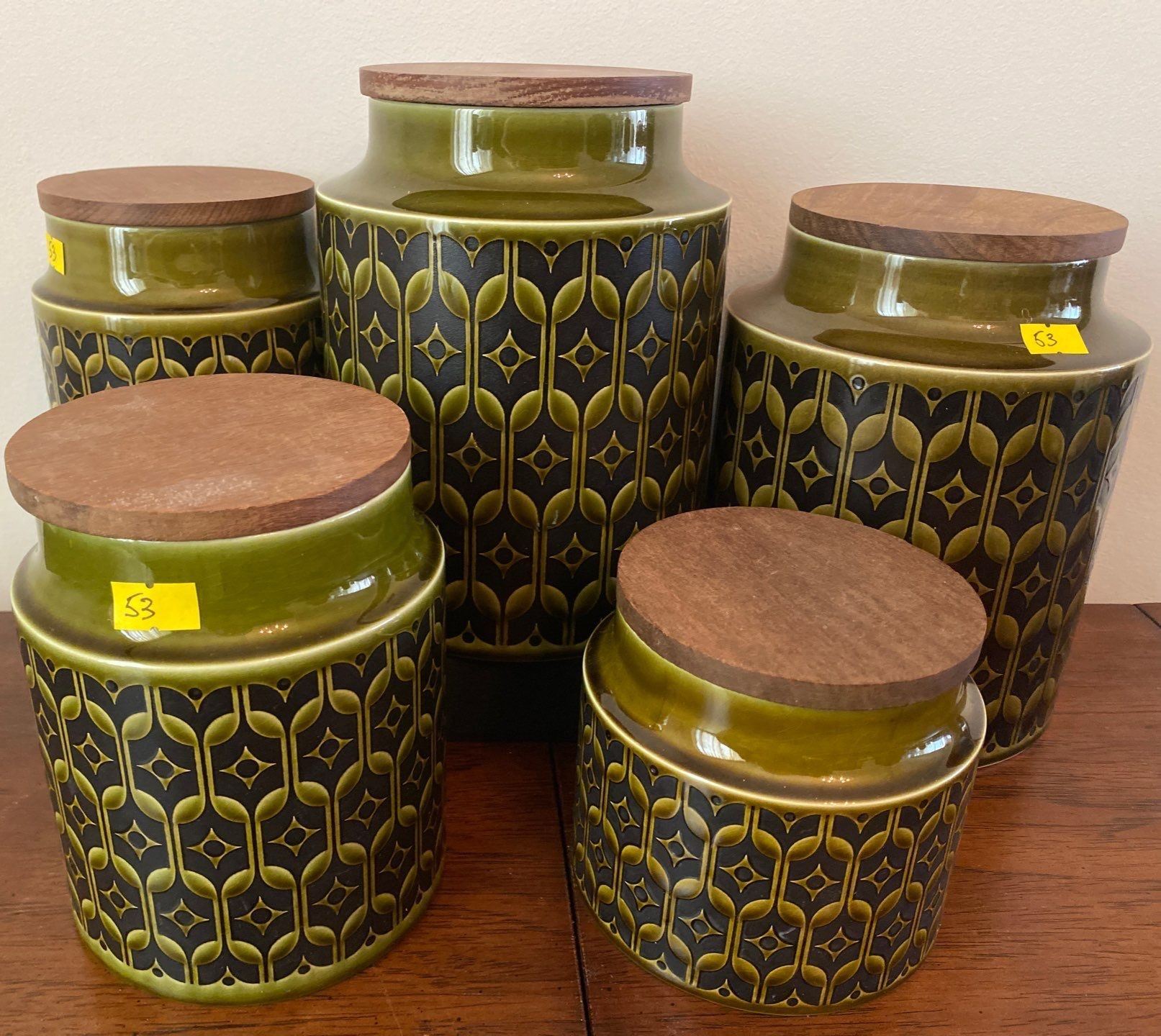 Six Unique Vintage Wood Top Glass Canister Set Hornsea England
