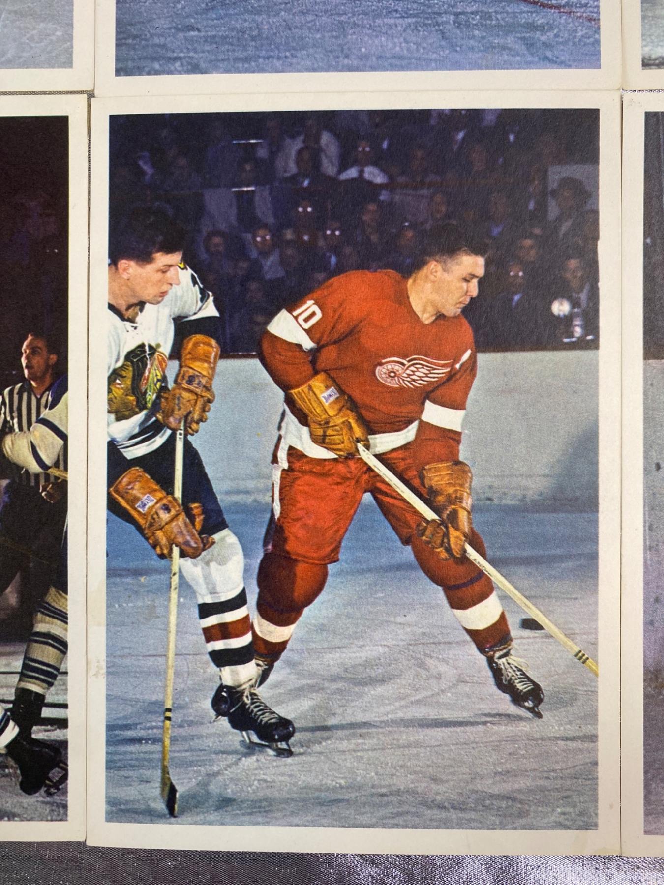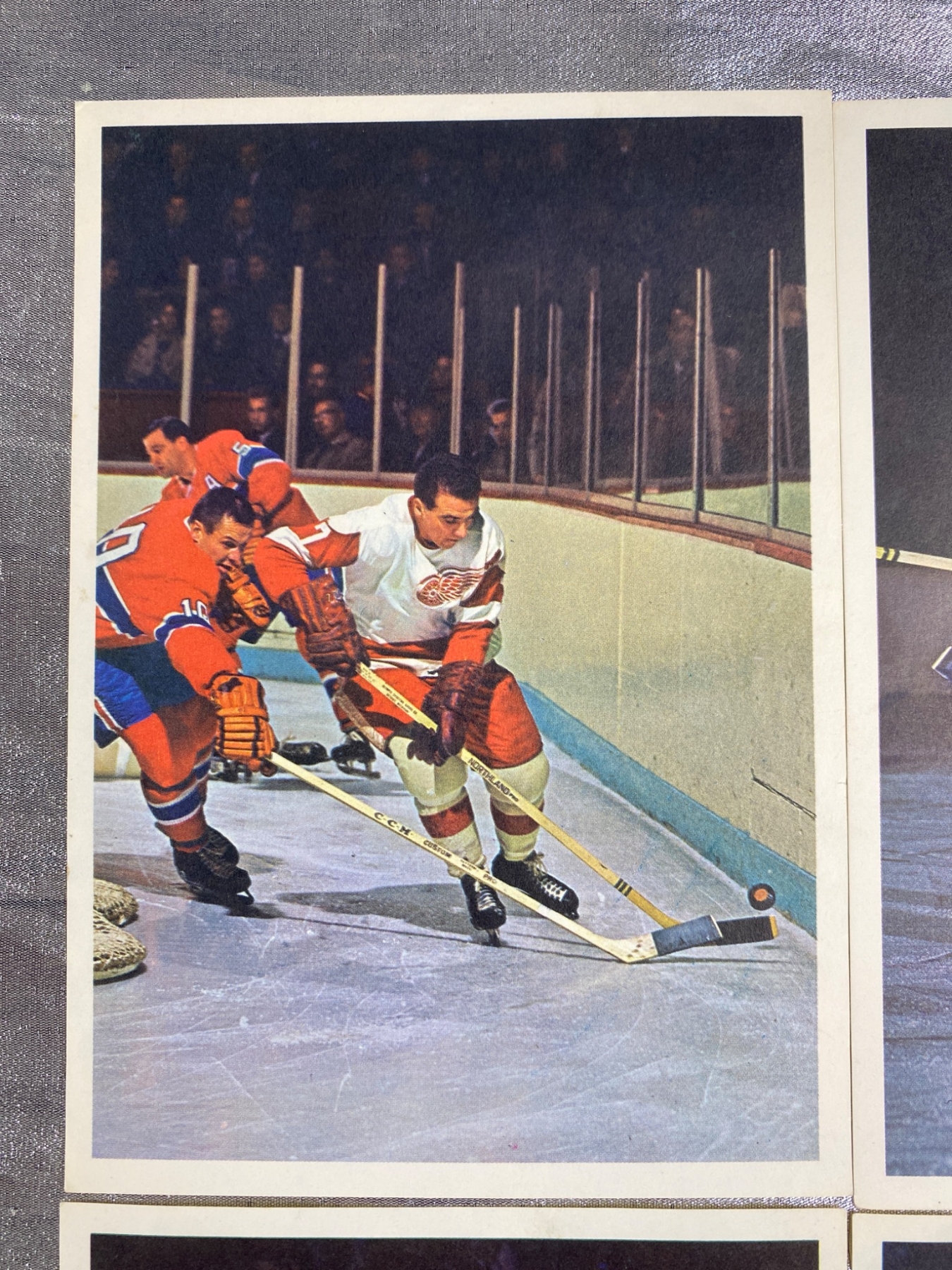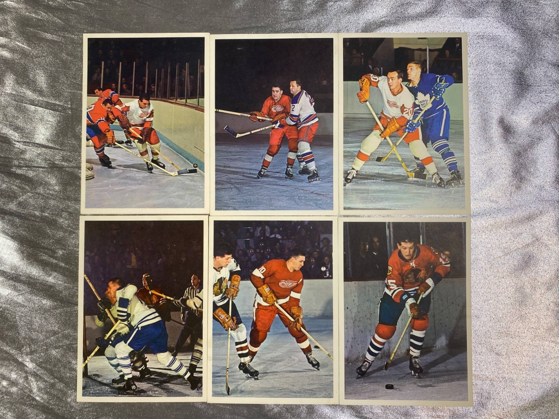 Six color-printed ice hockey postcards showcasing live-action moments from NHL games, featuring players from historic teams like Detroit Red Wings, Toronto Maple Leafs, and Chicago Blackhawks. Each postcard captures intricate on-ice gameplay with vibrant details, appealing for NHL fans and sports memorabilia collectors. Cards appear in overall good condition with no major visible damage.