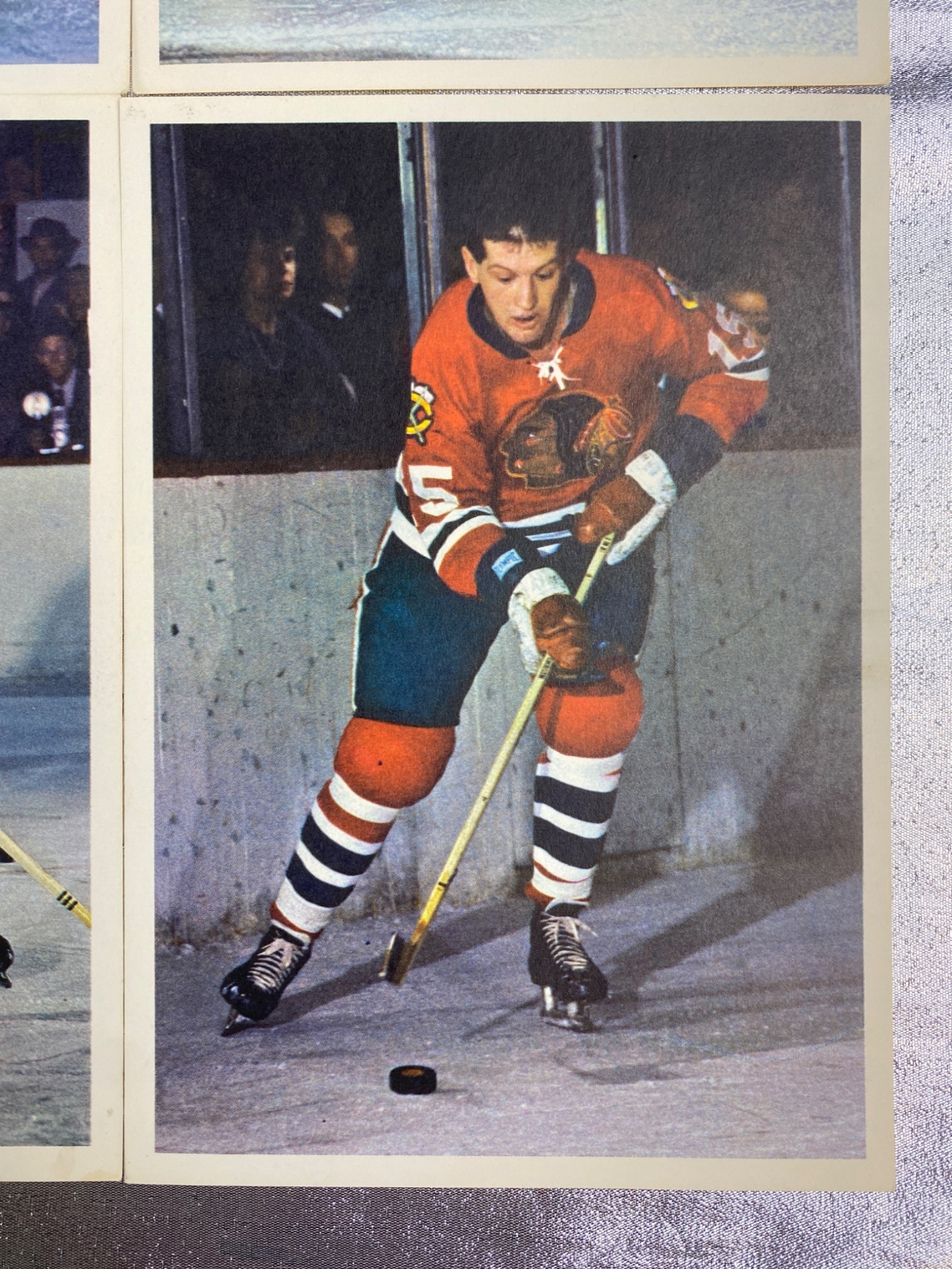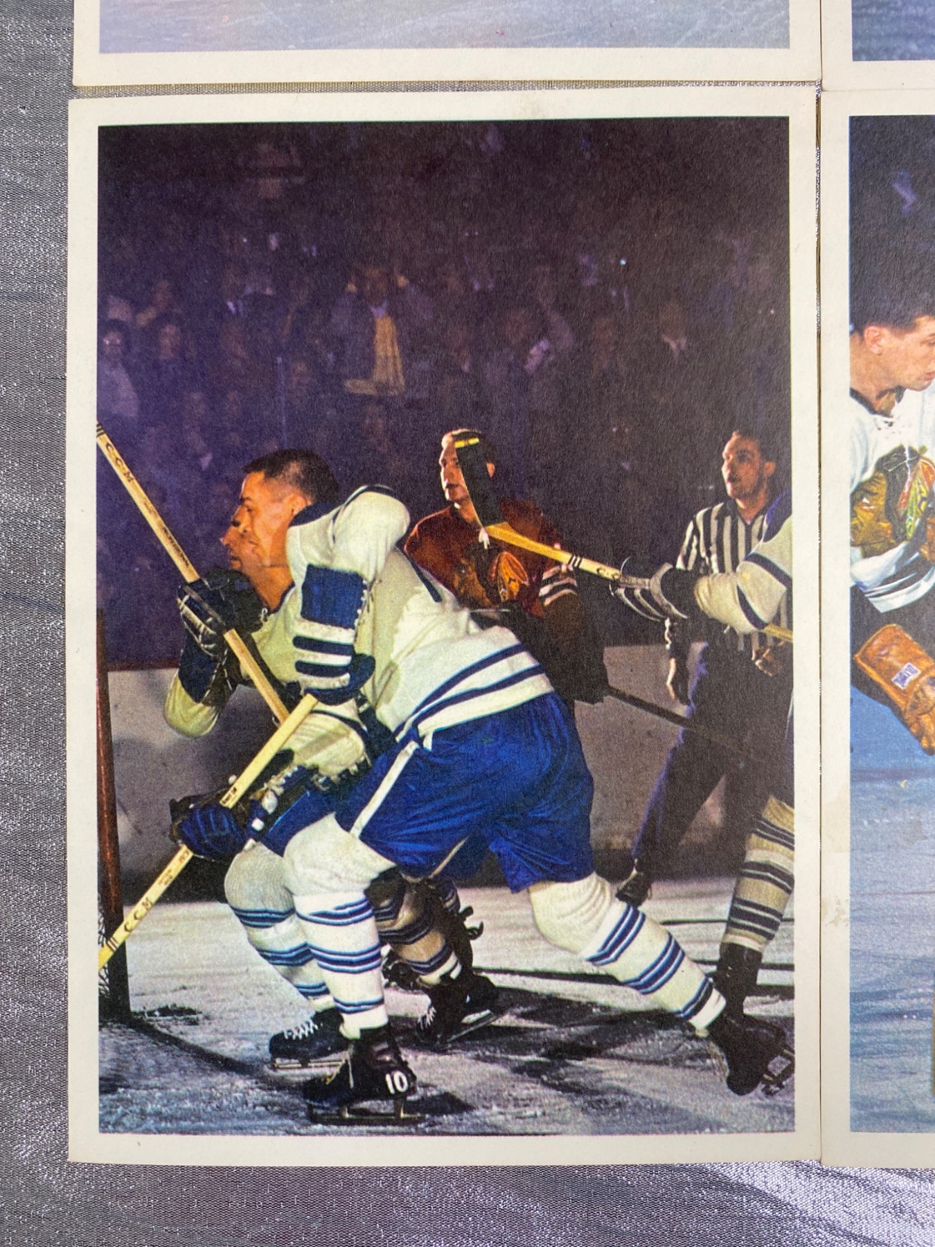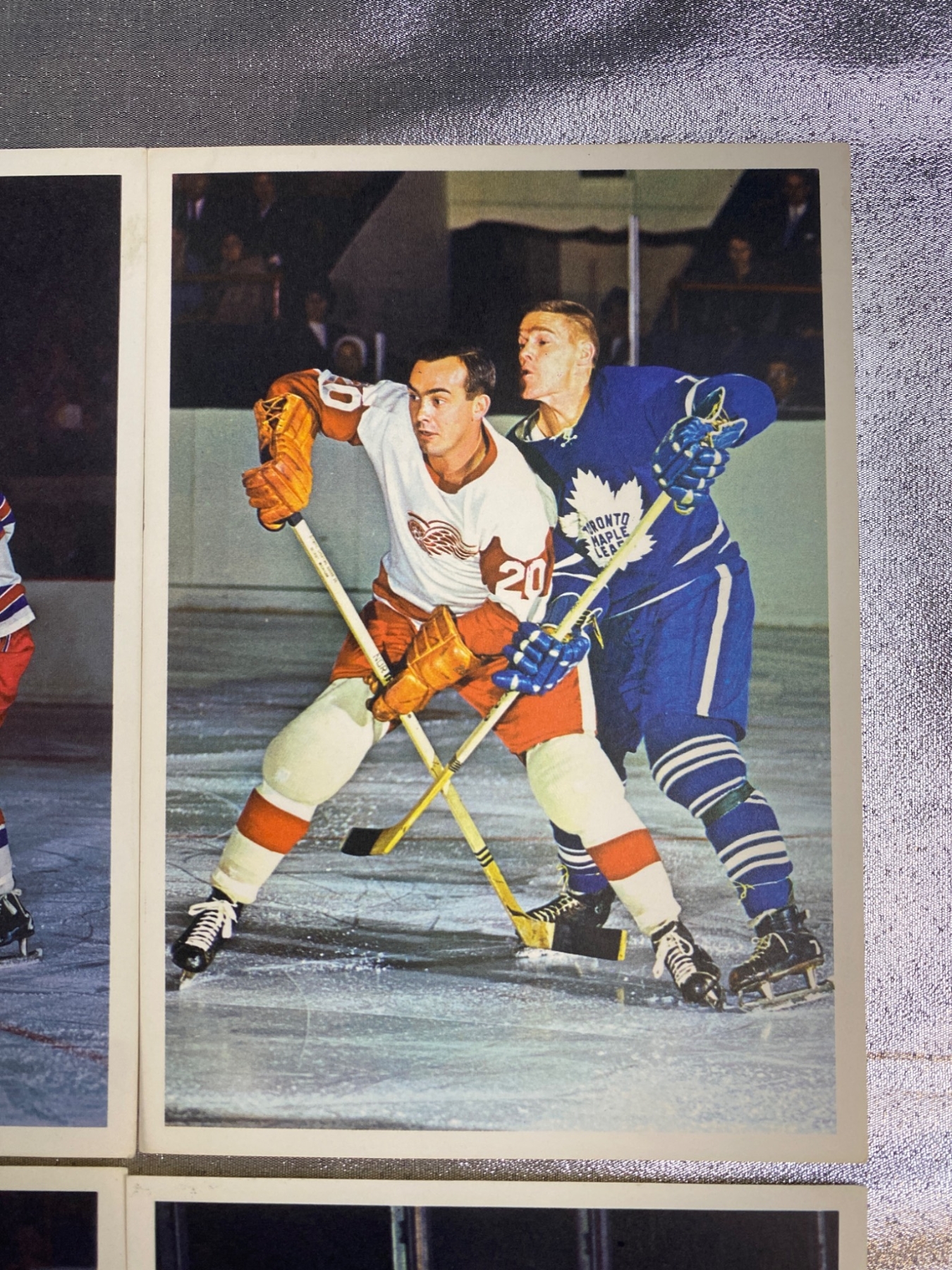 Six color-printed ice hockey postcards showcasing live-action moments from NHL games, featuring players from historic teams like Detroit Red Wings, Toronto Maple Leafs, and Chicago Blackhawks. Each postcard captures intricate on-ice gameplay with vibrant details, appealing for NHL fans and sports memorabilia collectors. Cards appear in overall good condition with no major visible damage.