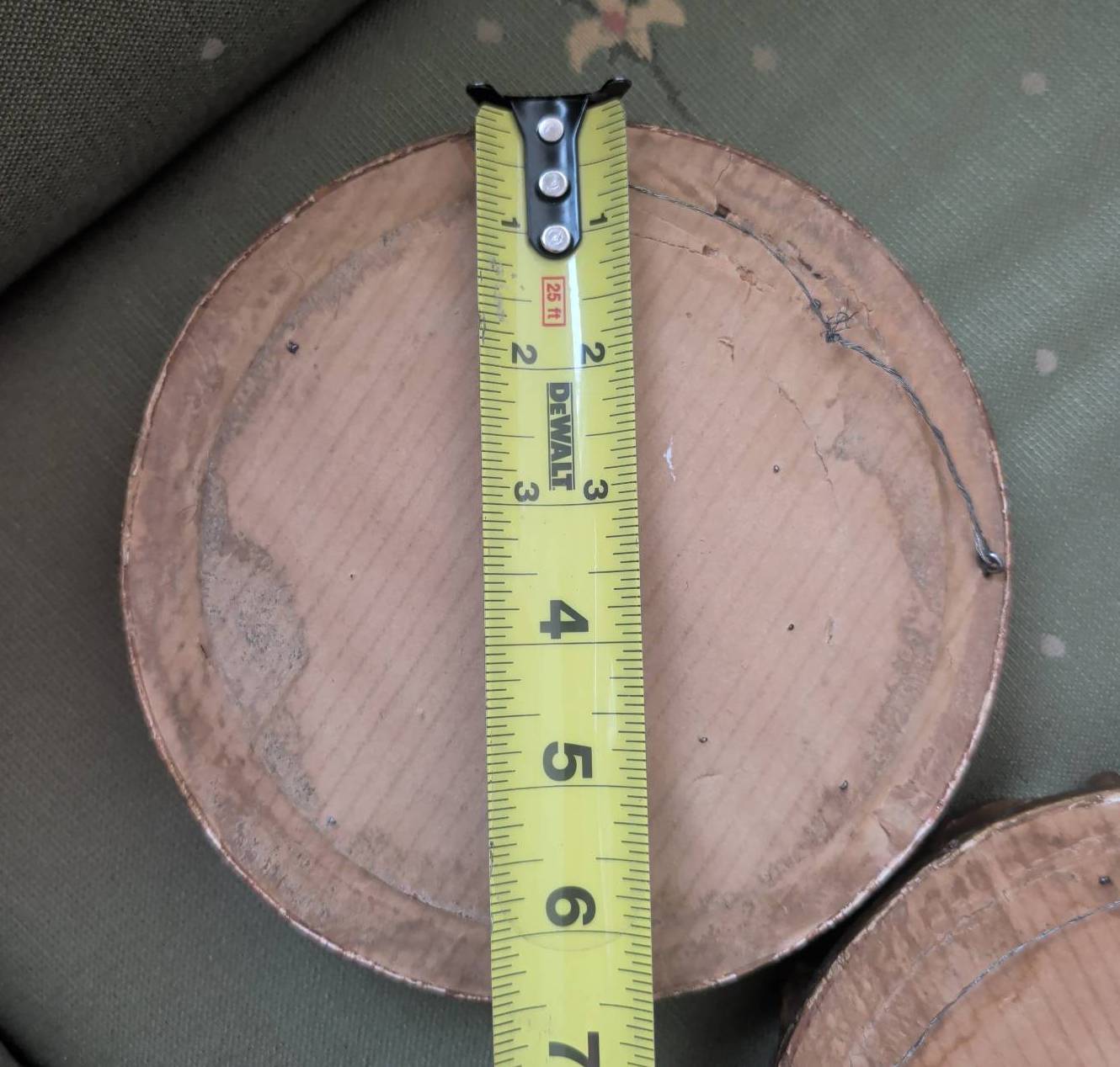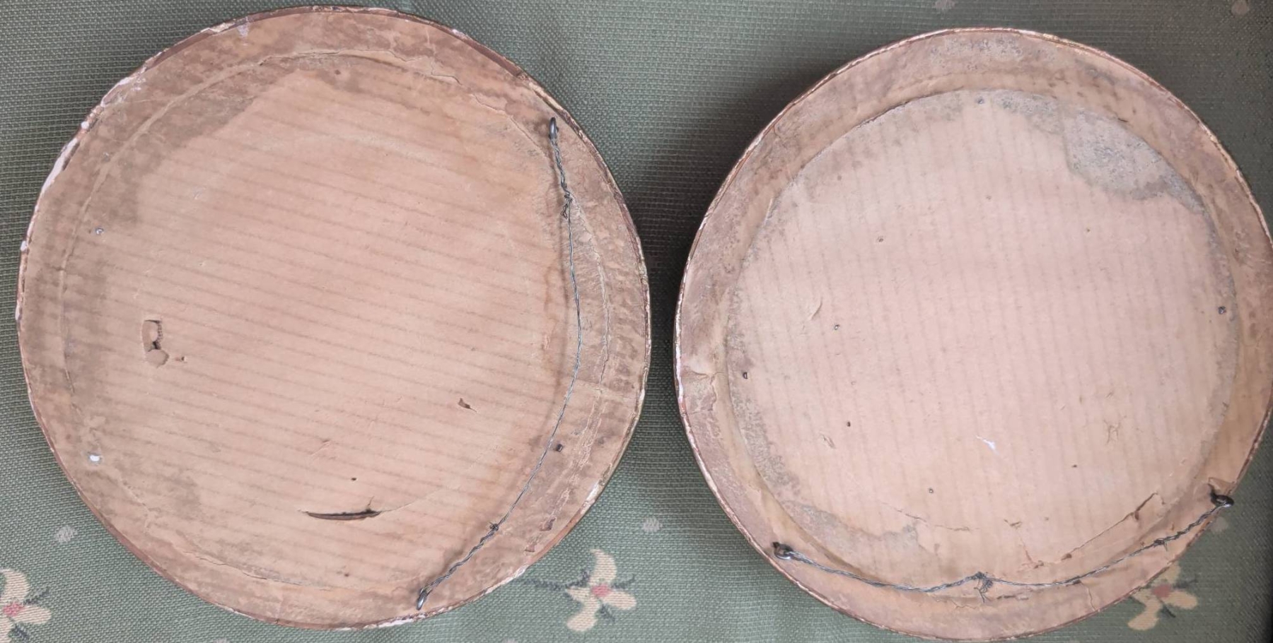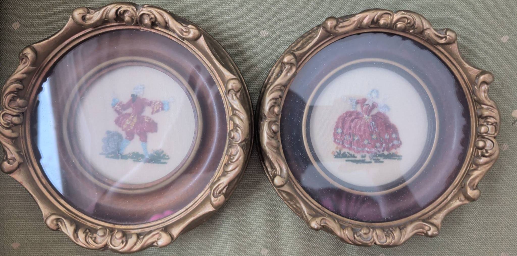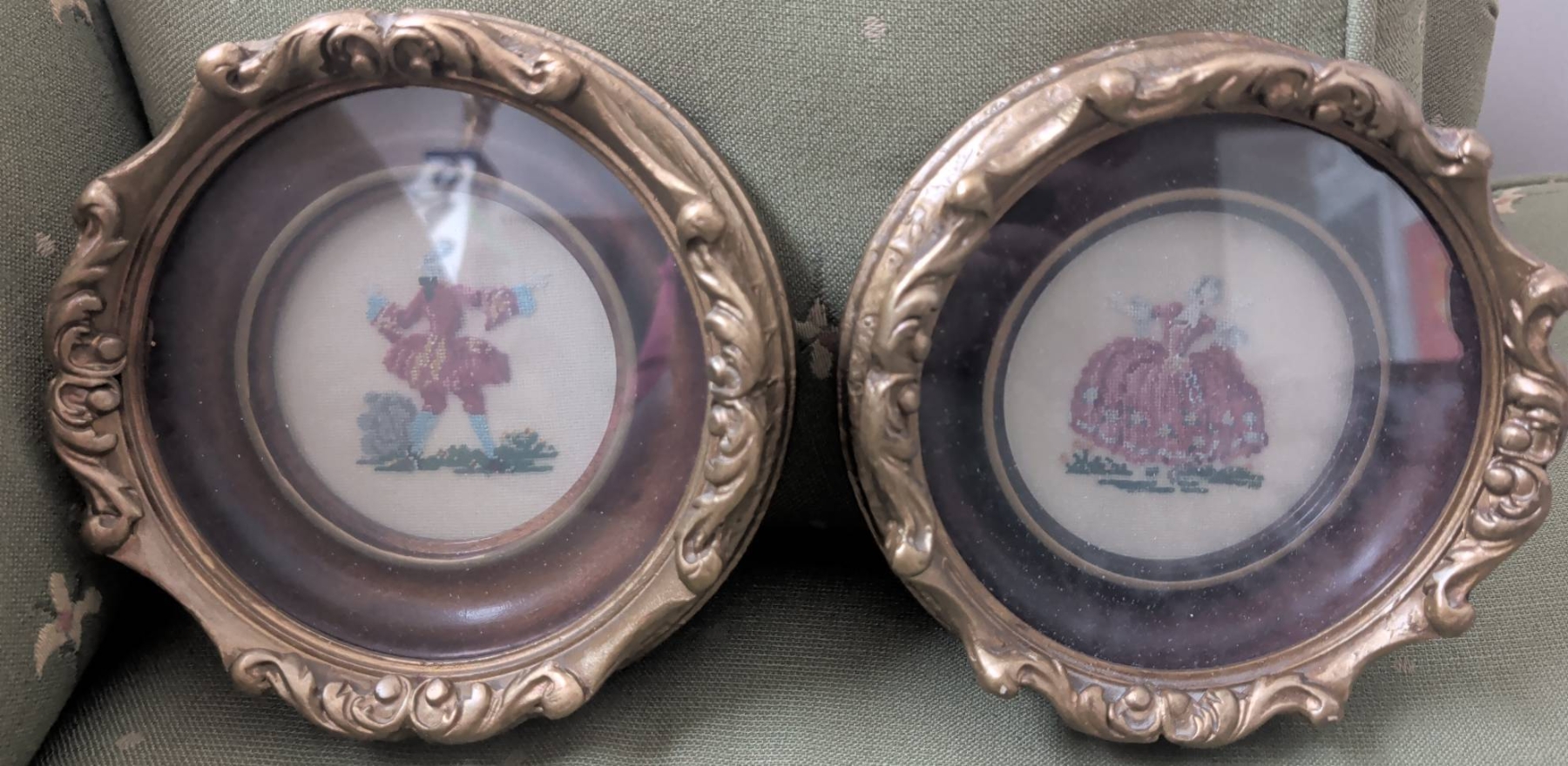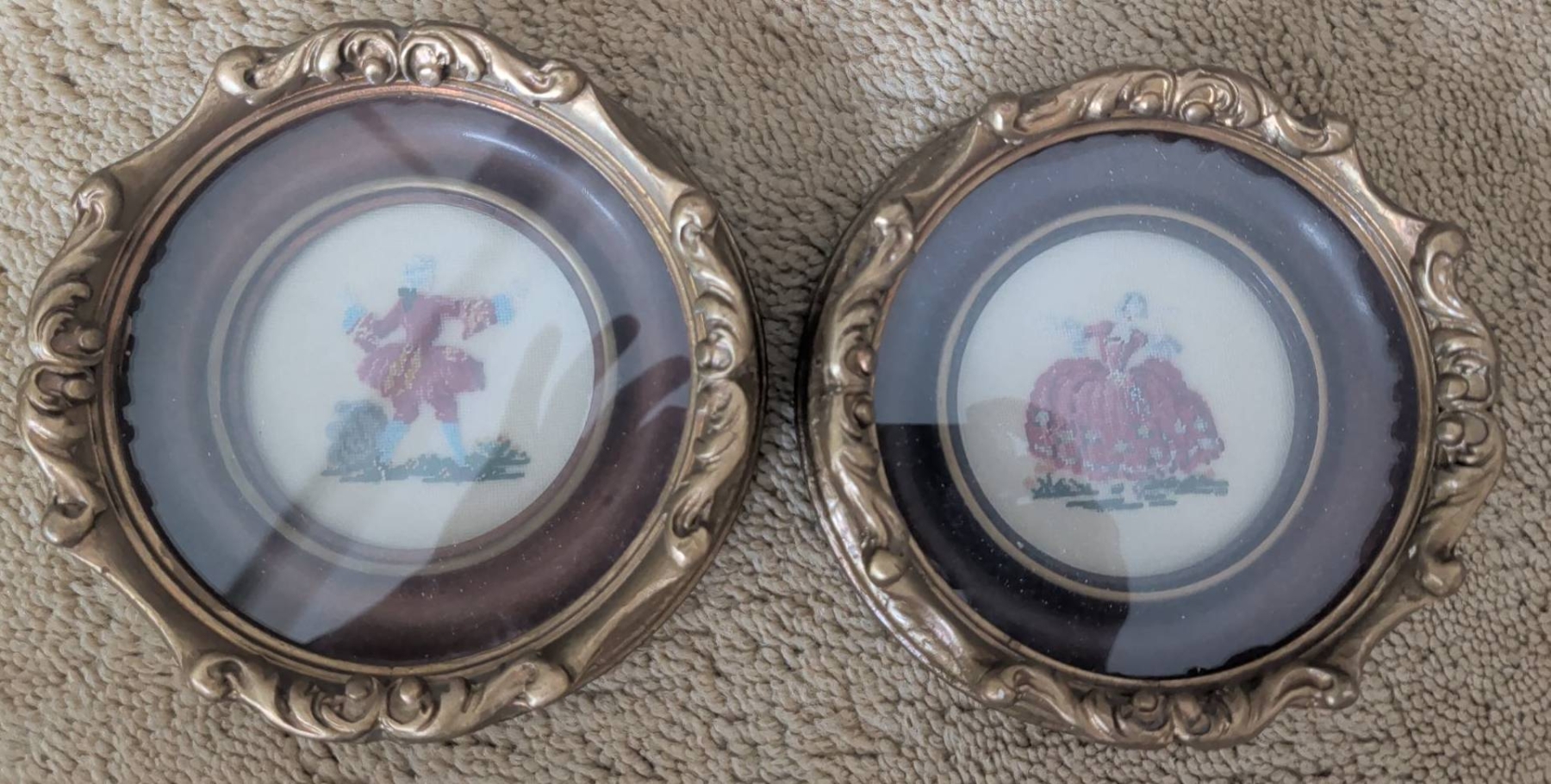 Two framed needlepoint artworks depicting figures in period attire. Each piece features an ornate circular metal frame with a gold-tone finish and protective glass covering. The frames measure approximately 4.5 inches in diameter. The backing shows signs of wear consistent with age. Perfect for collectors or as decorative wall accents.