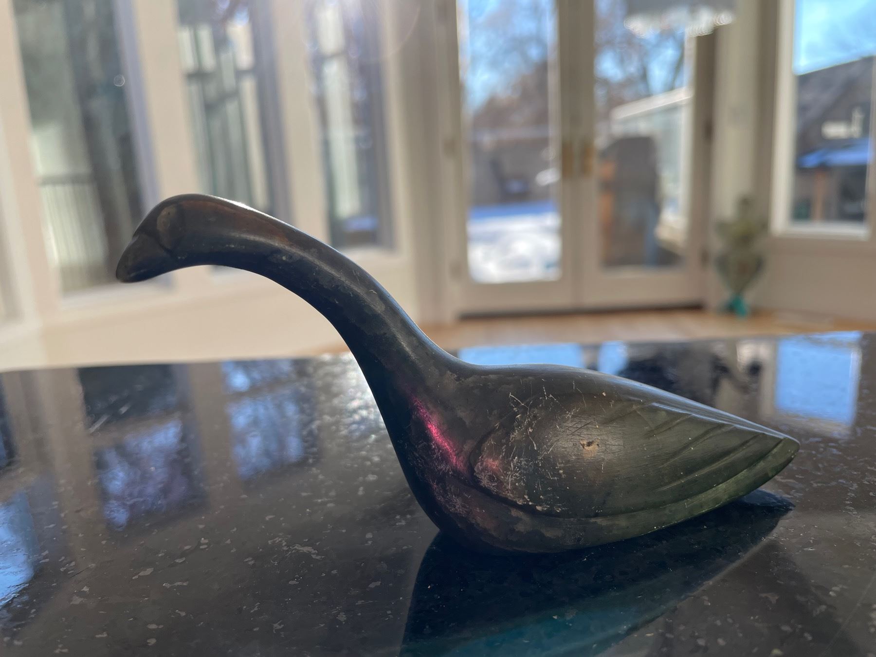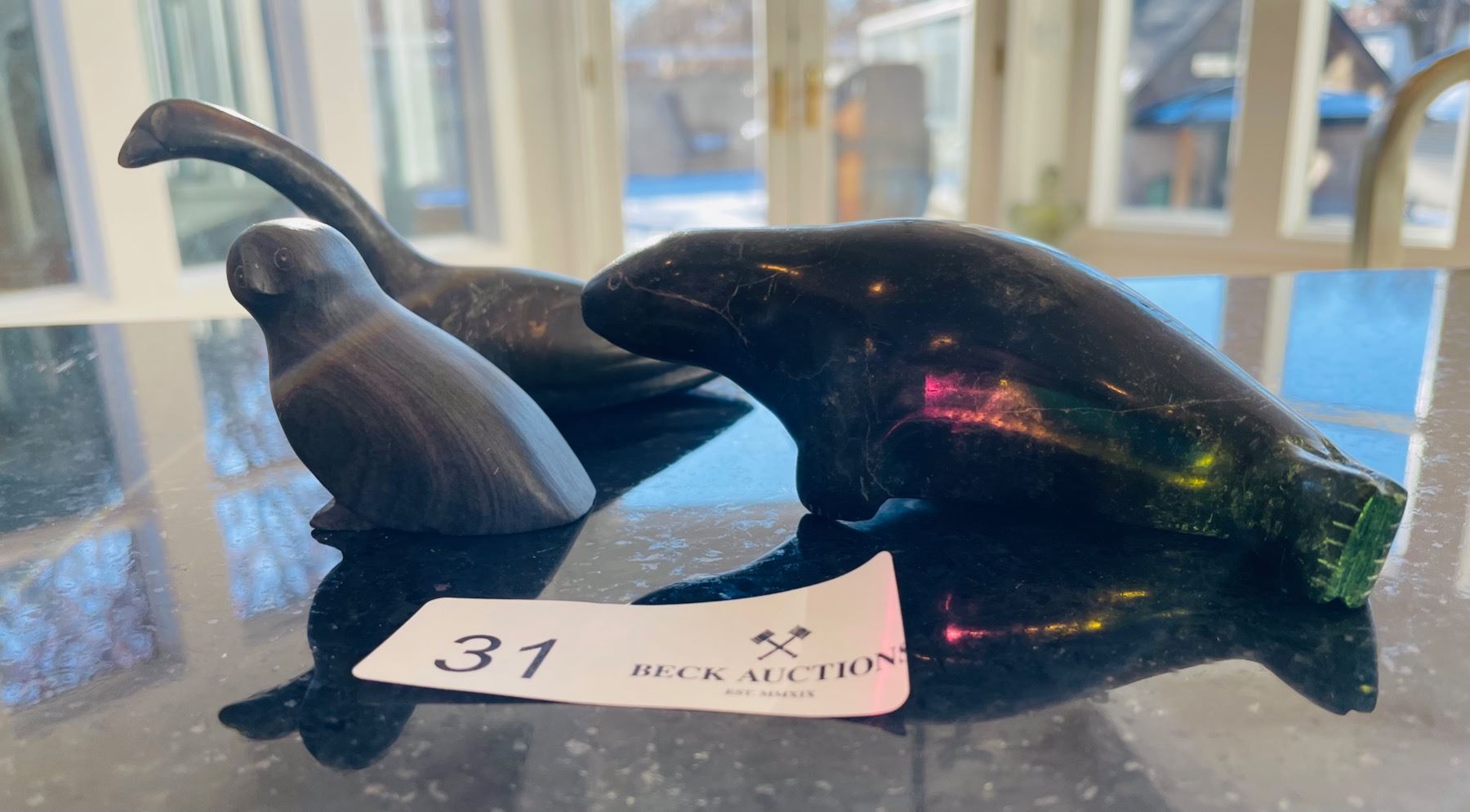 Lot of three small carvings. The nephrite swan is marked on the bottom and measures 5 inches long x 3 inches tall. The seal is 5 - 1/2 inches long x 2 inches tall.