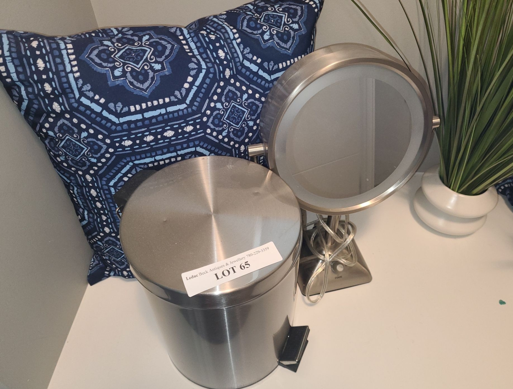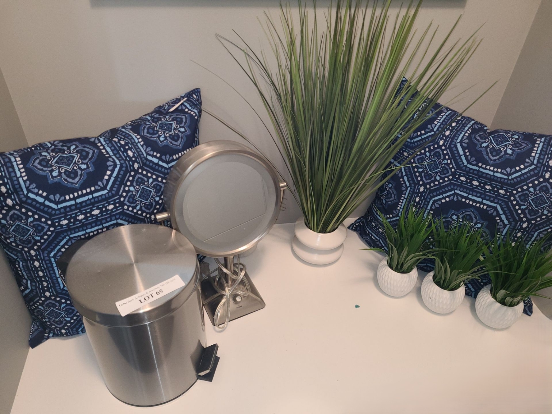 Small Trashcan 11 h,  Conair Mirror 16 h, Artificial Plants- Tallest: 26 h, Two Cushions 19 X 19