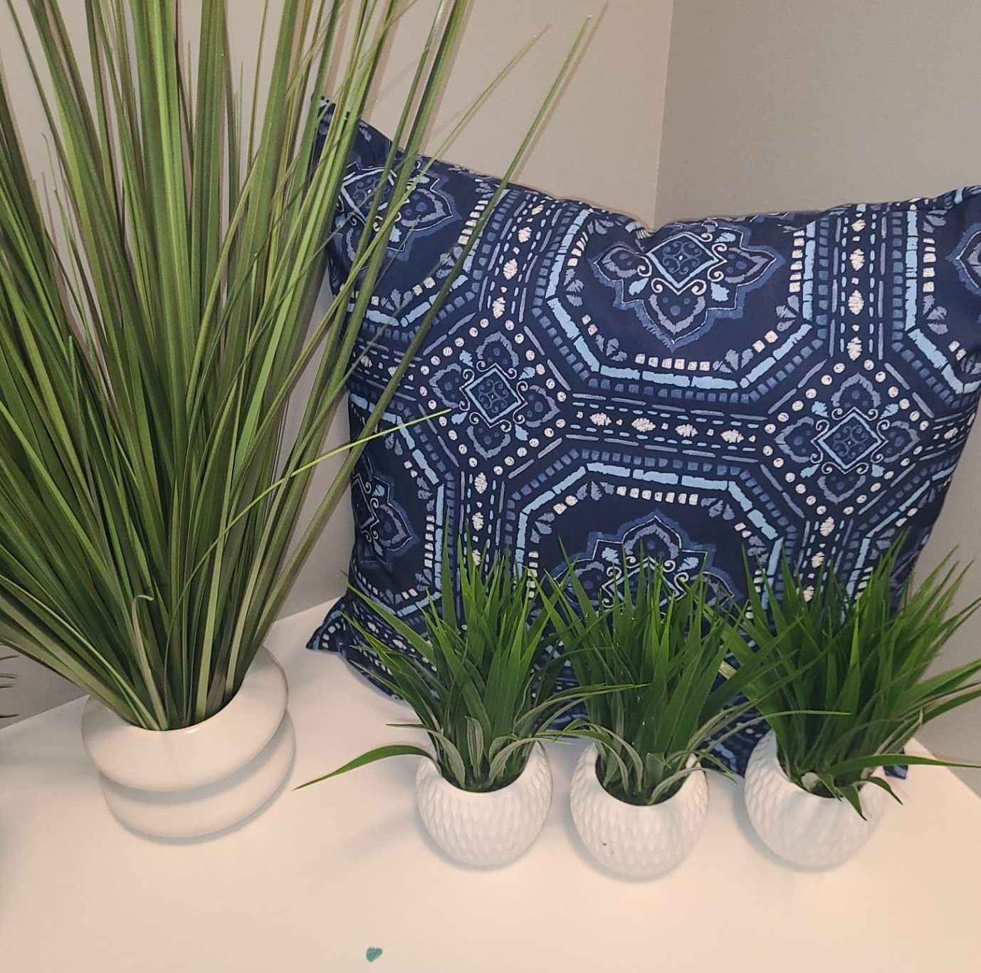 Small Trashcan 11 h, Conair Mirror 16 h, Artificial Plants- Tallest: 26 h, Two Cushions 19 X 19