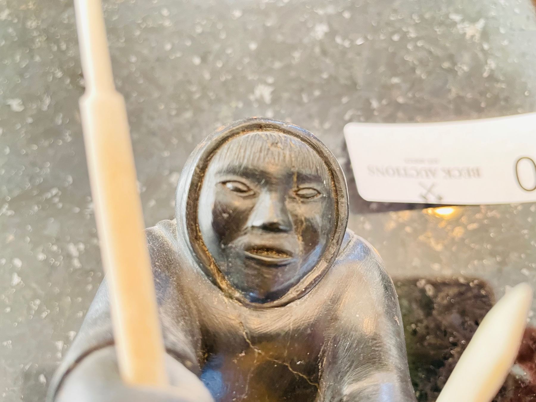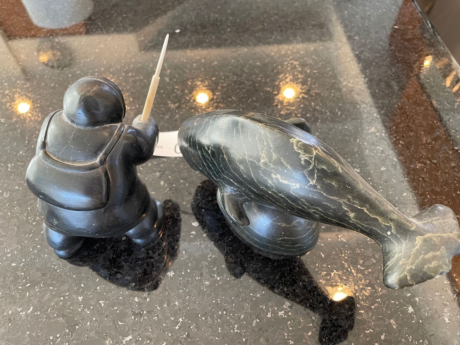 Two small signed carvings, the black stone hunter with ivory spears measures 5 inches tall x 3 inches wide. He is weighty for small size. The Nephrite Beluga whale measures 7 inches long x 4 - 1/2 inches tall. Both are at least 50 years old, likely older.