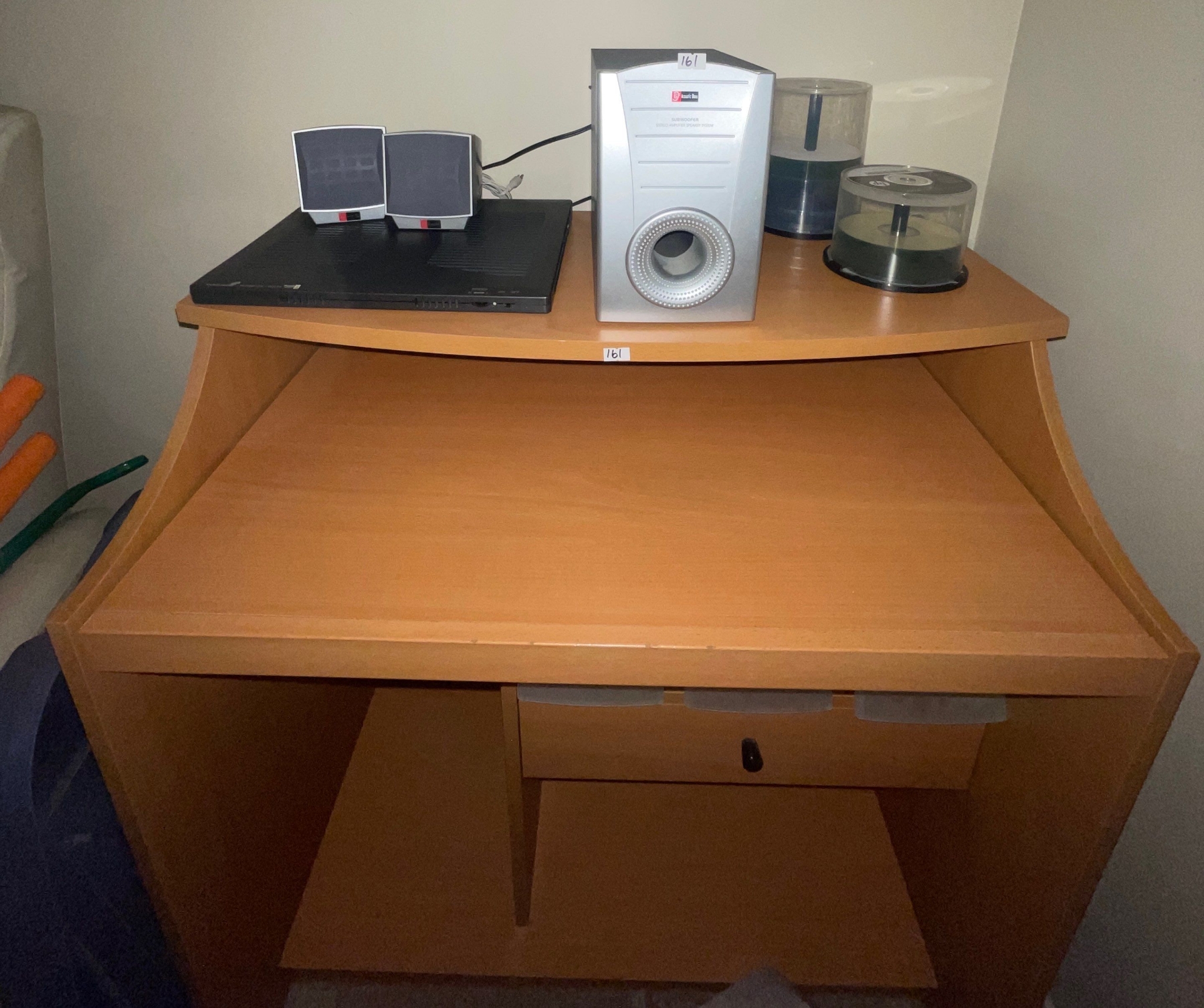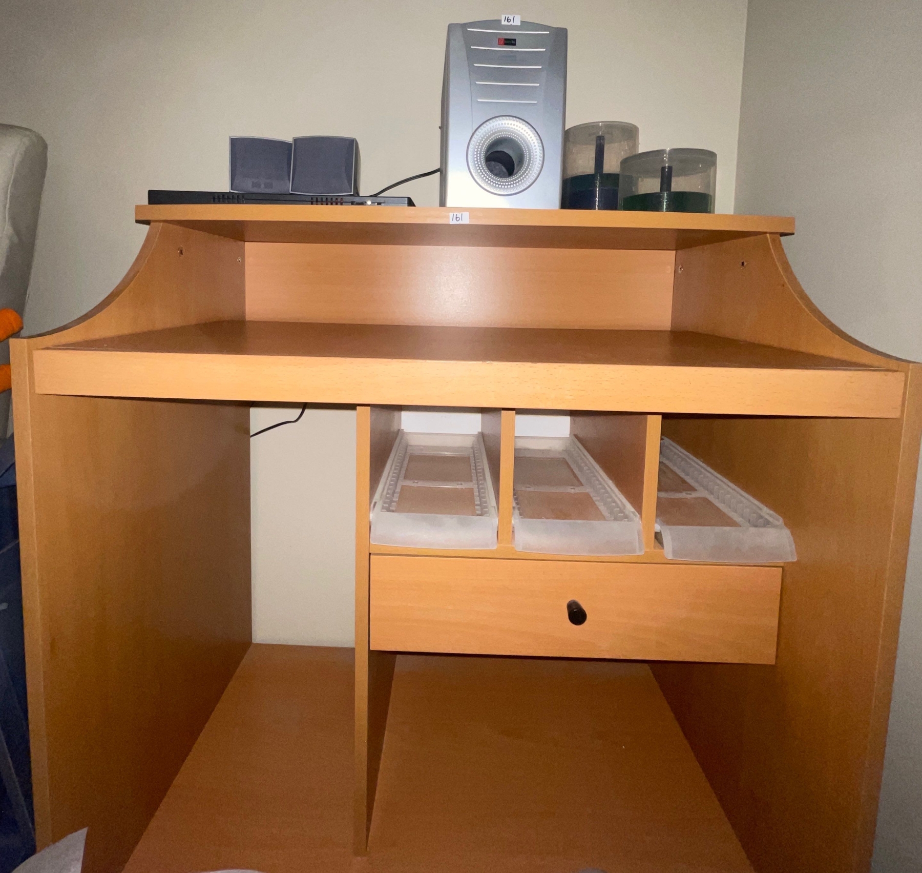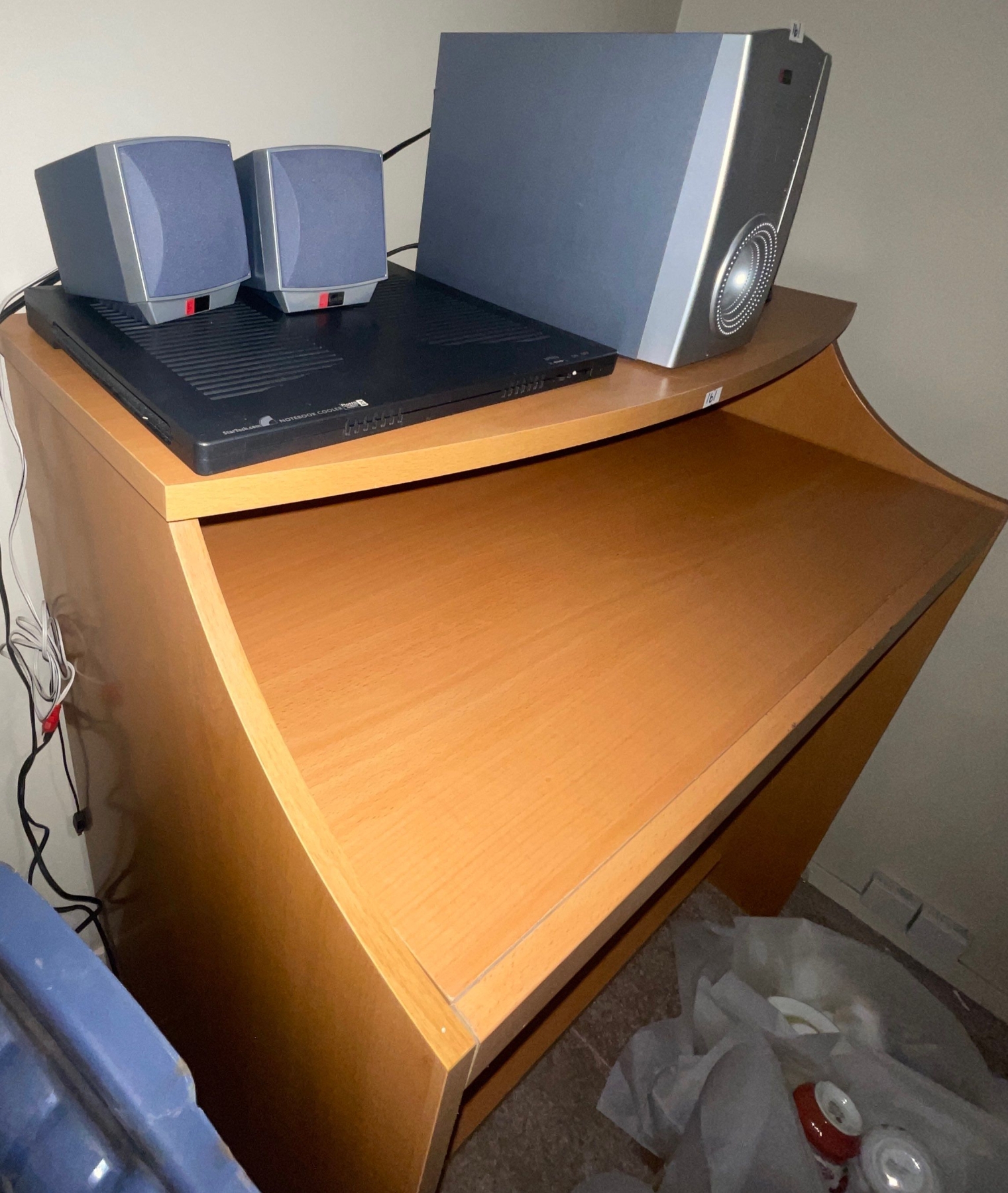 Small Wooden Desk w/ small shelves 35"w x 24"d x 45"tall Plus Computer Speakers & Component