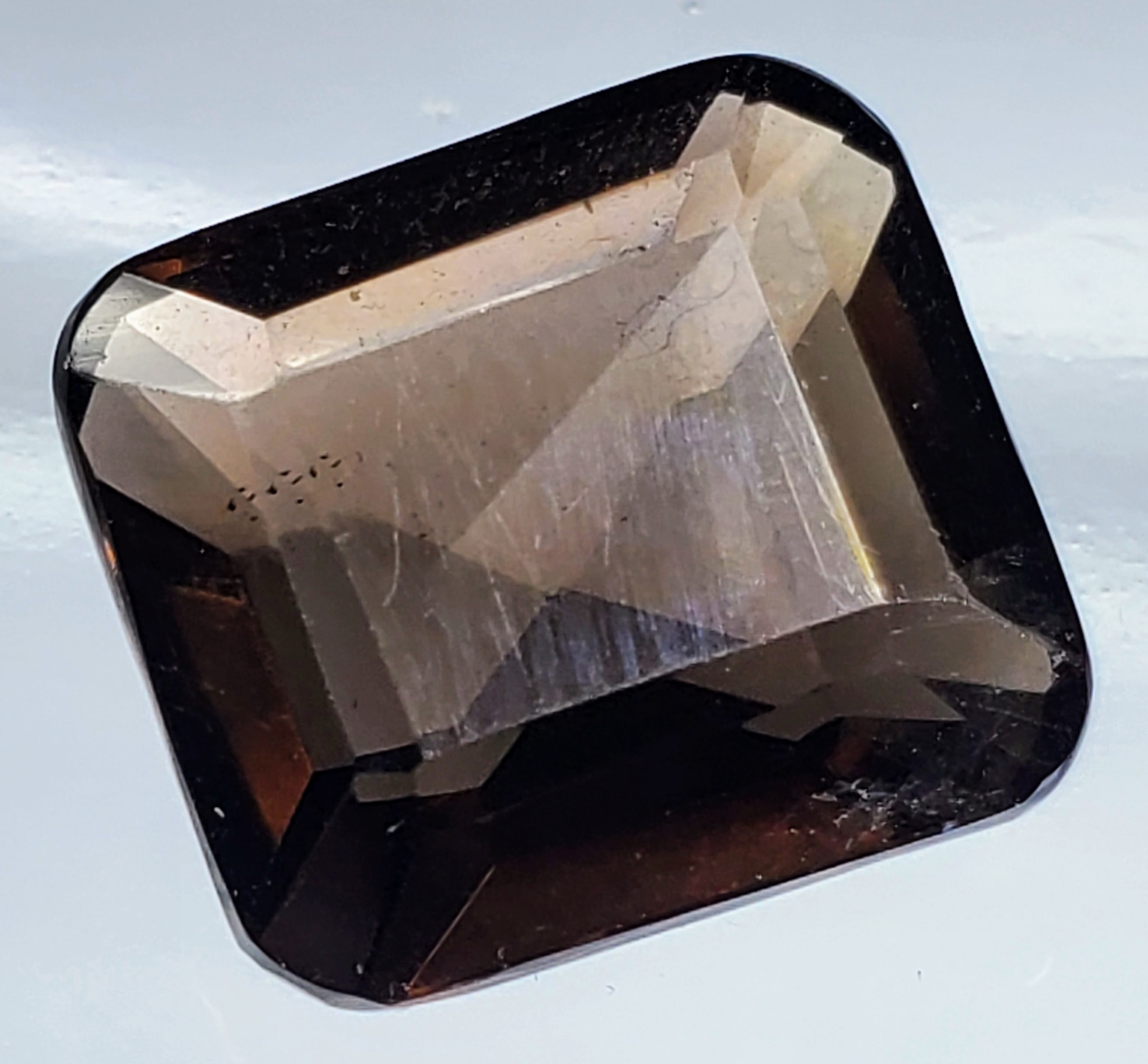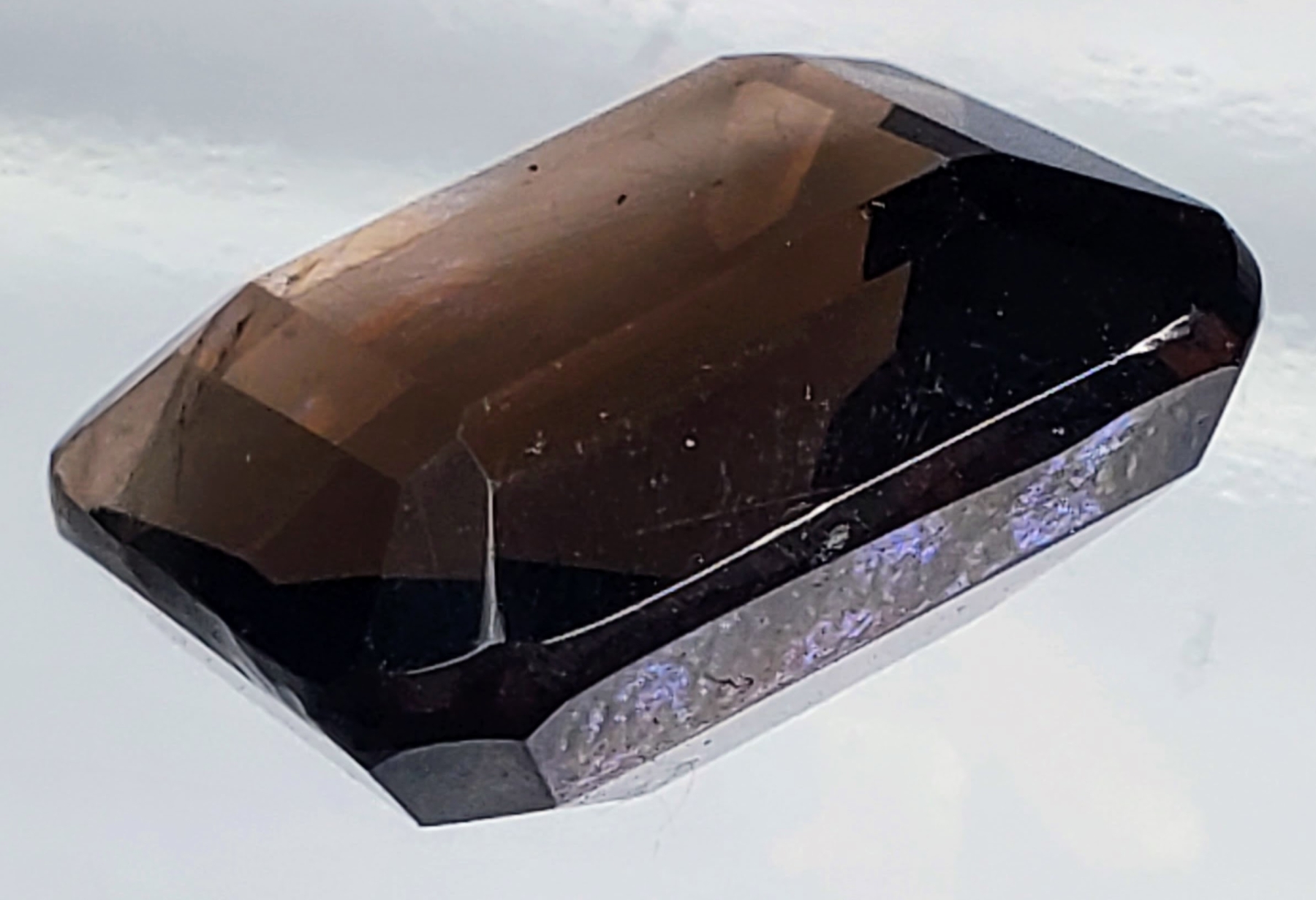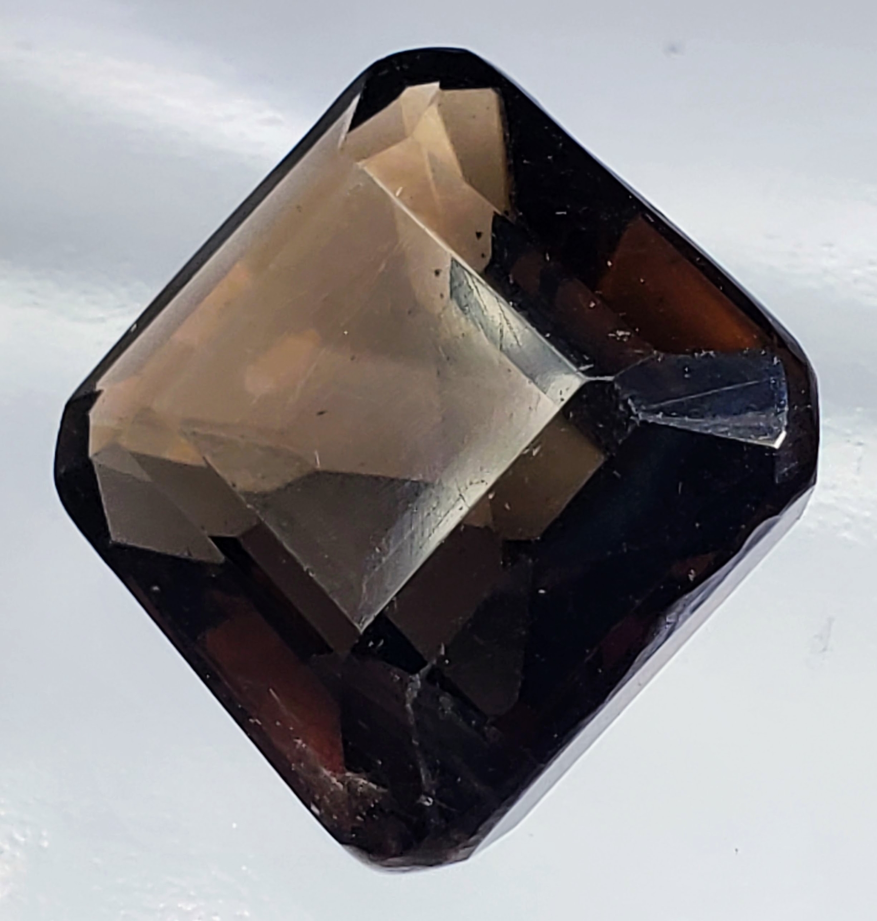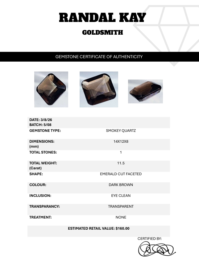 An 11.5-carat dark-brown smokey quartz with eye-clean clarity, transparent body, and emerald-cut faceting. Untreated and richly toned. Estimated retail price is $160.