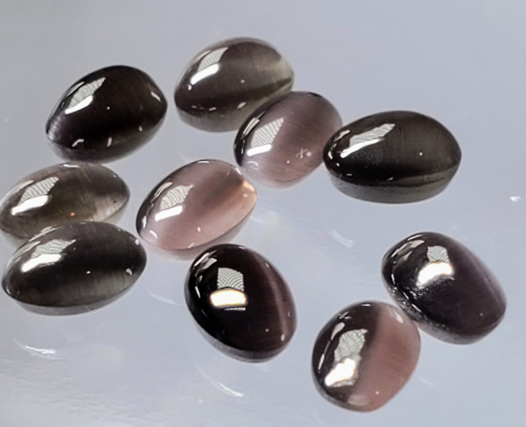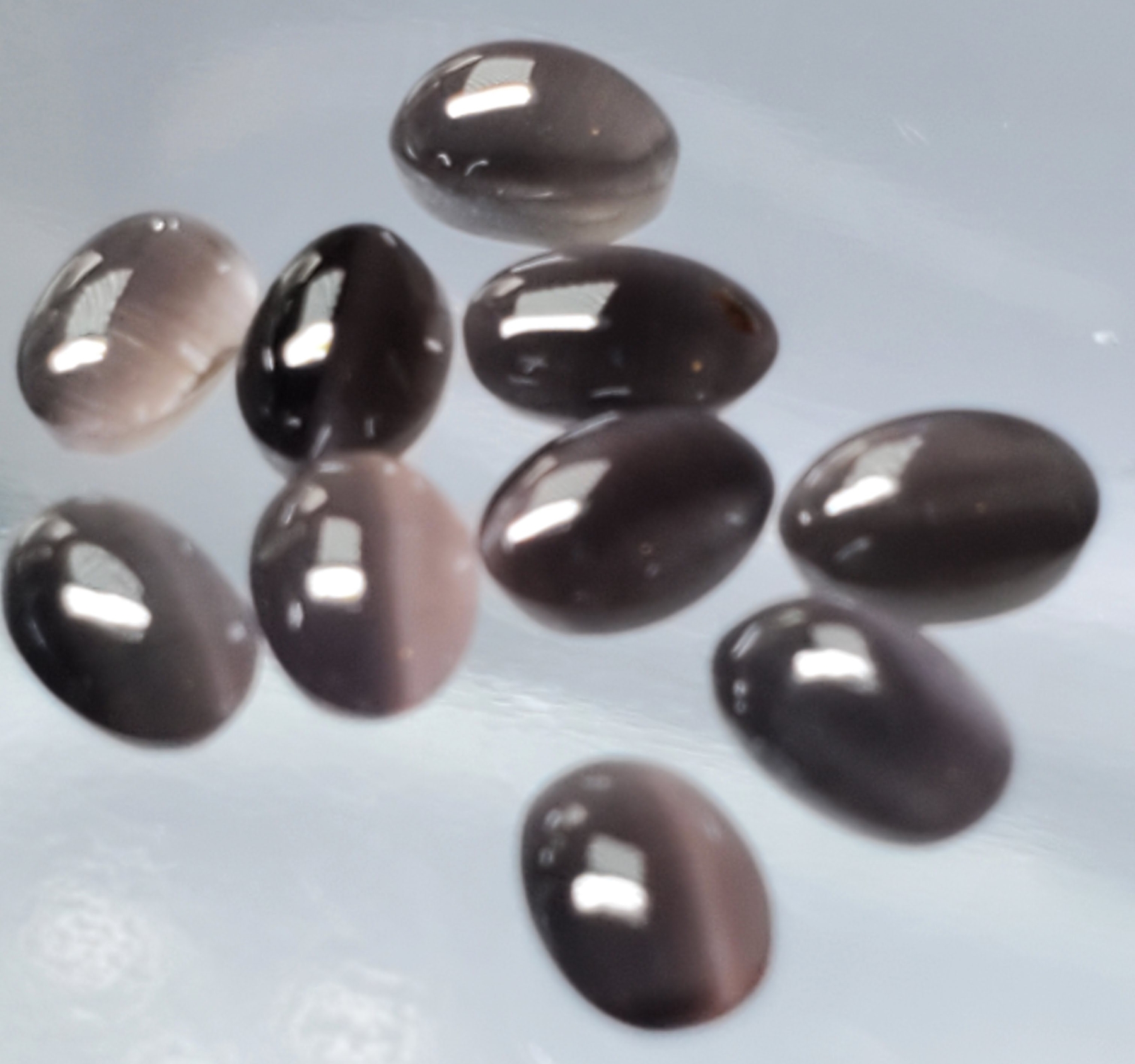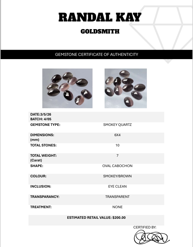 Ten smokey-brown quartz cabochons totaling 7 carats, each transparent and eye-clean with smooth oval domes, ideal for matched jewelry sets. Estimated retail price is $200.