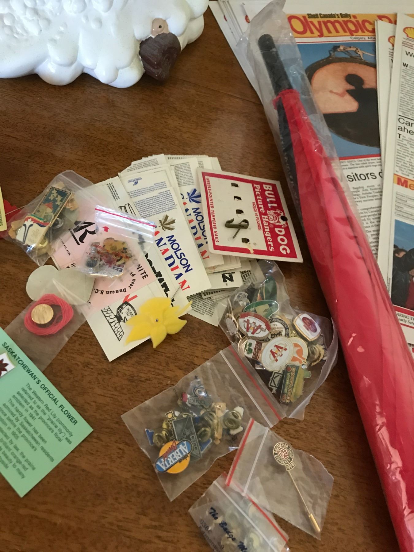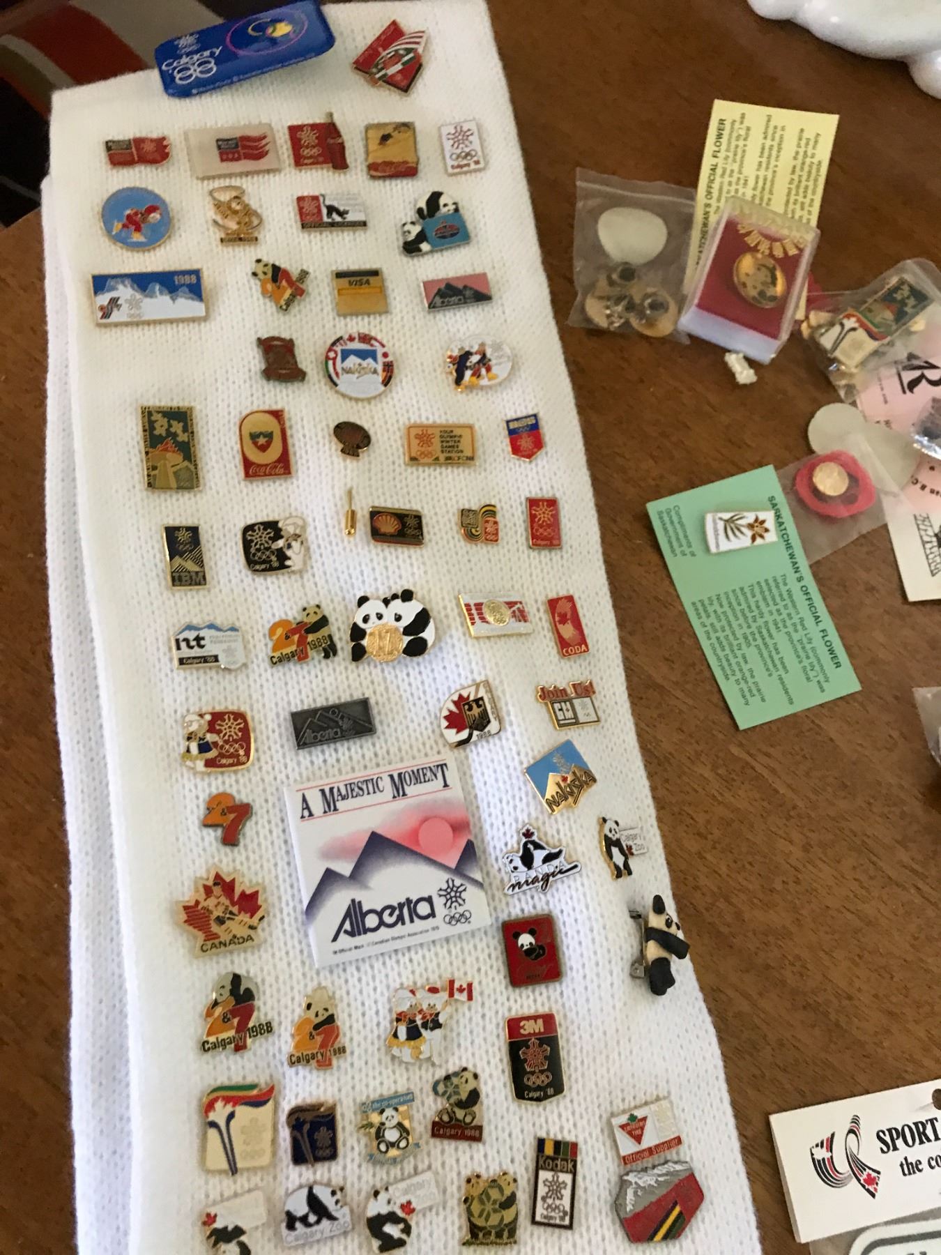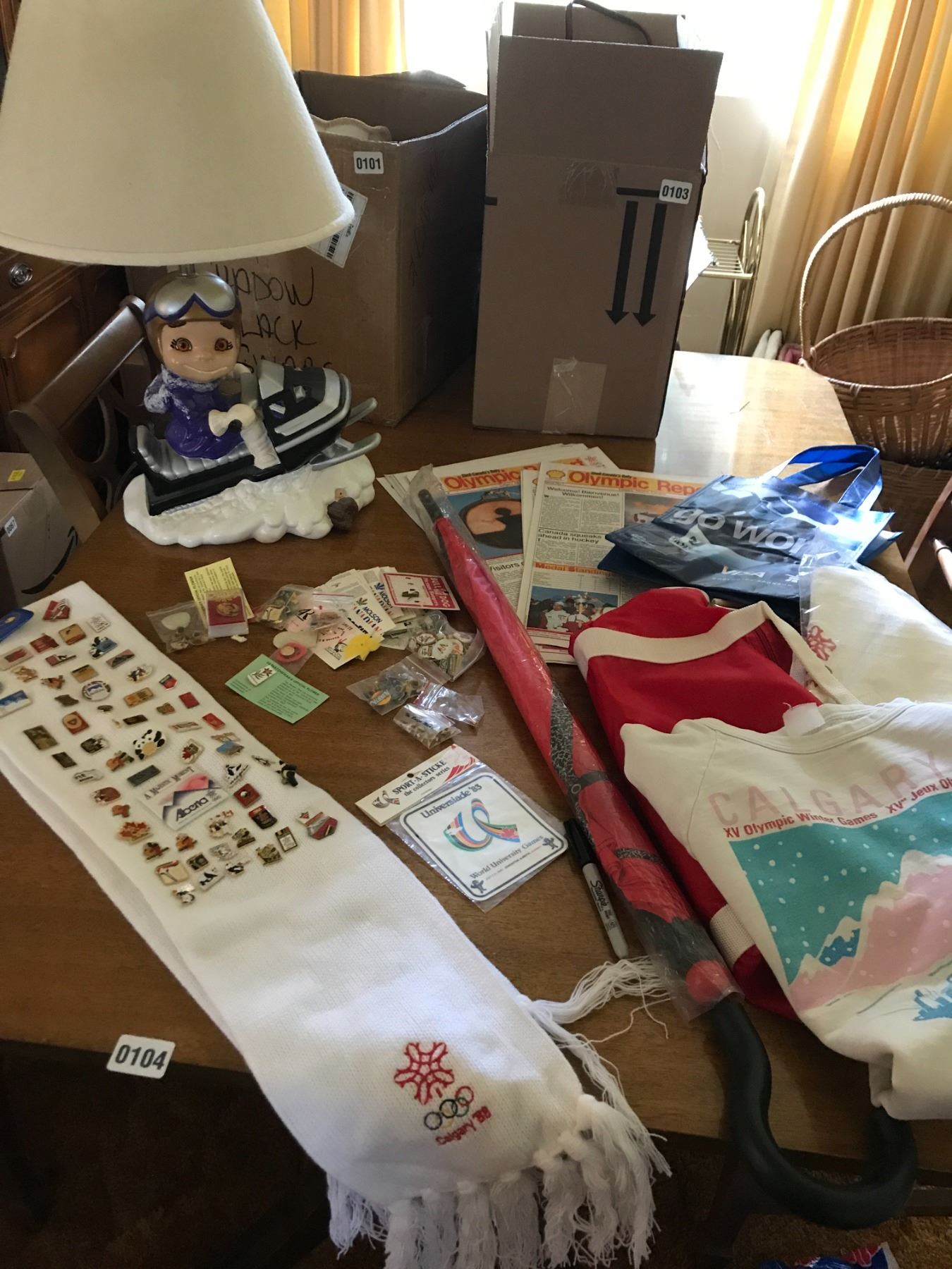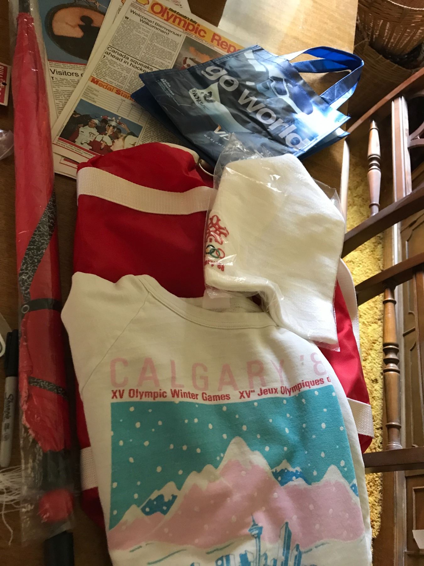 Snowmobile Lamp, 1988 Olympic Bag, Sweatshirt, Hat, Asst Pins & Umbrella