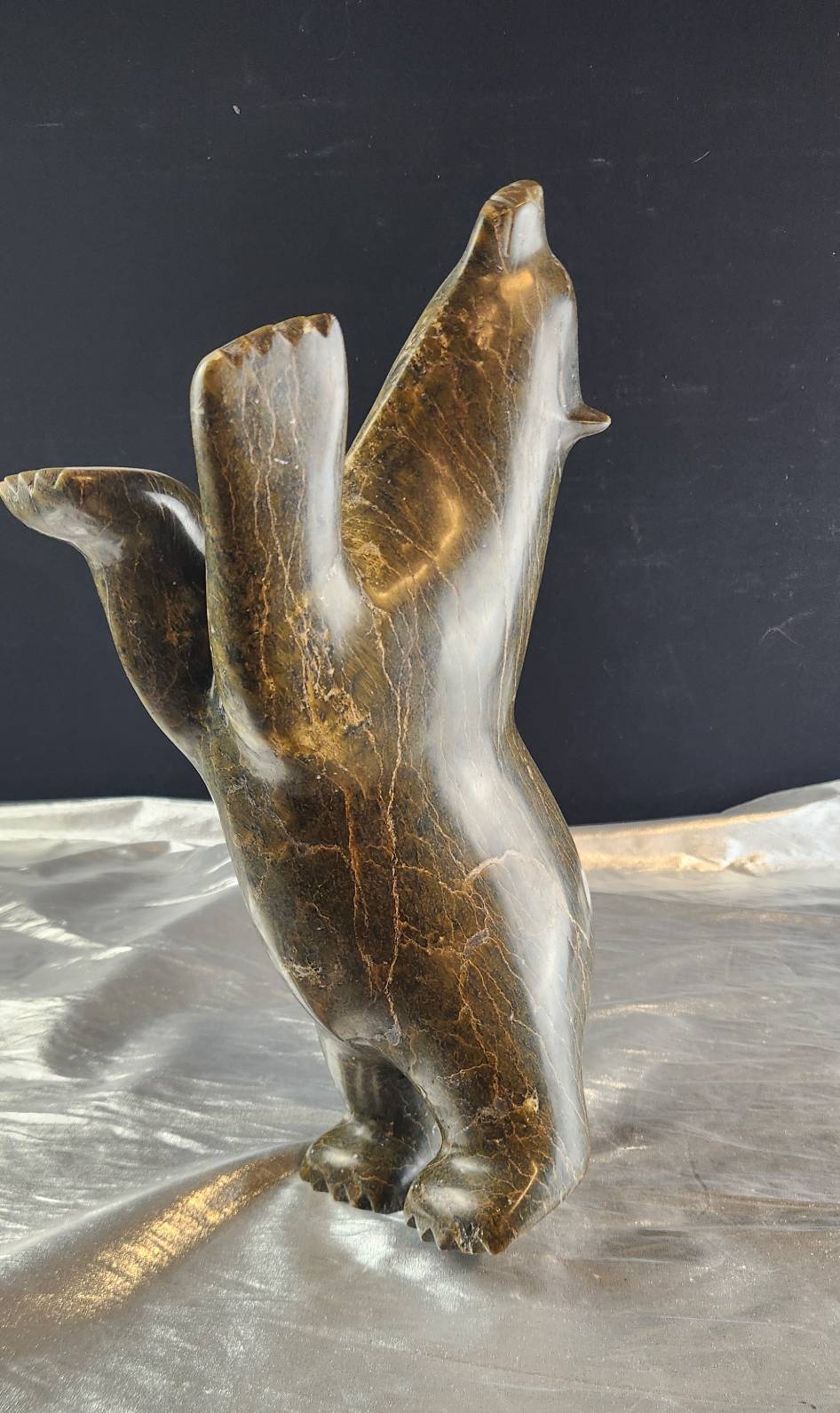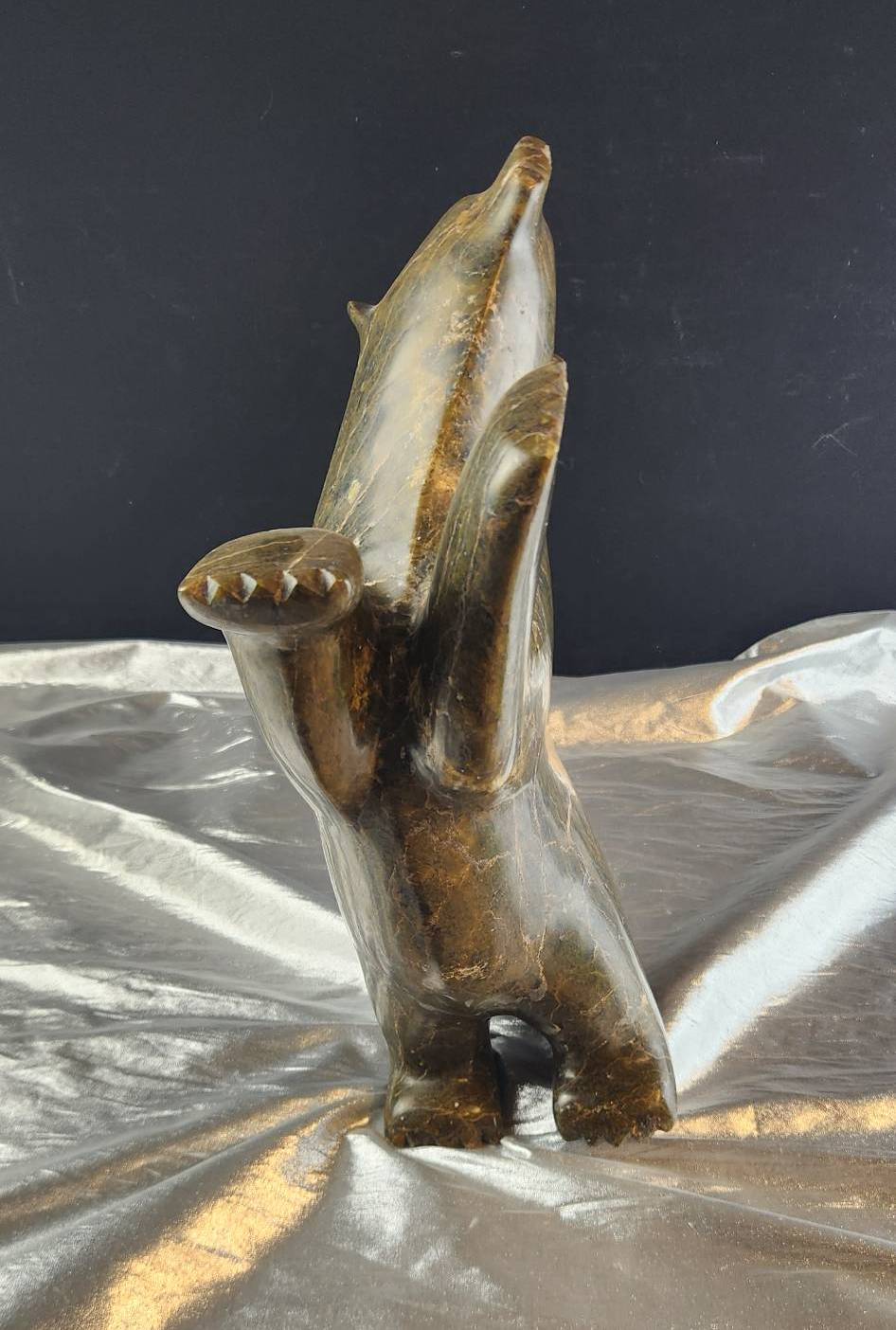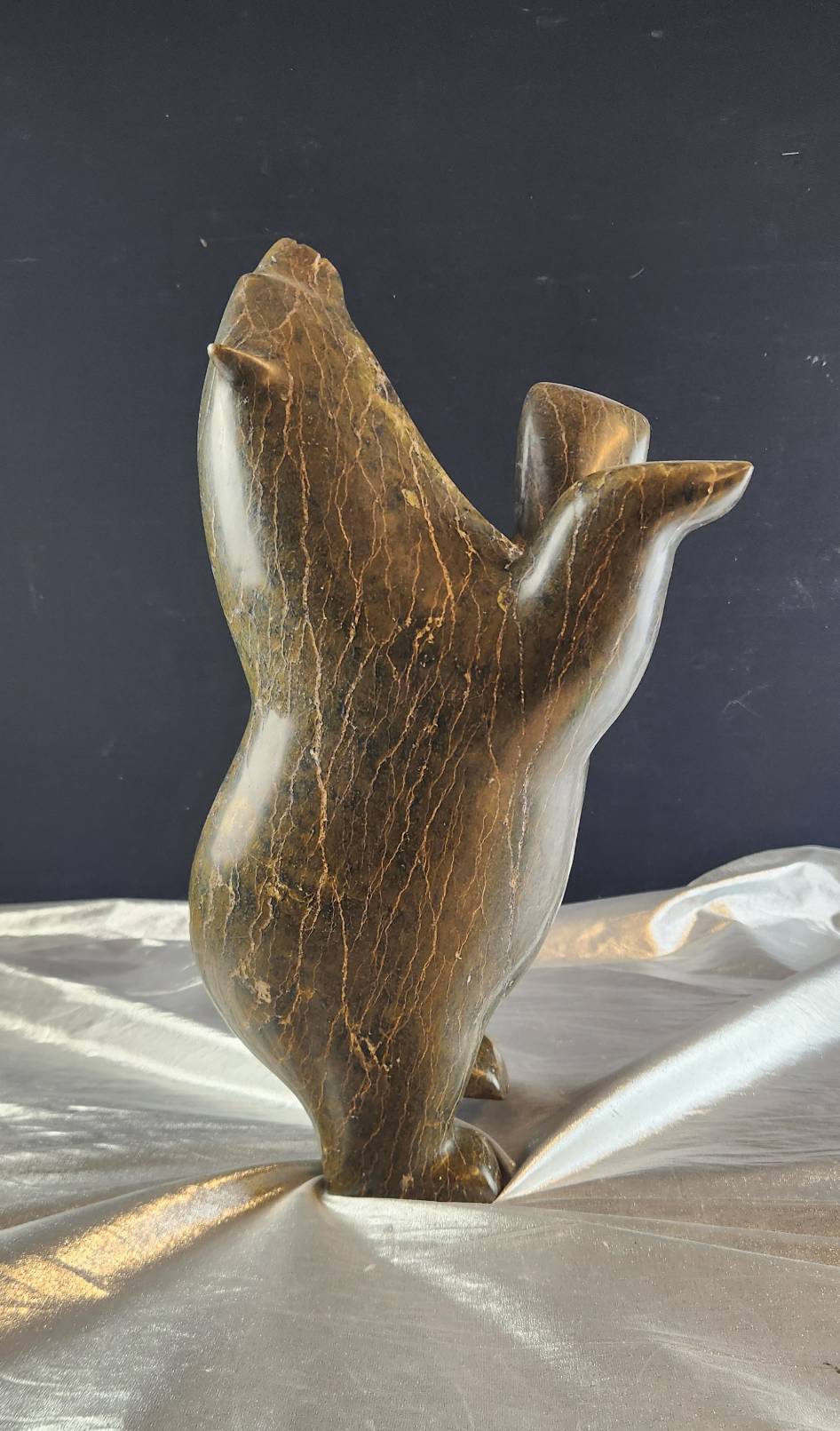 This Inuit-carved soapstone sculpture captures the spirit of a dancing bear in motion. | | | the piece is both striking and sturdy. | | | The detailed carving highlights the bear's graceful posture and textured surface, showcasing the artisanship typical of Inuit traditions. | | | A centerpiece sculpture that offers culture and craftsmanship for collectors or enthusiasts.
