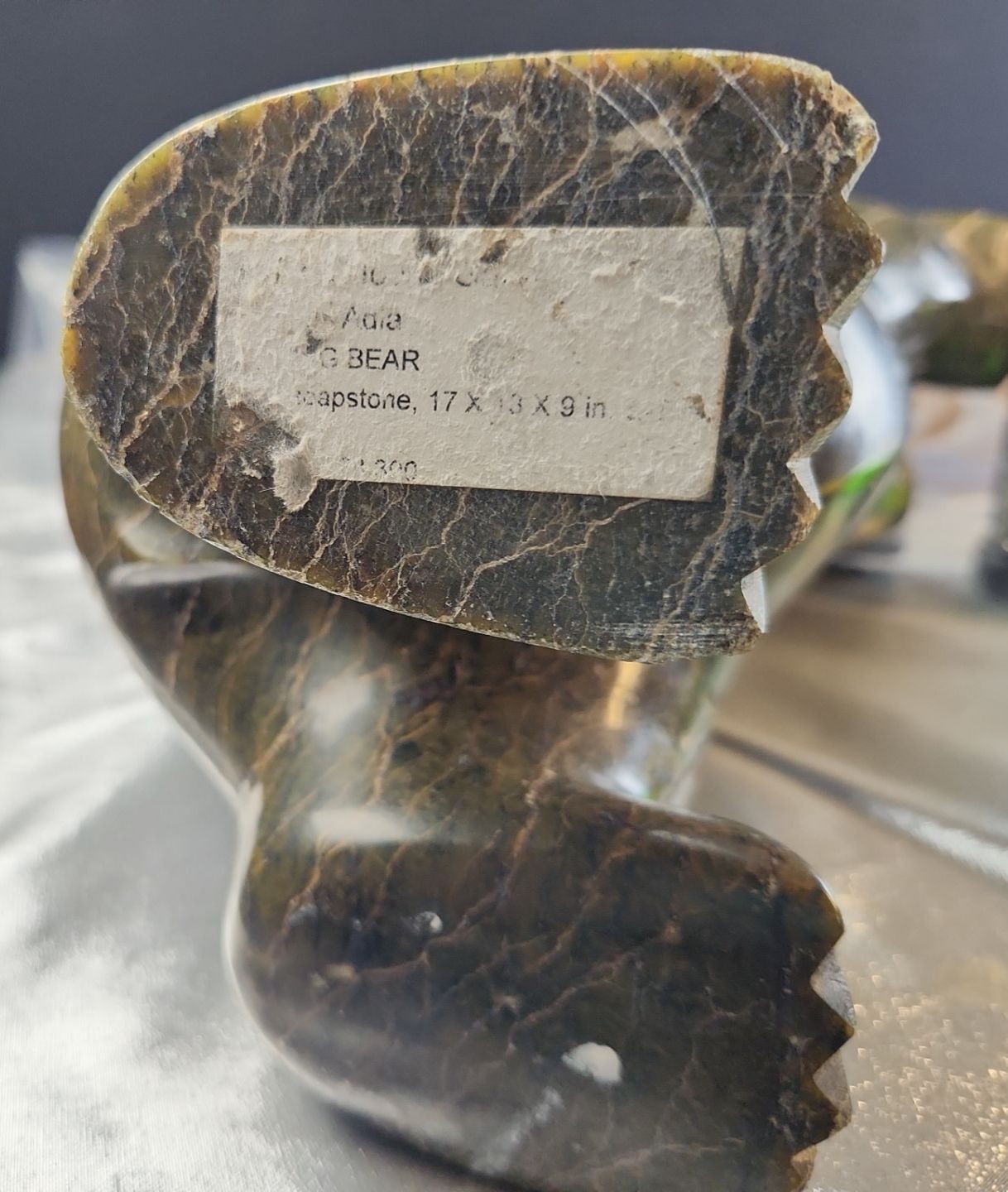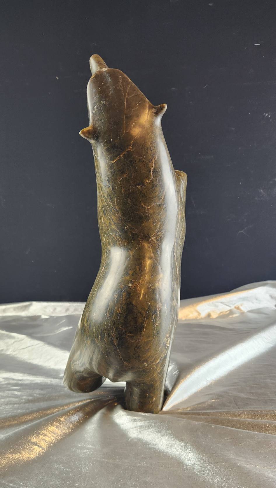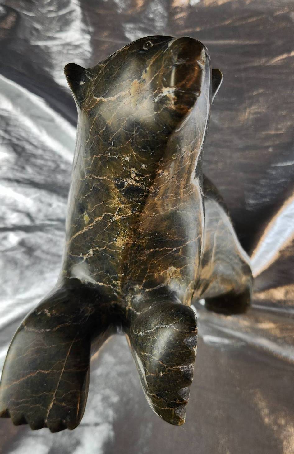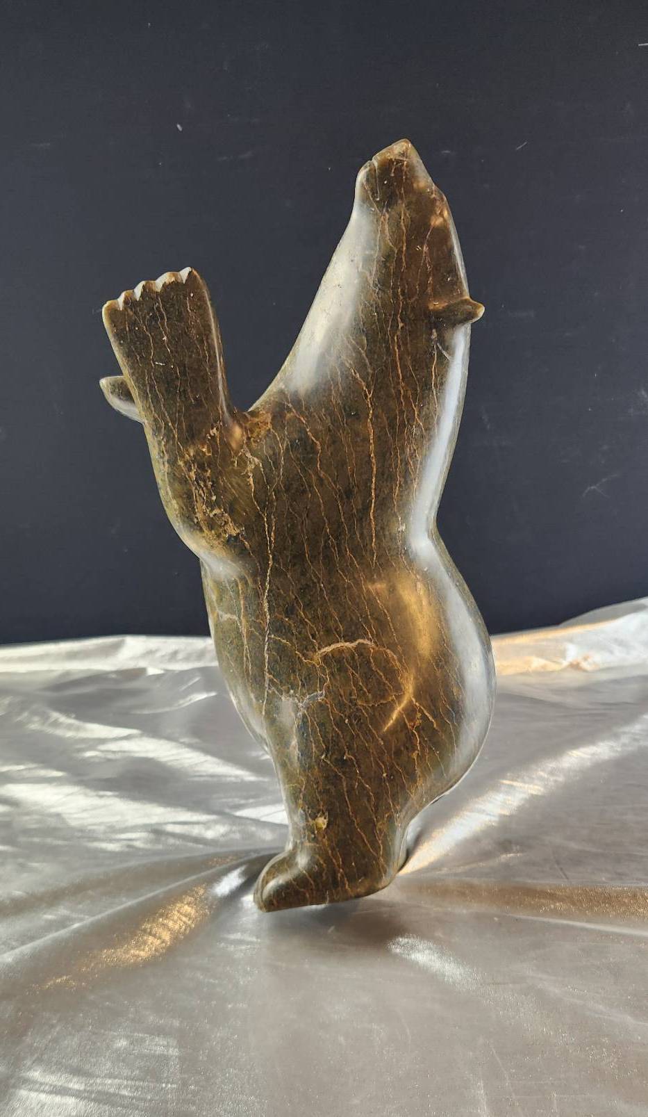 This Inuit-carved soapstone sculpture captures the spirit of a dancing bear in motion. | | | the piece is both striking and sturdy. | | | The detailed carving highlights the bear's graceful posture and textured surface, showcasing the artisanship typical of Inuit traditions. | | | A centerpiece sculpture that offers culture and craftsmanship for collectors or enthusiasts.