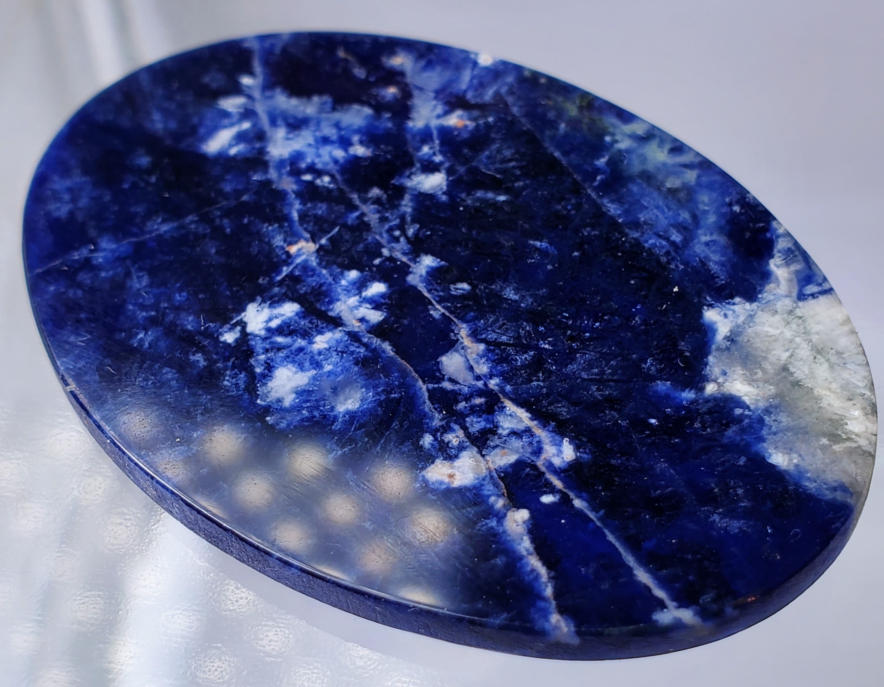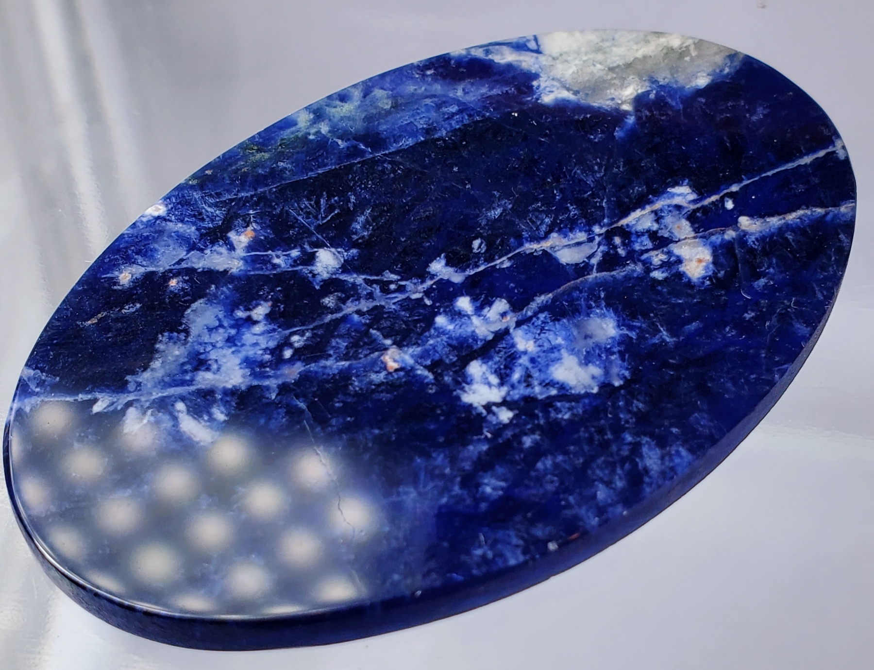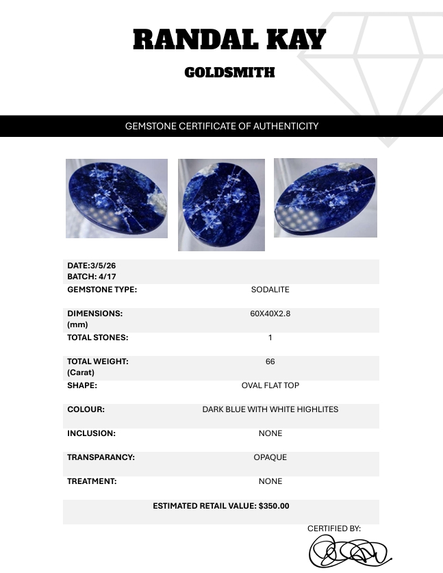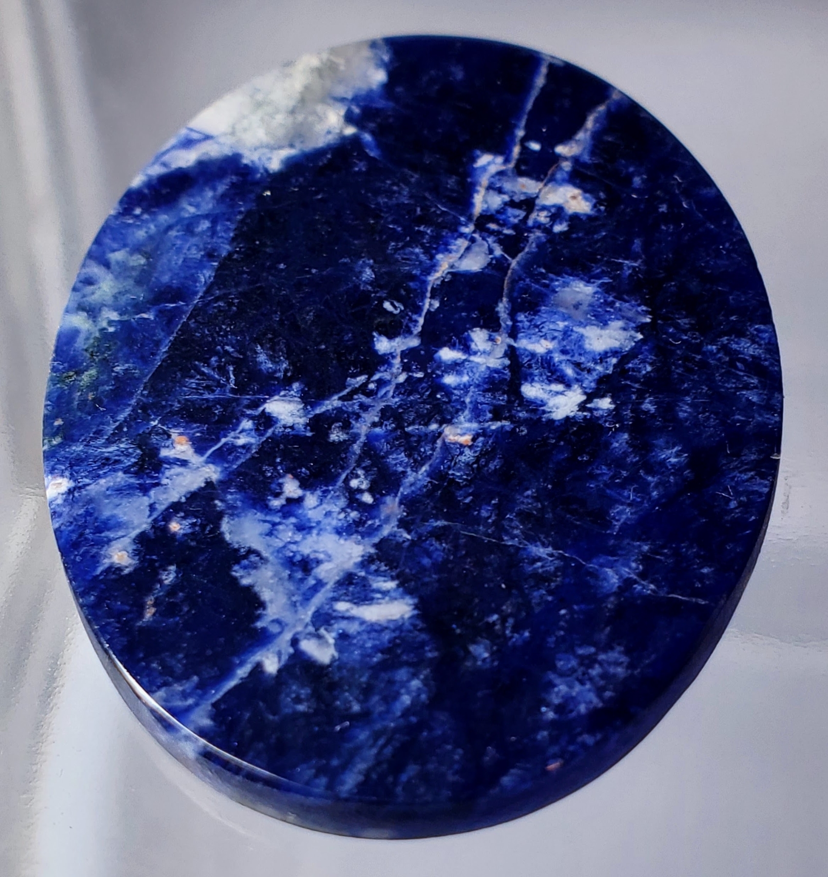 A large 66-carat sodalite cabochon featuring deep blue color with striking white highlights. Opaque and untreated, ideal for statement pieces. Estimated retail price is $350.