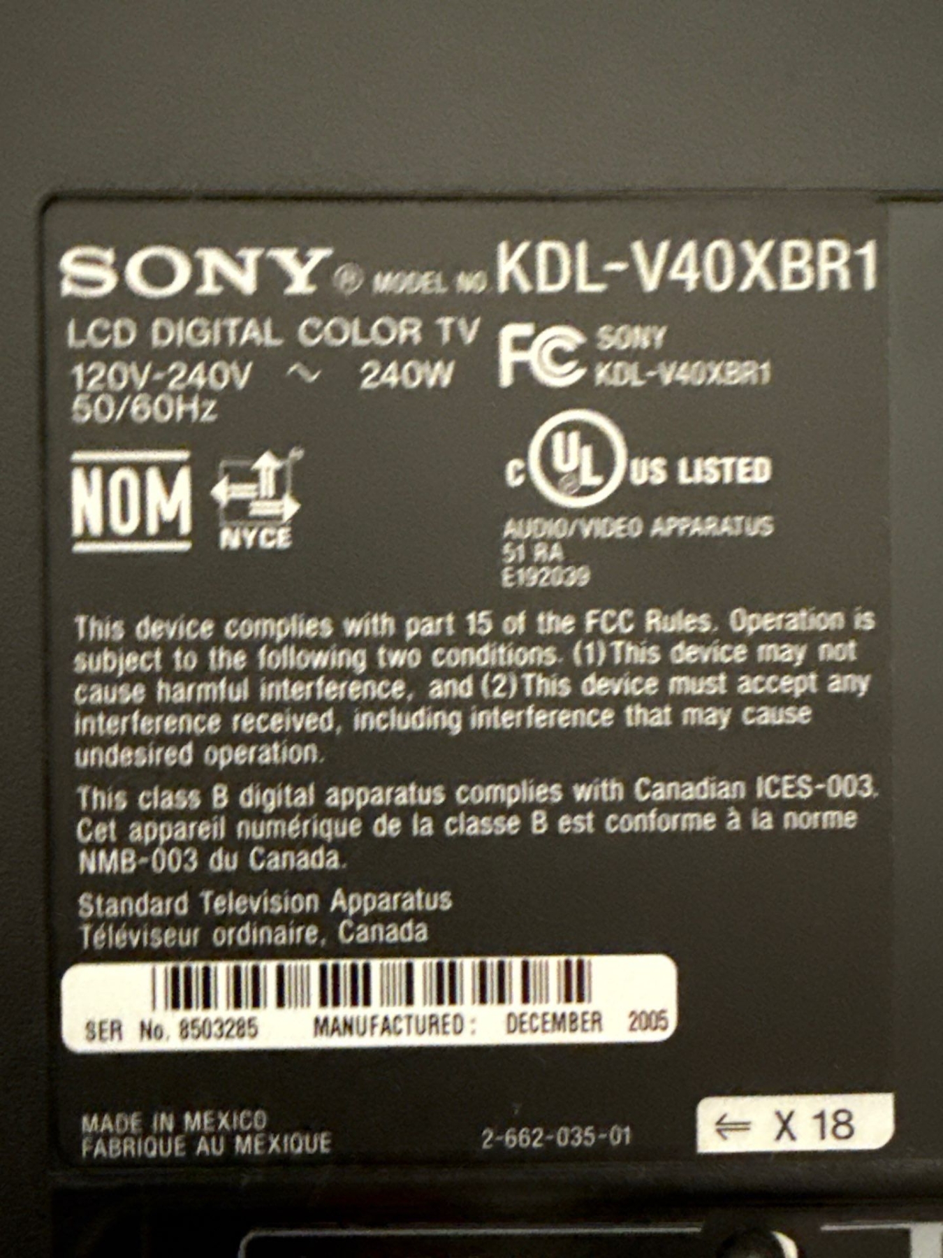 Sony KDL-V40XBR1 LCD Television Sony DVD DVP-S330 RCA VHS Player VR620HF