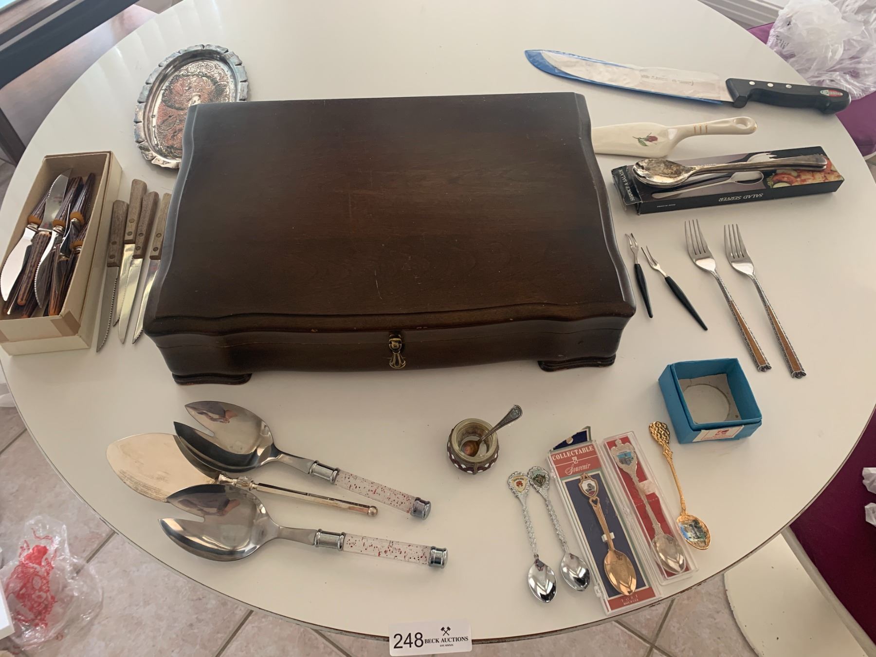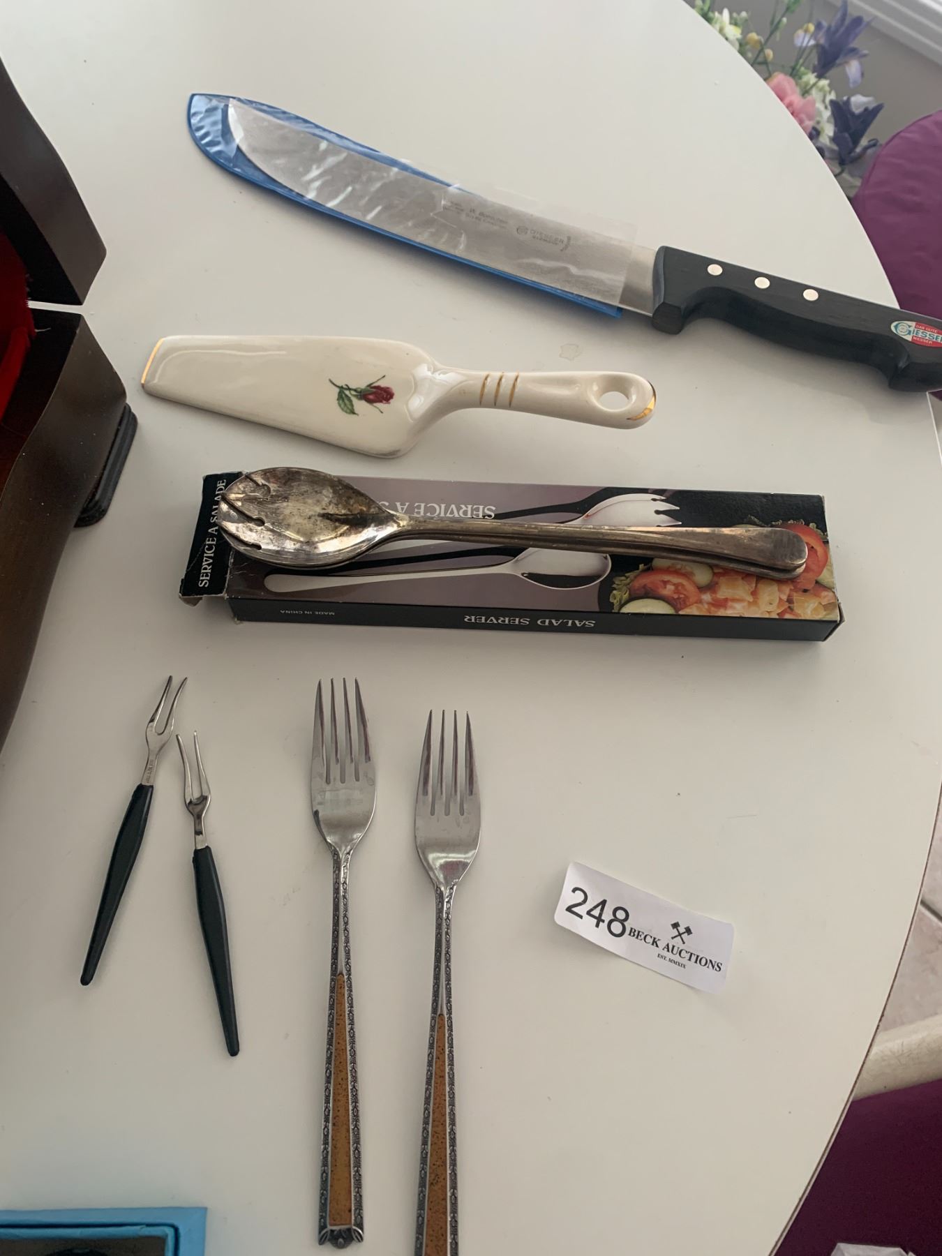 Steak knives, ceramic pie spatula, large Giesser knife, silverplate mustard bowl, silverplate dish & more!