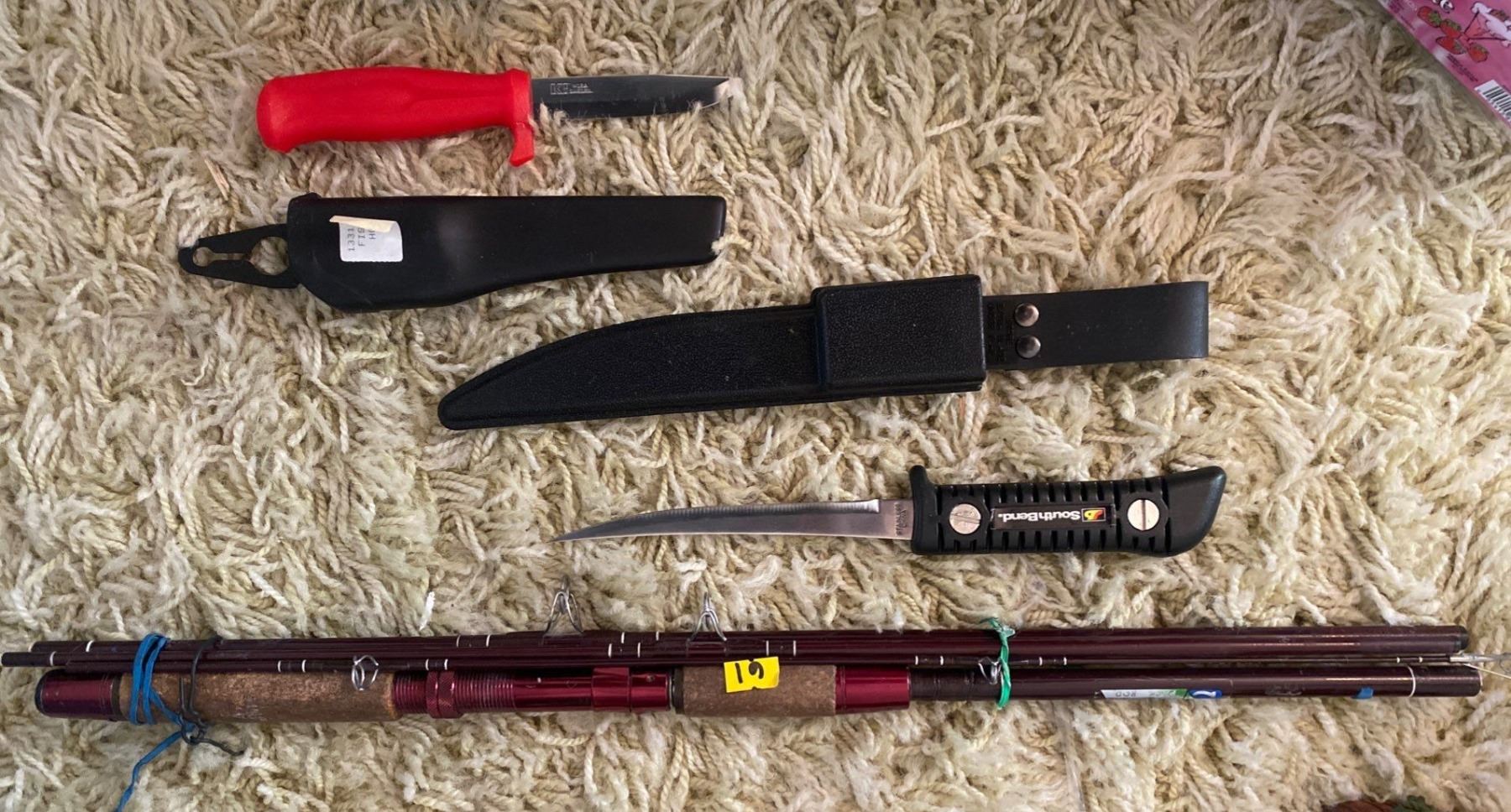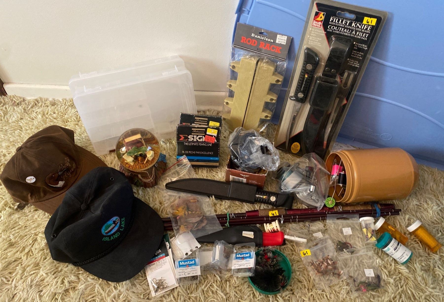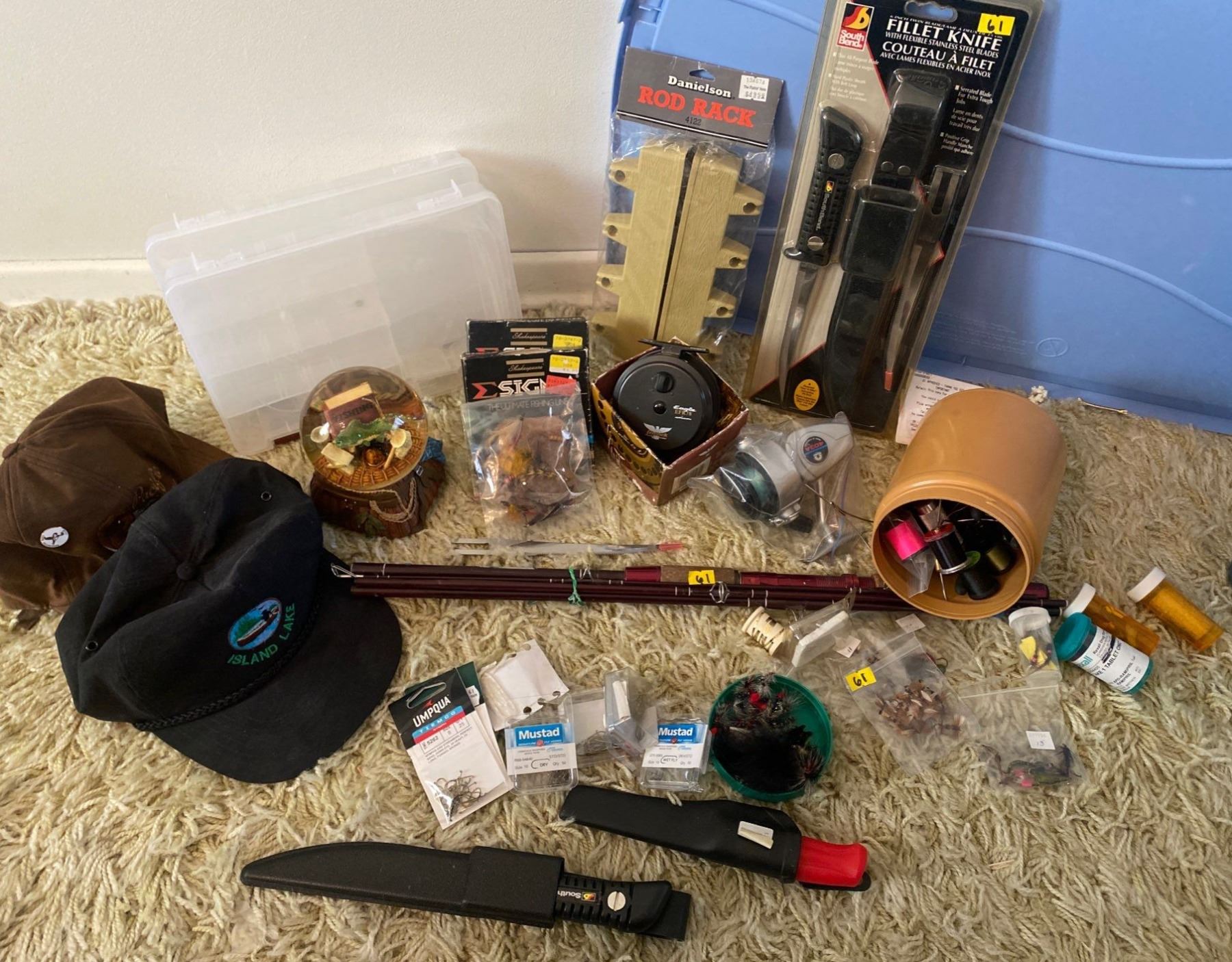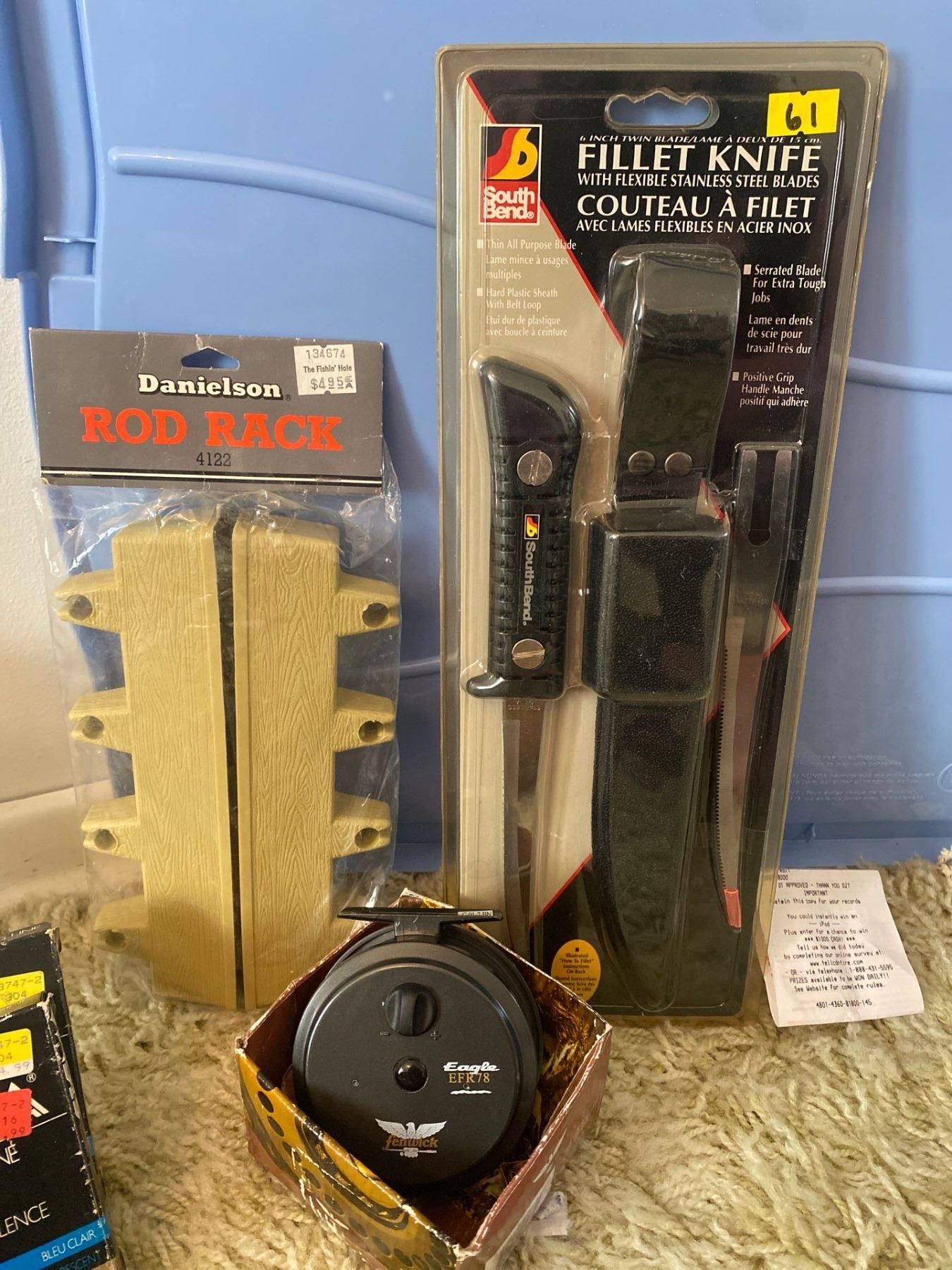 Southbend Filet Knives Fishing Rod Rod Rack Daiwa Reel Fishing LIne and Assorted Fishing Gear