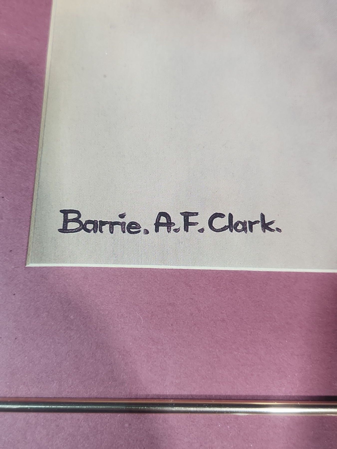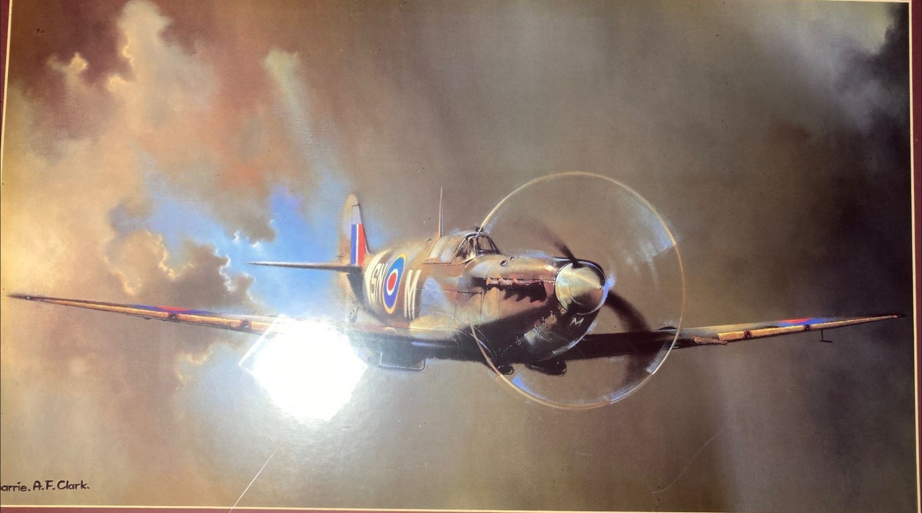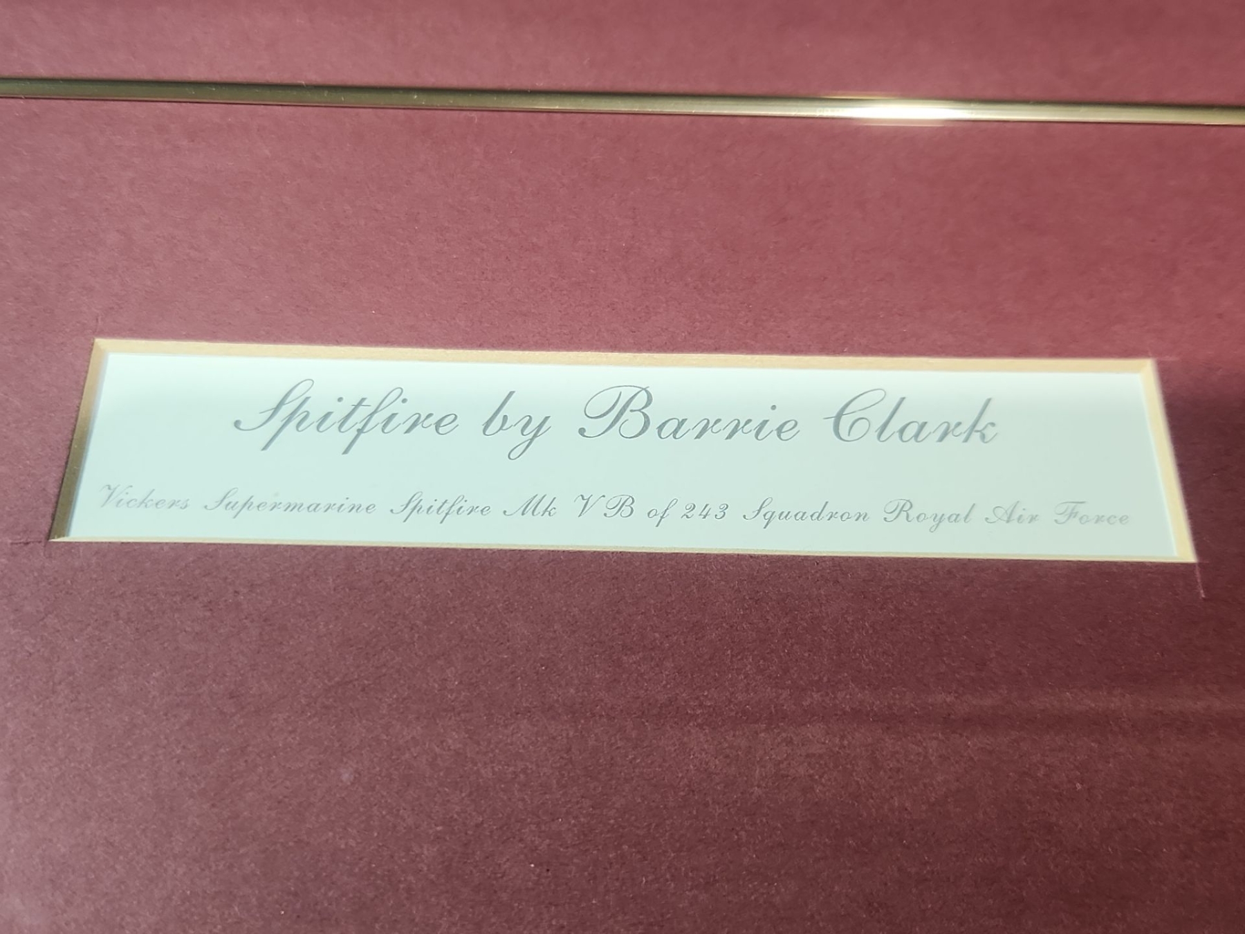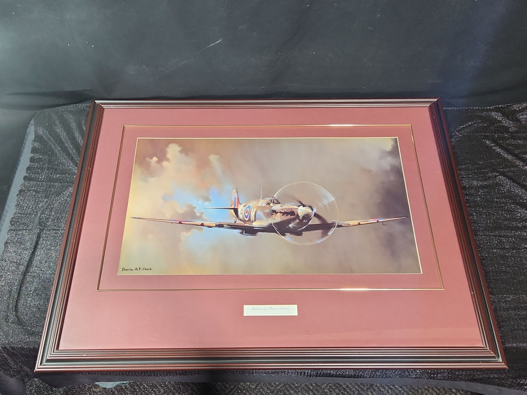 This is framed , signed print of the artwork " Spitfire " by artist Barrie A.F Clark. This piece was created in 1982 .