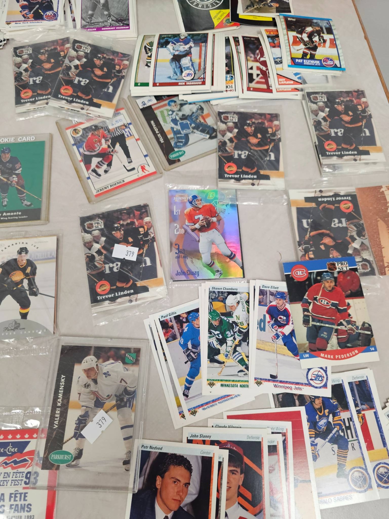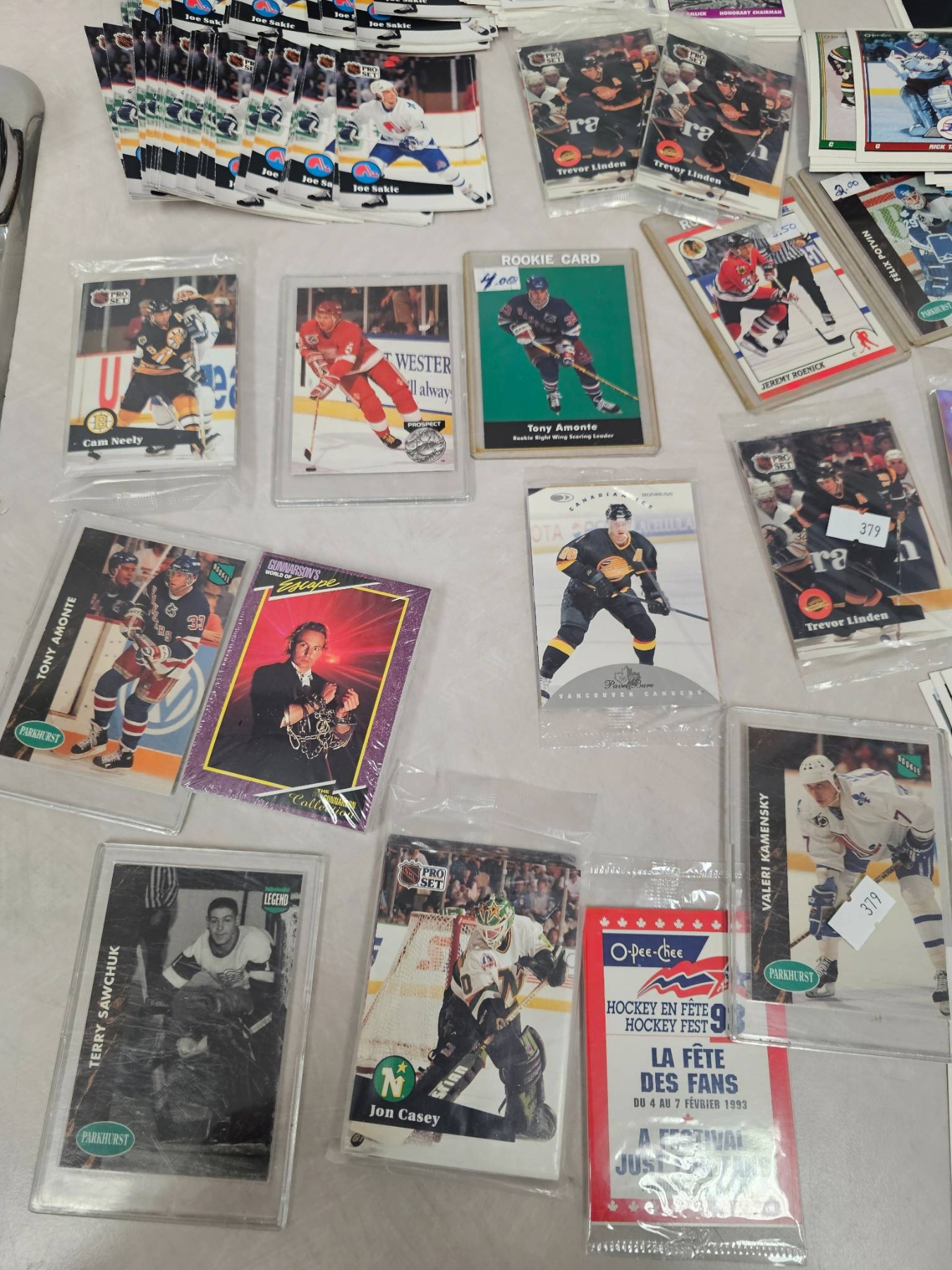 Extensive collection featuring sports trading cards, primarily hockey-themed, alongside books related to hockey rules, baseball, and sports dining. The cards include various players, styles, and conditions, with some cards in protective cases. A unique set for sports enthusiasts, collectors, or fans of hockey history and culture.
