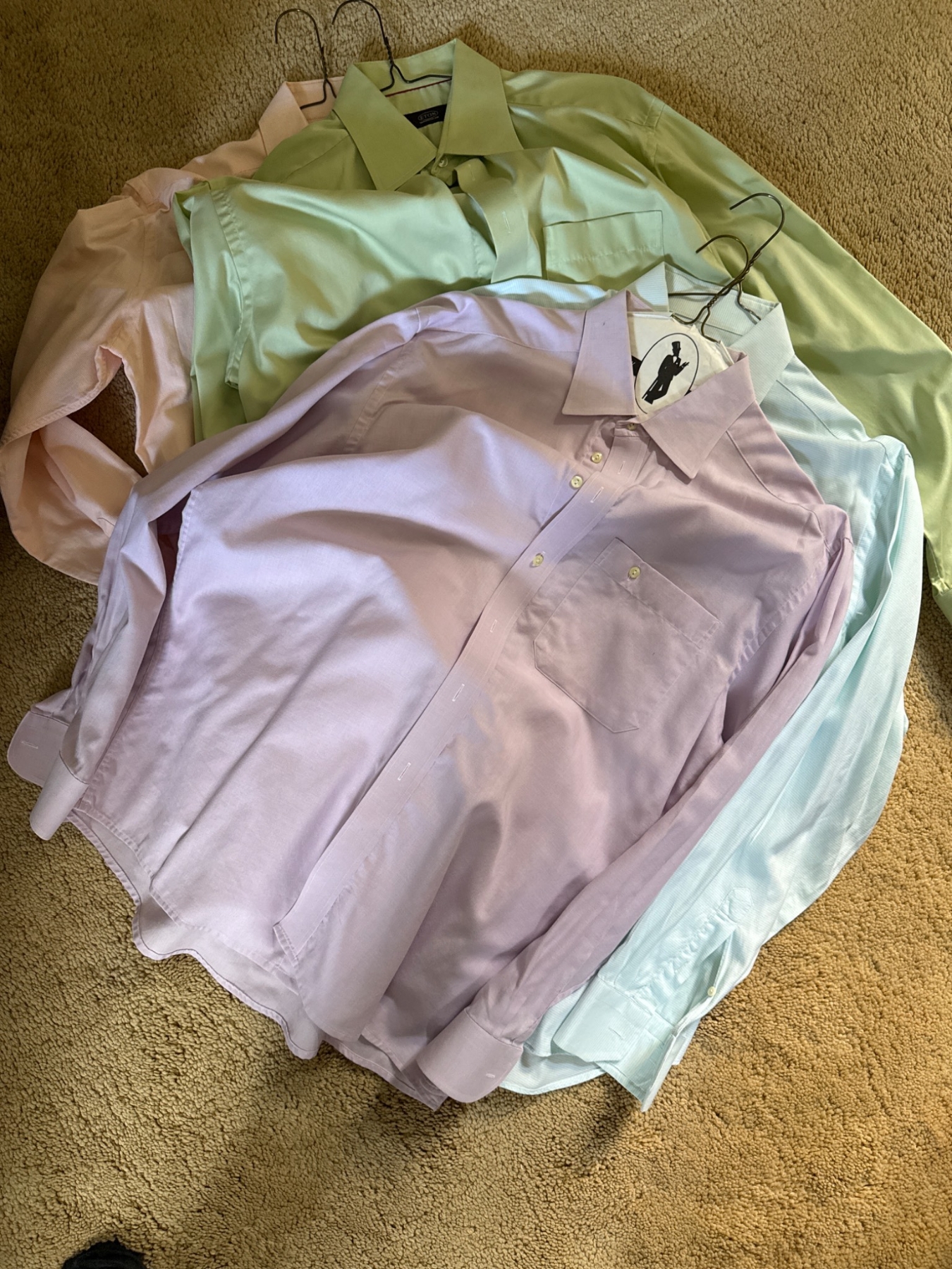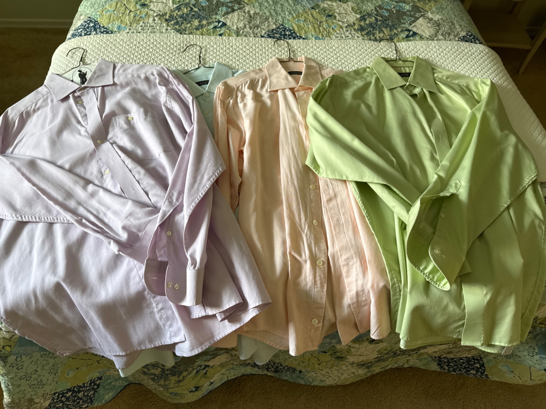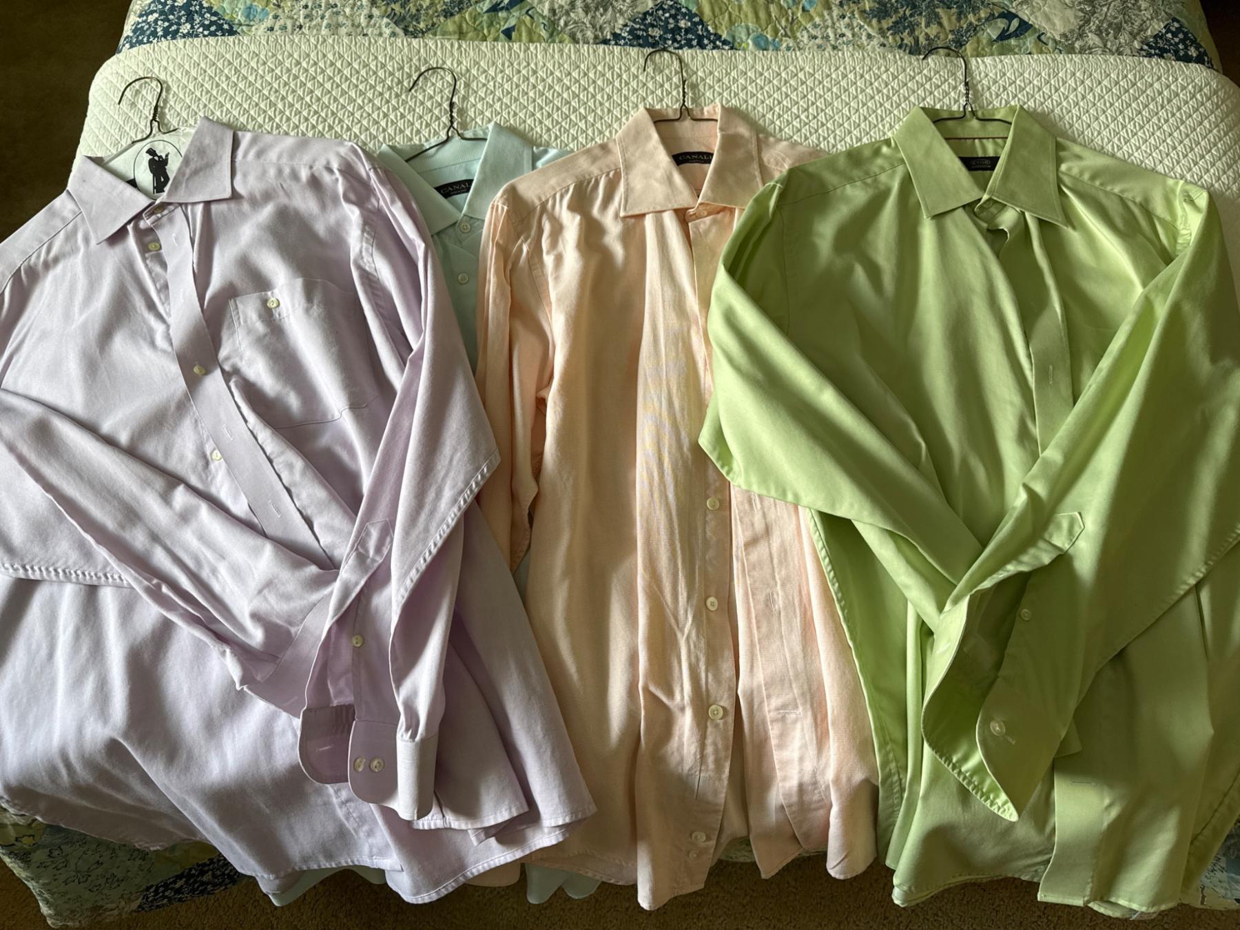 Spring-themed men's dress shirts in size 42, large tall. Includes pastel tones of pink, lavender, green, and blue, perfect for the season. Shirts feature button-up designs with long sleeves and classic collars, suitable for office or casual occasions. All shirts are in gently used condition, making them an excellent wardrobe addition for those seeking fresh, seasonal styles.