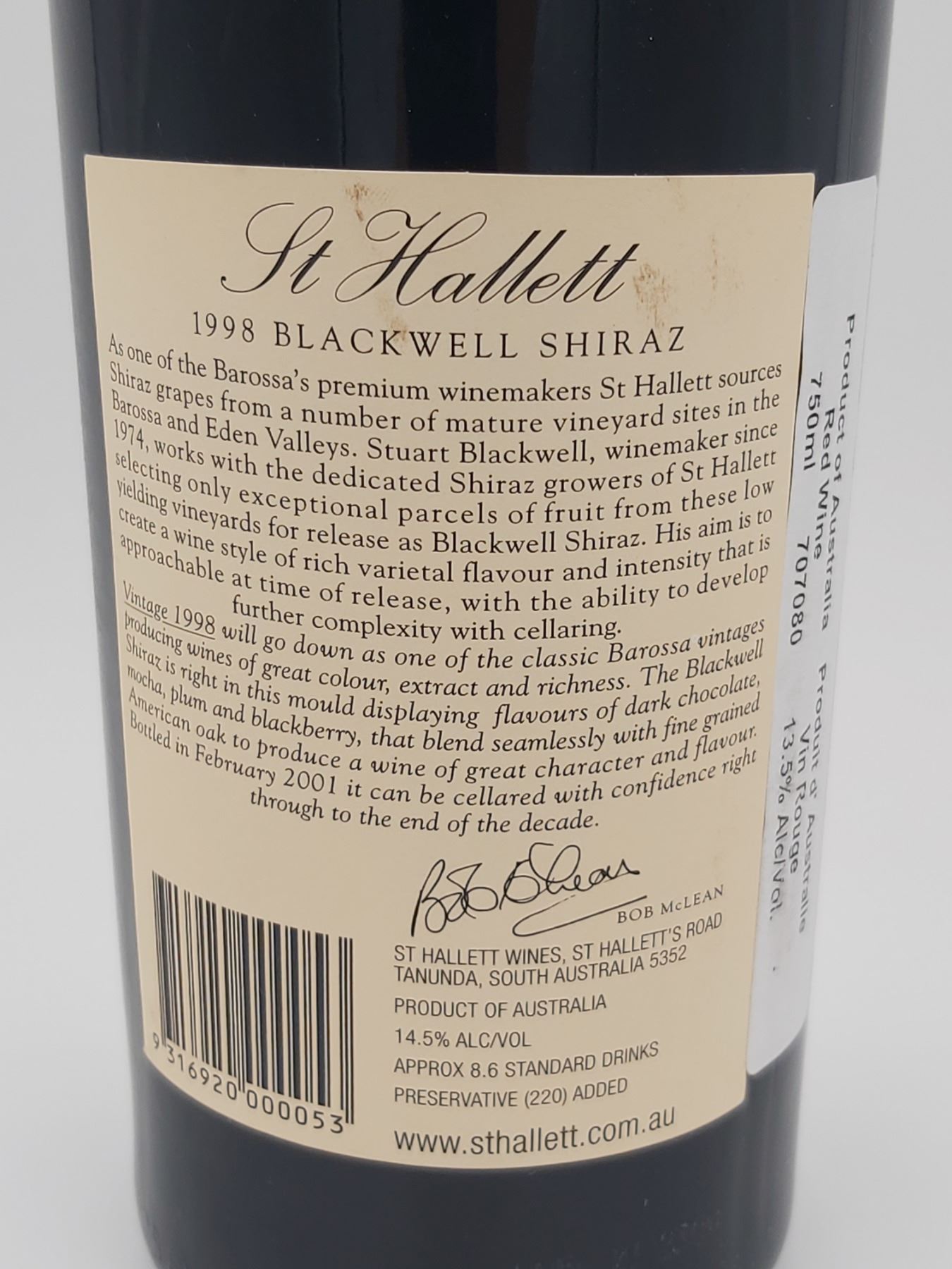 St Hallett Wines Australia Blackwell Barossa Shiraz 1998 Vintage 14.5%