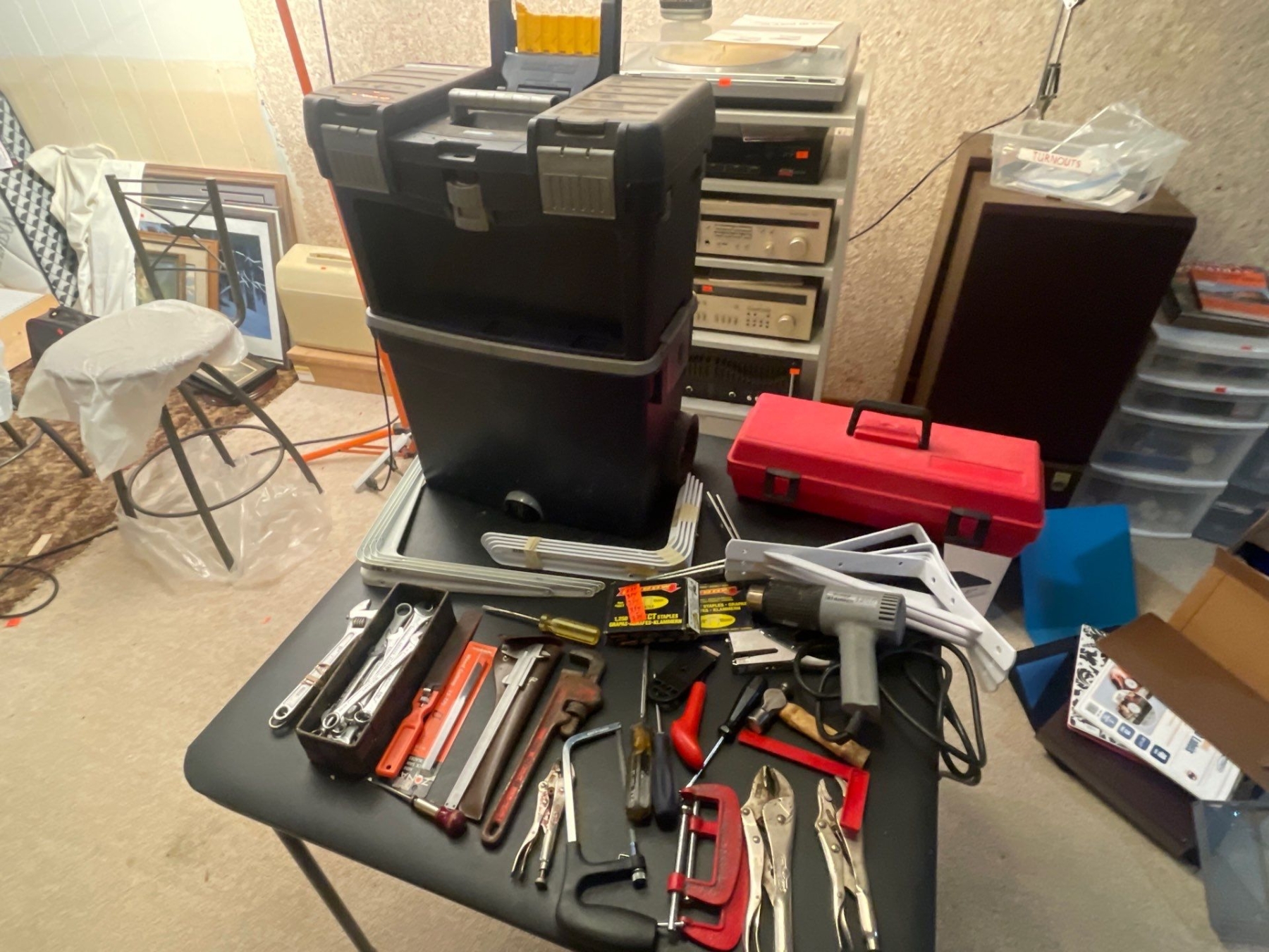 Stackable Mastercraft Toolbox, Shelving Supplies, Heatgun, Handtools, Staples.