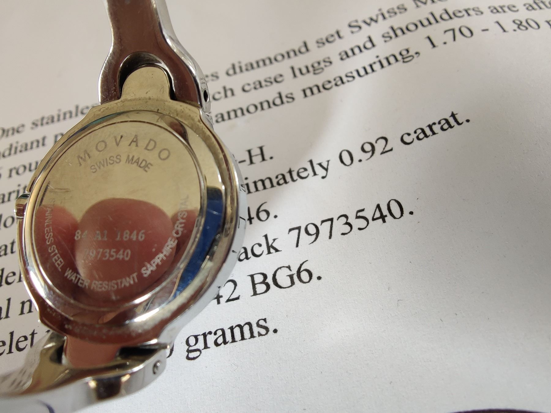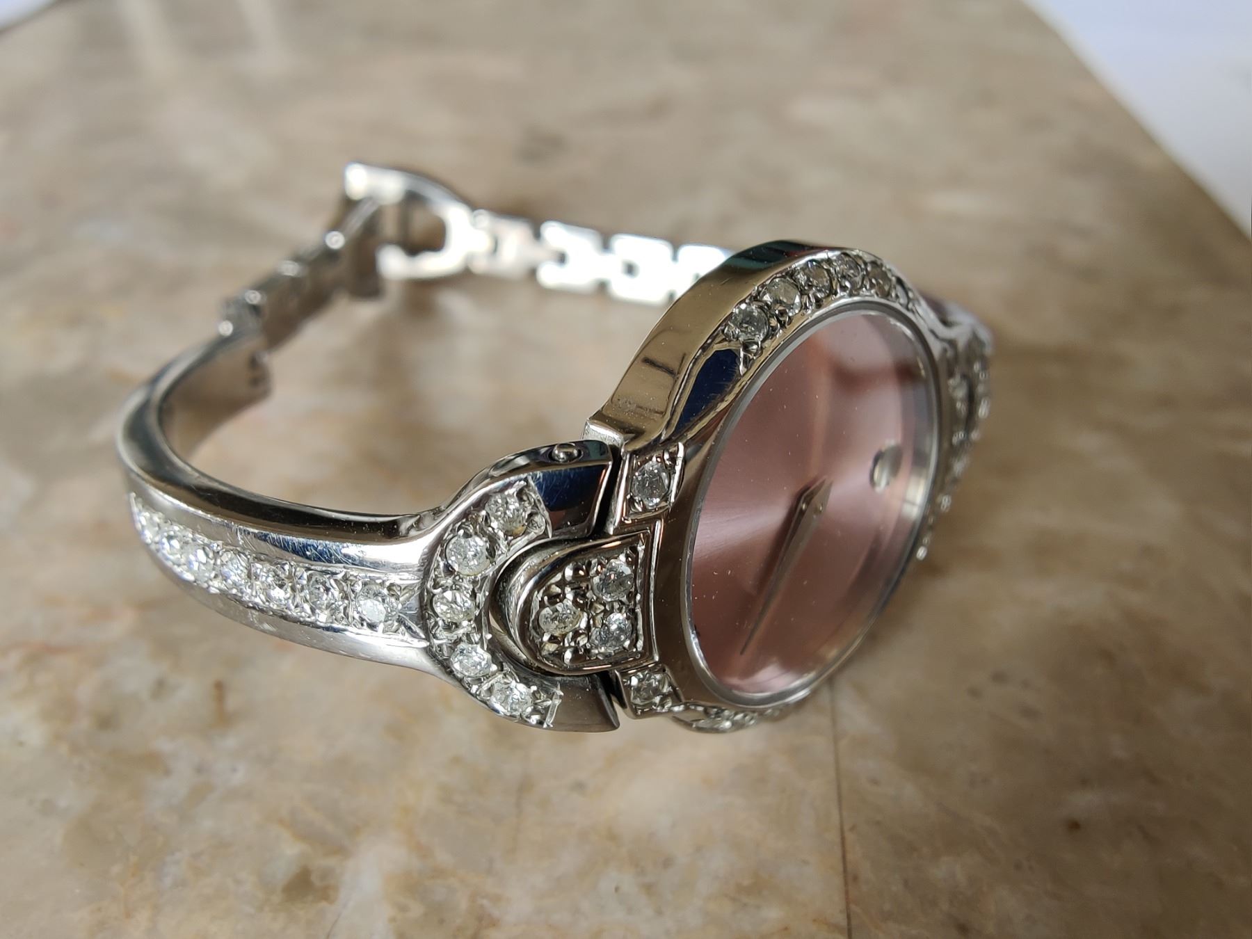 One stainless steel ladies diamond set Swiss Movado wrist watch. The pink coloured watch dial with a radiant pattern. The watch case lugs and shoulders are after market hand bright cut and beat set with 46 round brilliant cut diamonds measuring 1.70-1.80mm