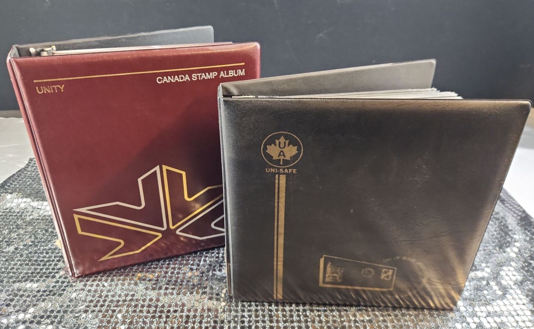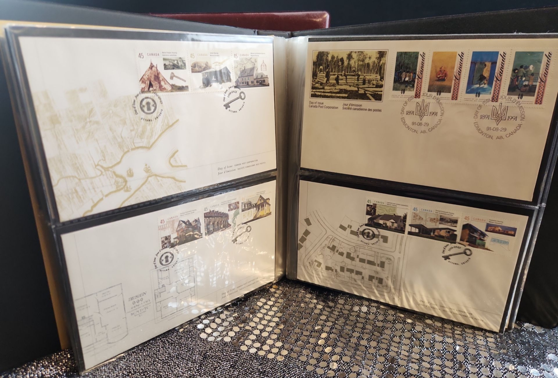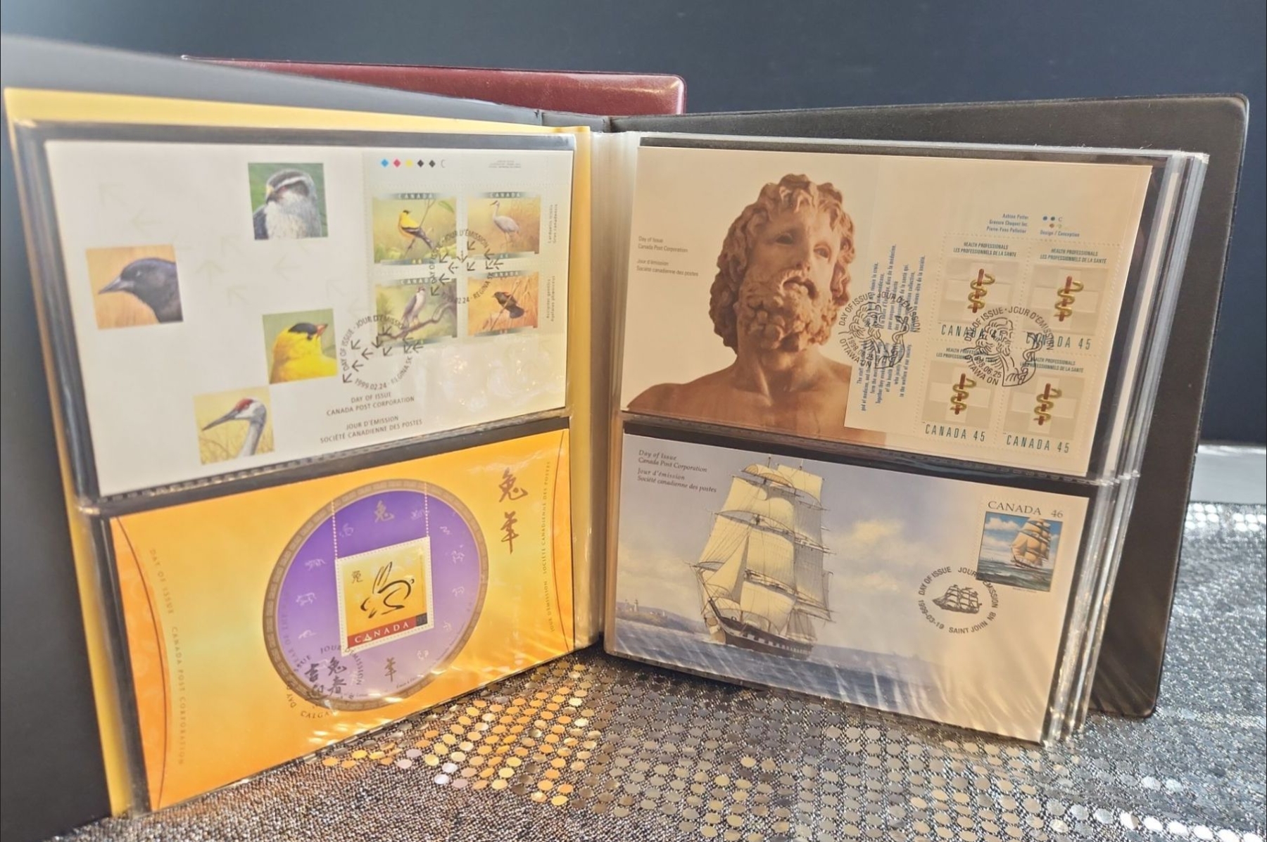 This item lot is a 2 binder collection of Canadian philatelic collectibles, containing First Day Covers (FDCs) from Canada Post, which are envelopes featuring postage stamps, cancelled on their first day of release. These covers depict various scenes related to Canadian history and culture, Canadian wildlife and commemorative stamps. Housed in protective plastic sheets.