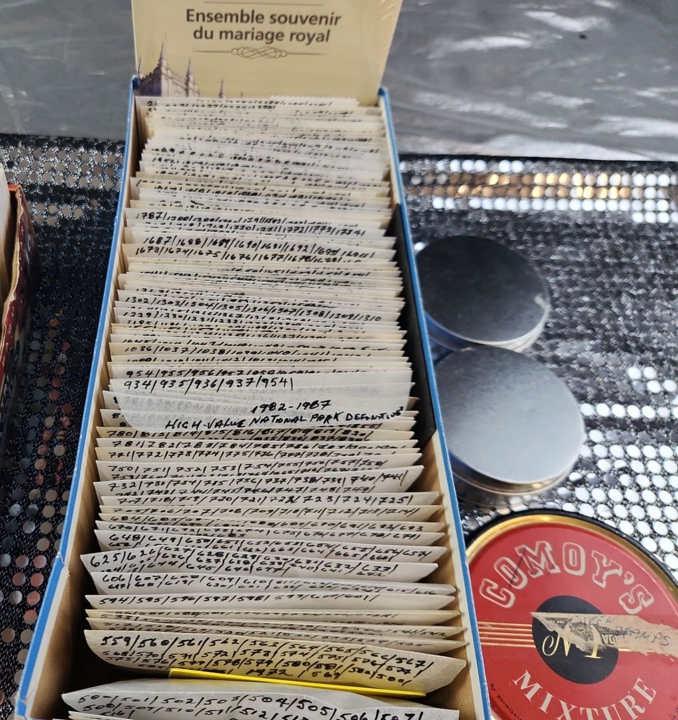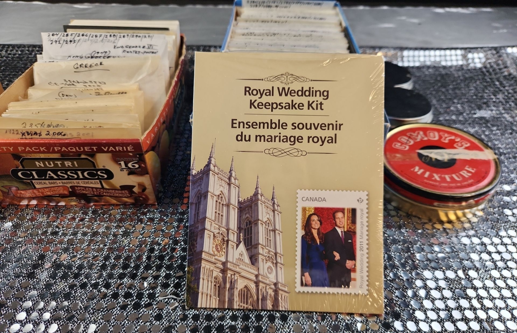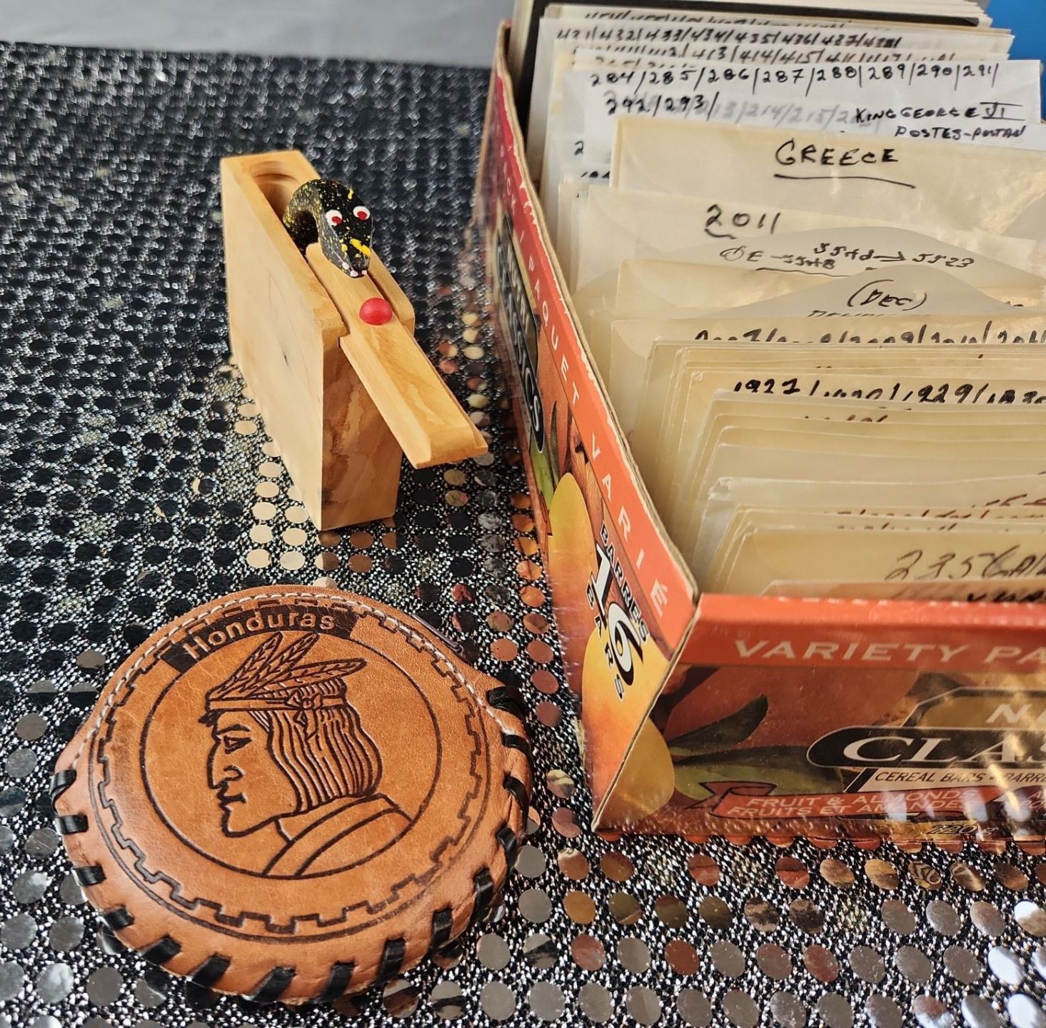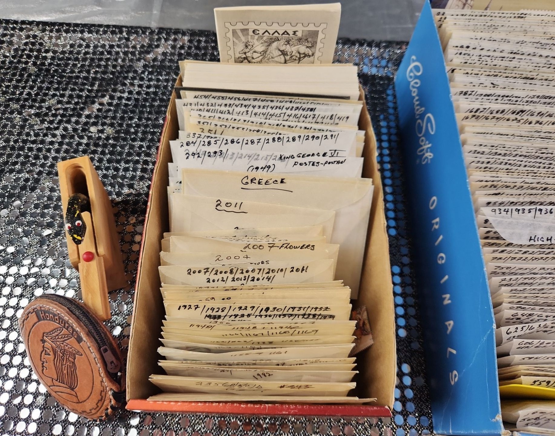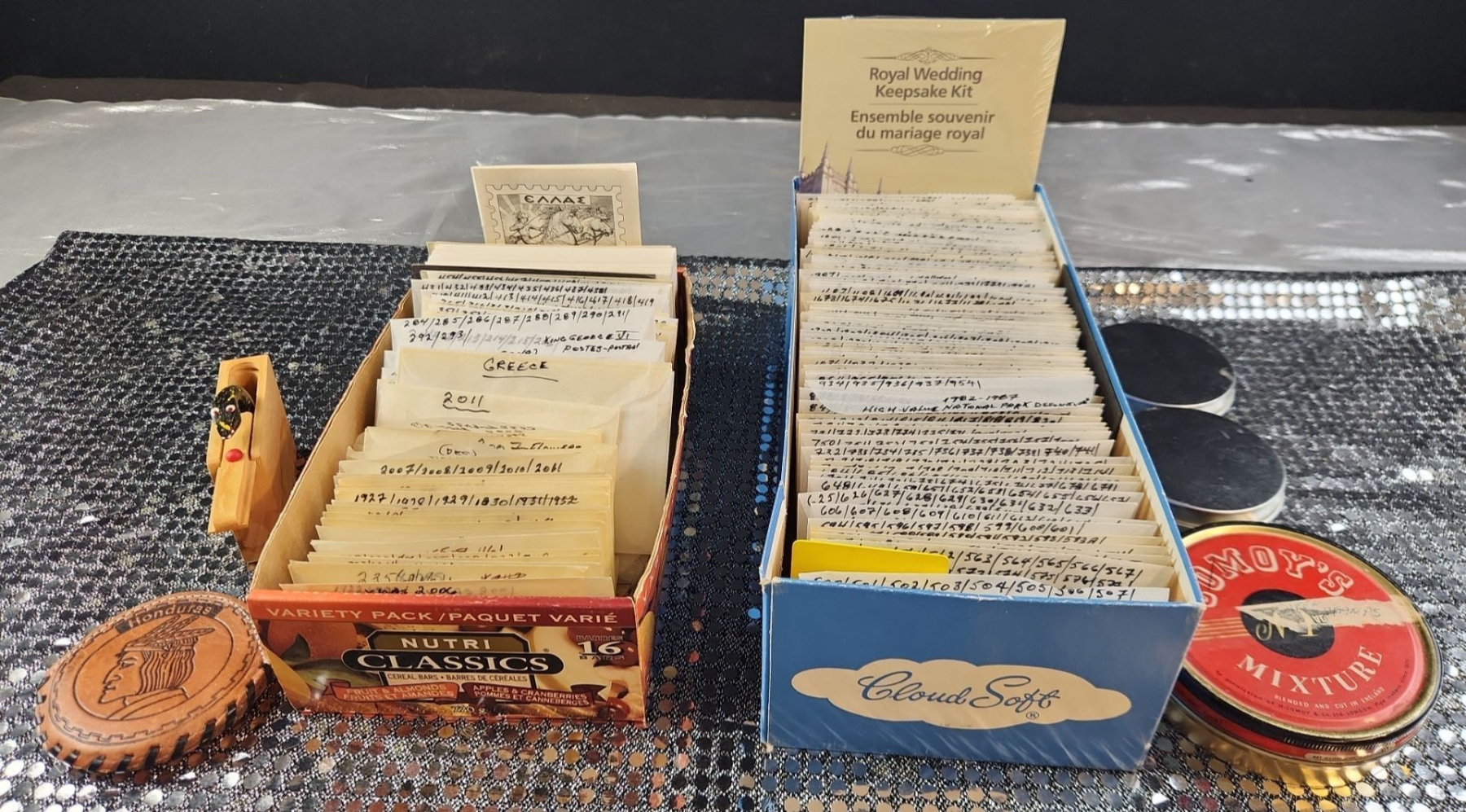 This collection of vintage stamps features items such as "Royal Wedding Keepsake Kit", organized packets of Greek stamps, over various years, King George stamps noted by years in clear envelopes, War Tax stamps, High-Value National Park and Silver Jubilee issues as well as vintage collector tins, a leather Honduras zip-up change purse and wooden snake trinket. All packets are categorized and numbered by the collector.