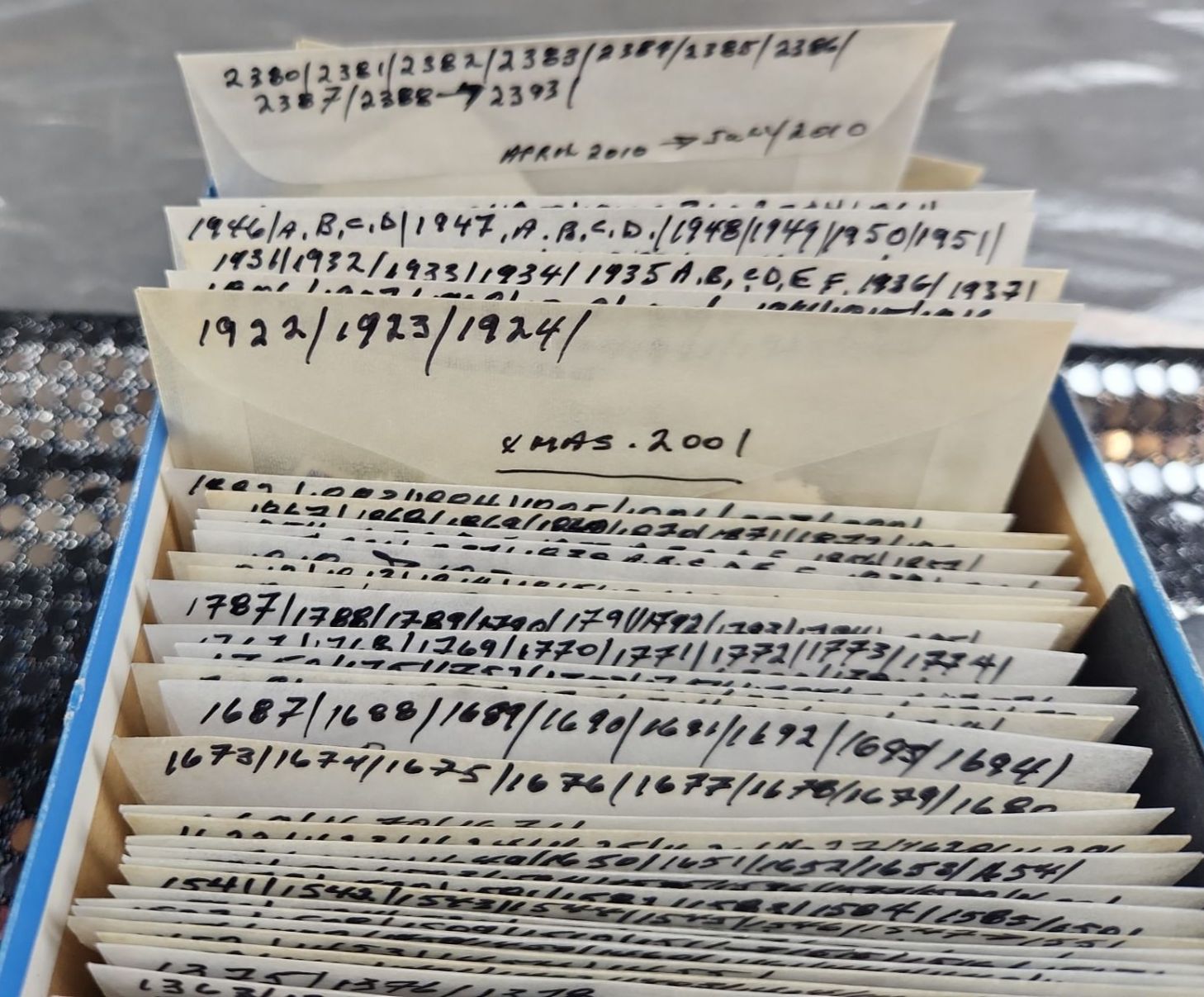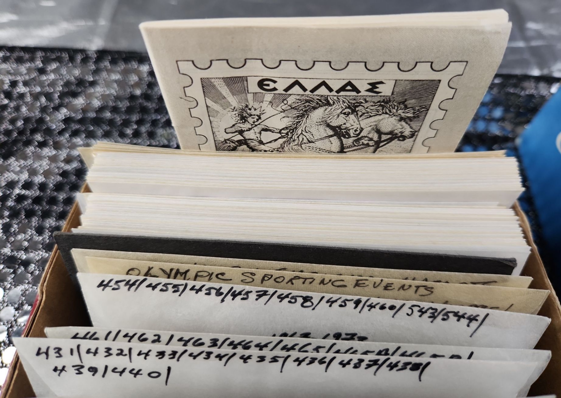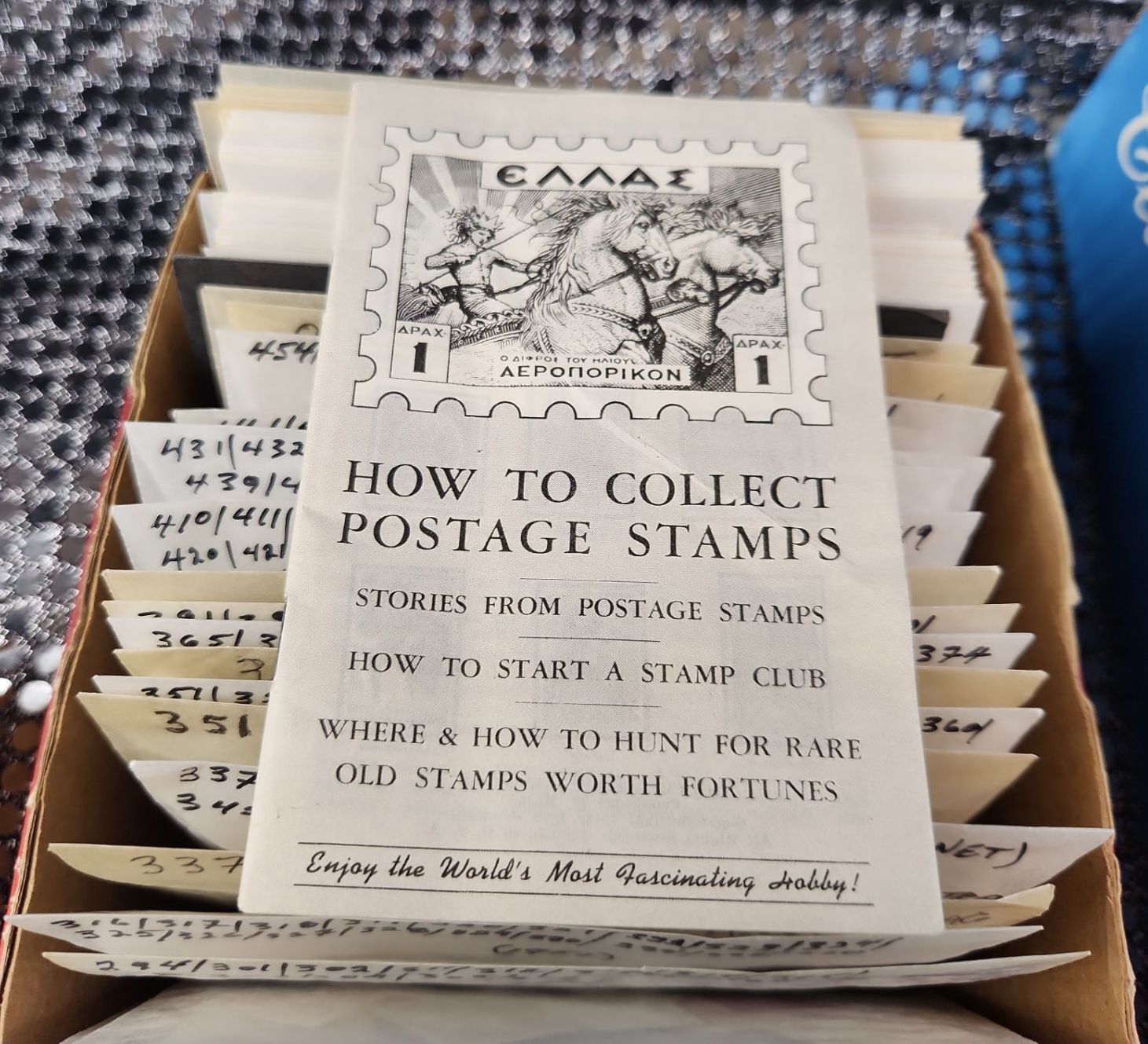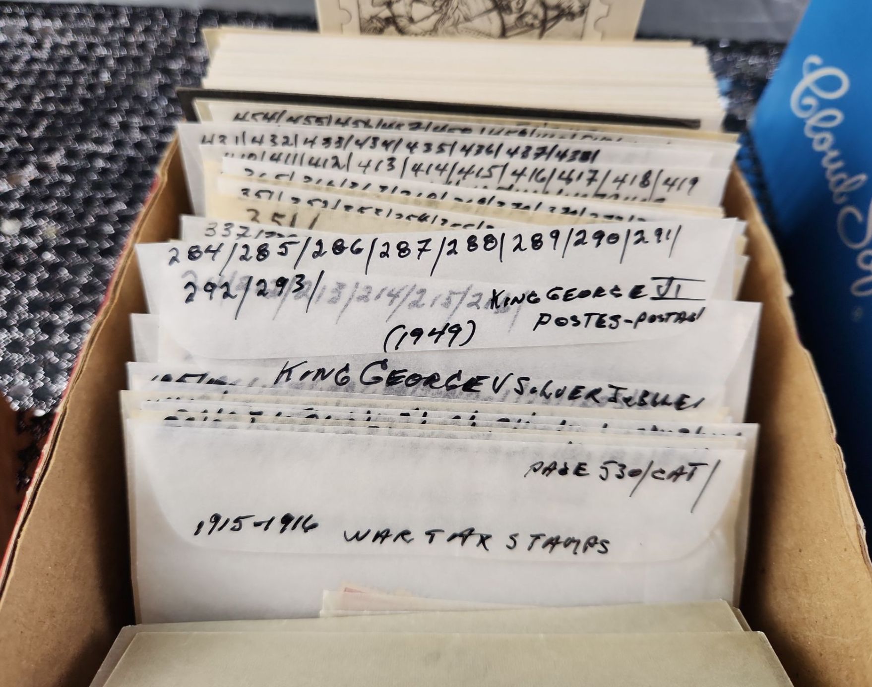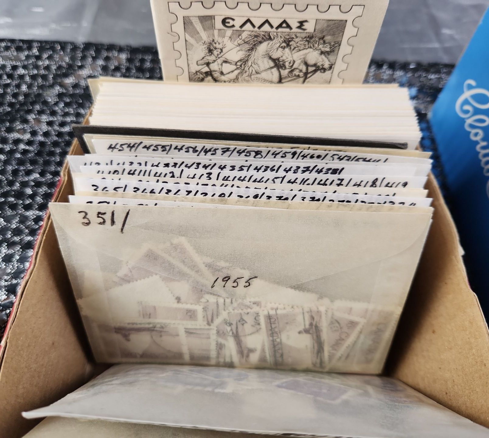 This collection of vintage stamps features items such as "Royal Wedding Keepsake Kit", organized packets of Greek stamps, over various years, King George stamps noted by years in clear envelopes, War Tax stamps, High-Value National Park and Silver Jubilee issues as well as vintage collector tins, a leather Honduras zip-up change purse and wooden snake trinket. All packets are categorized and numbered by the collector.