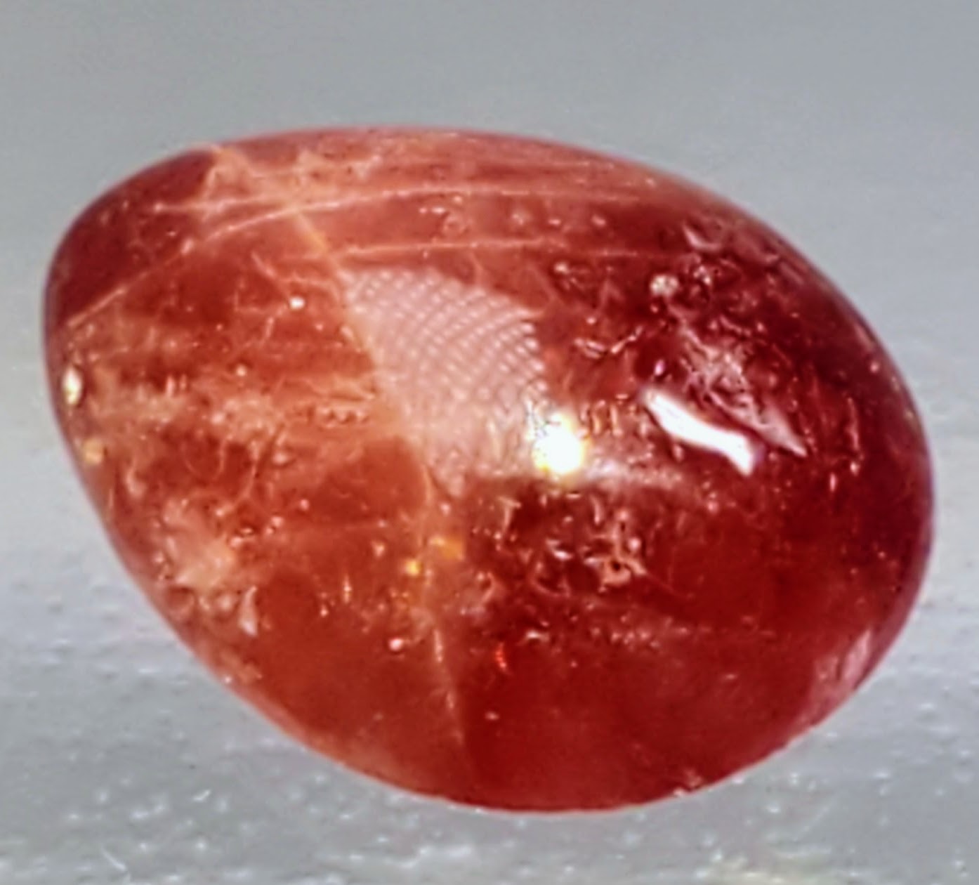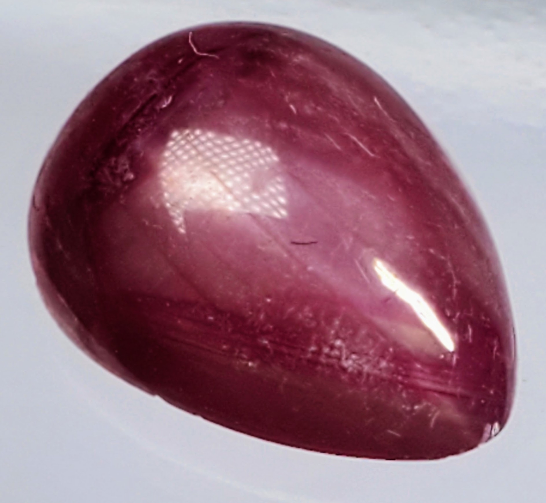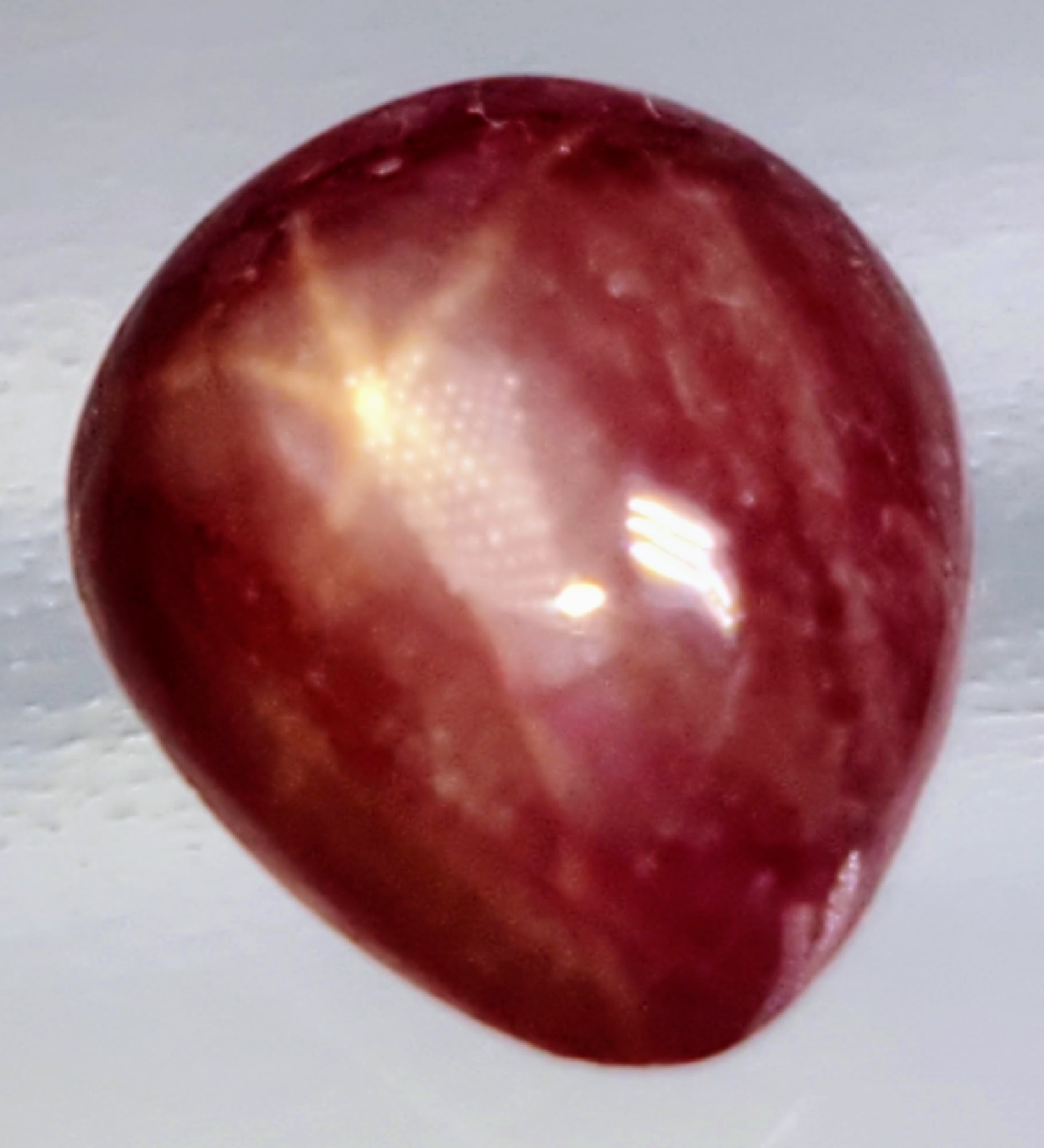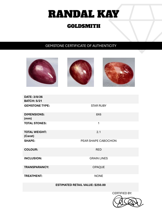 This 2.1-carat pear-shaped star ruby displays a vibrant red color and opaque body. Featuring natural grain line inclusions and an untreated finish, it offers unique character. Estimated retail price is $250.