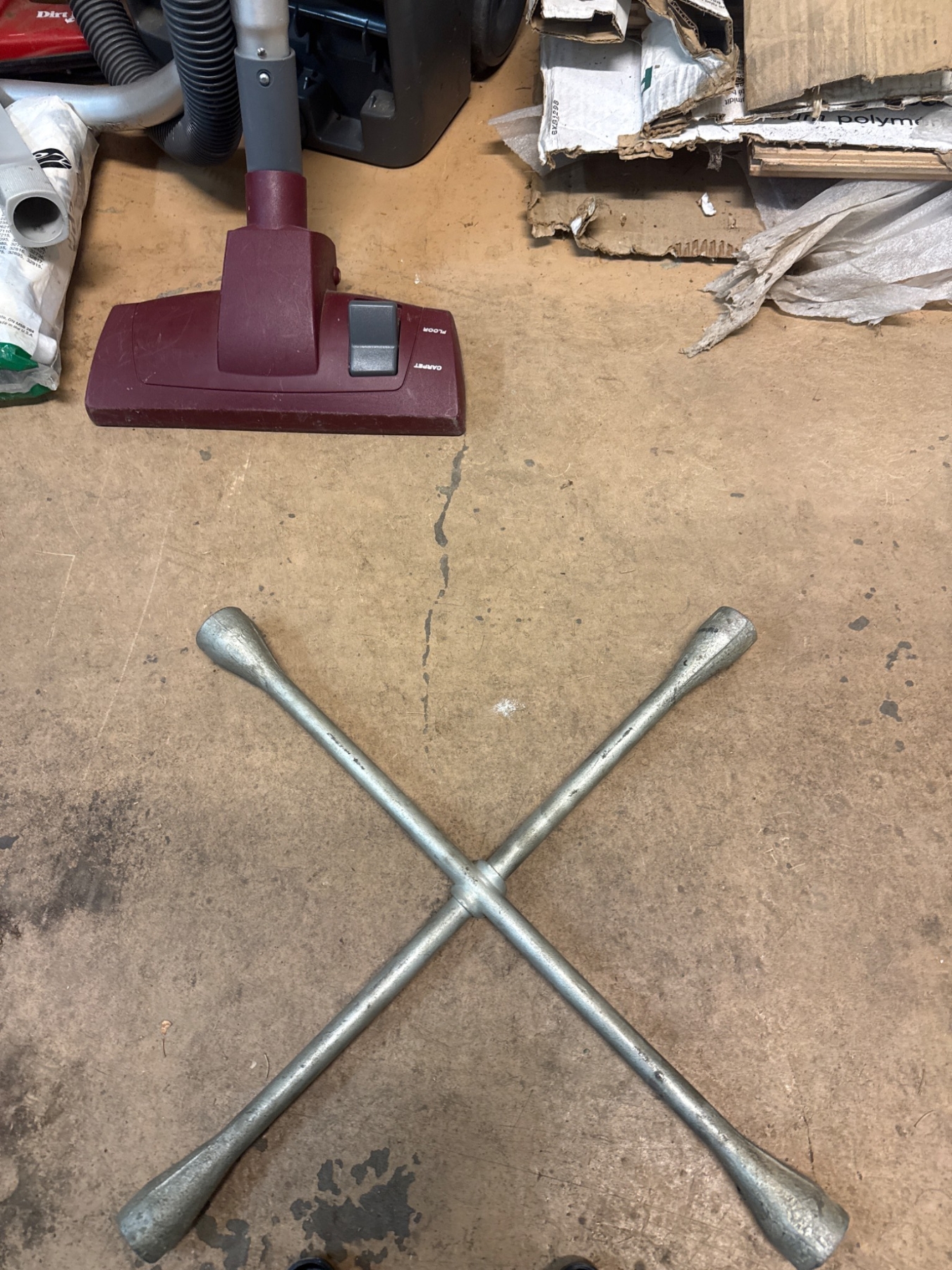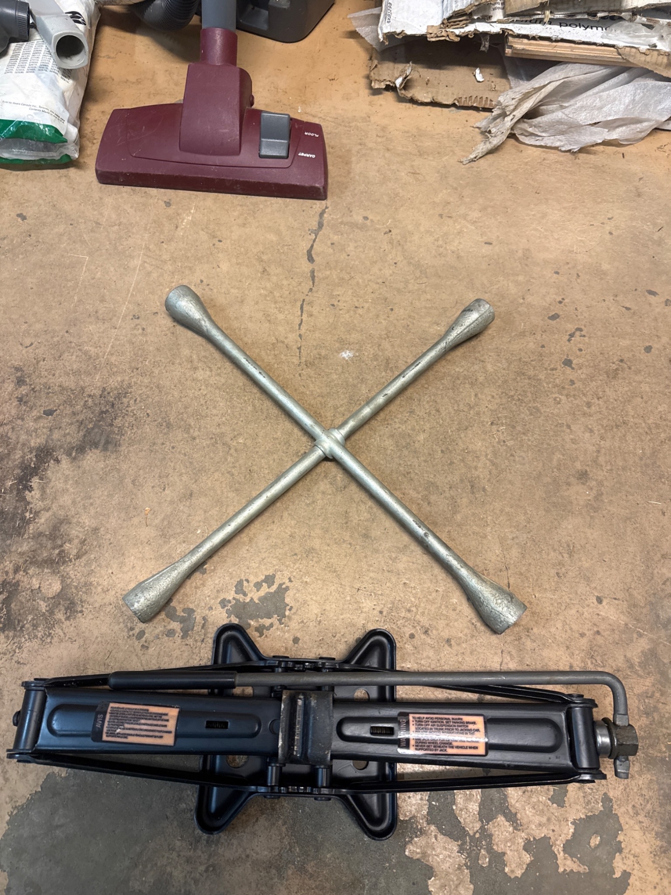 A steel cross wrench measuring approximately 18 inches in length, ideal for loosening or tightening lug nuts, and a compact metal floor jack, approximately 18 inches long when fully closed, suited for lifting vehicles. Both items show signs of prior use, consistent with automotive utility. Designed for durability and essential for car maintenance needs.